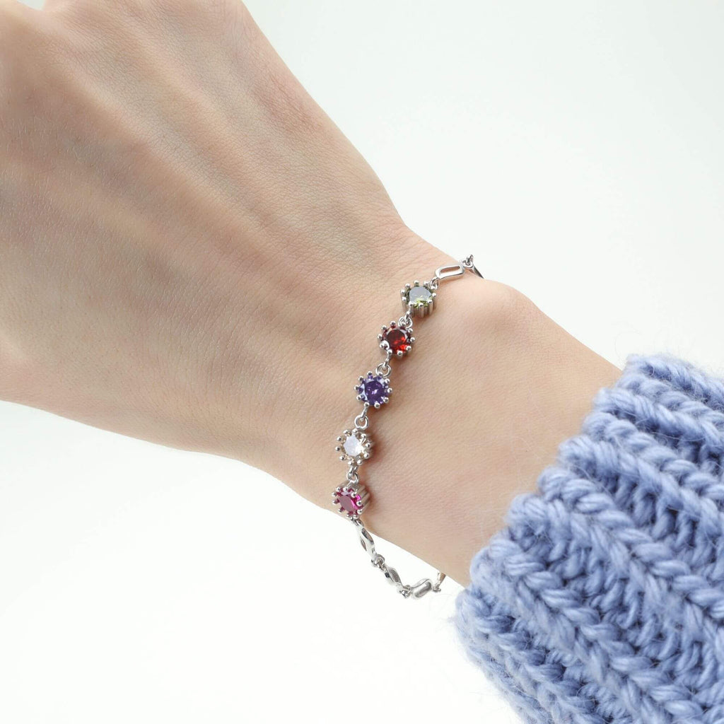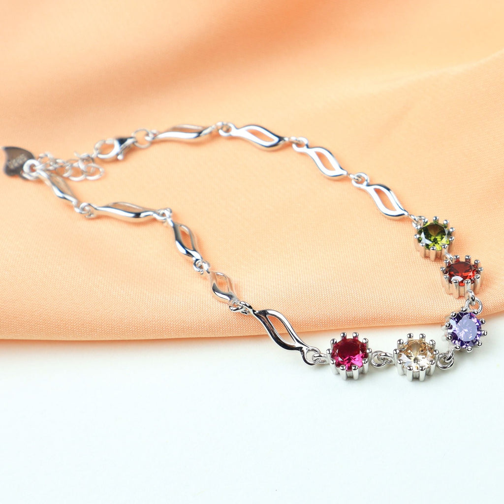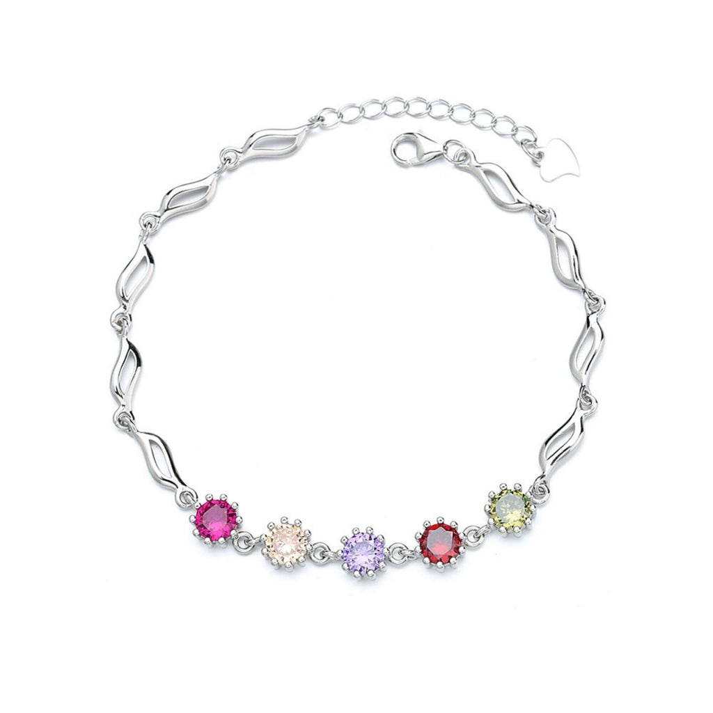 Ontdek de allure van onze zilveren armband, waarbij massieve elementen een betoverend verweven kettingontwerp vormen. Het middelpunt schittert met een spectrum van veelkleurige zirkonia's, die een zachte, boeiende gloed uitstralen, perfect om een vleugje helderheid en complexiteit toe te voegen aan je polskleding.
