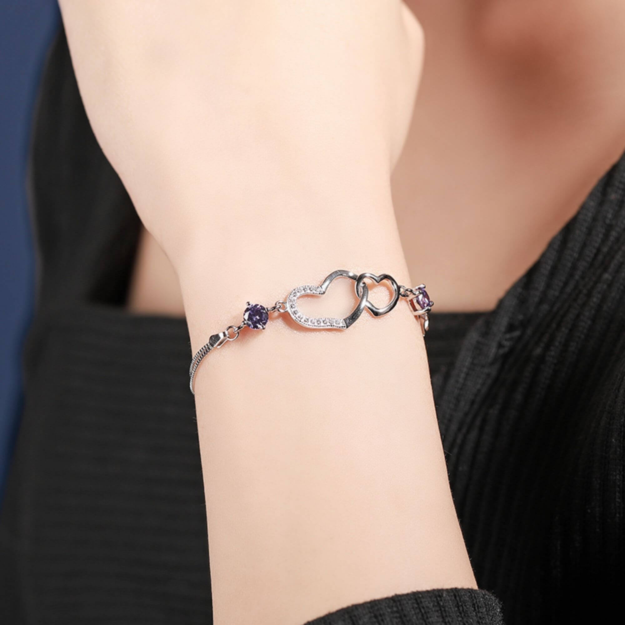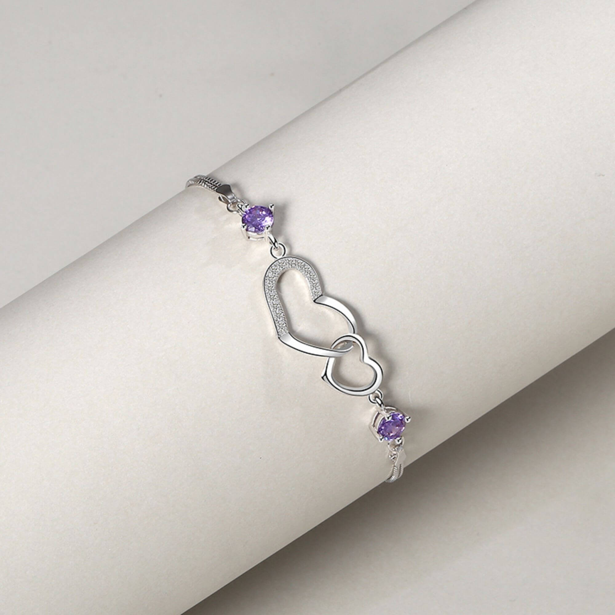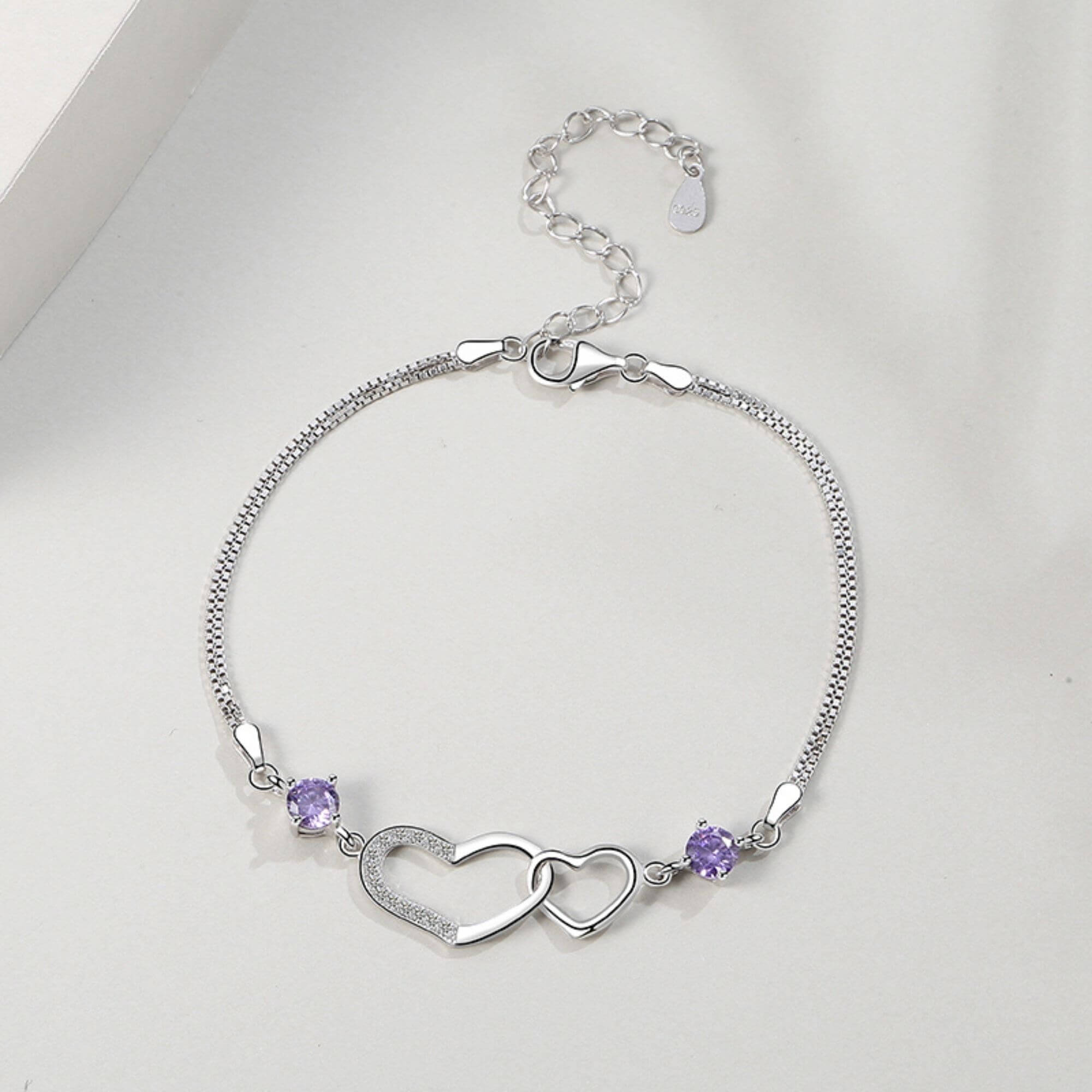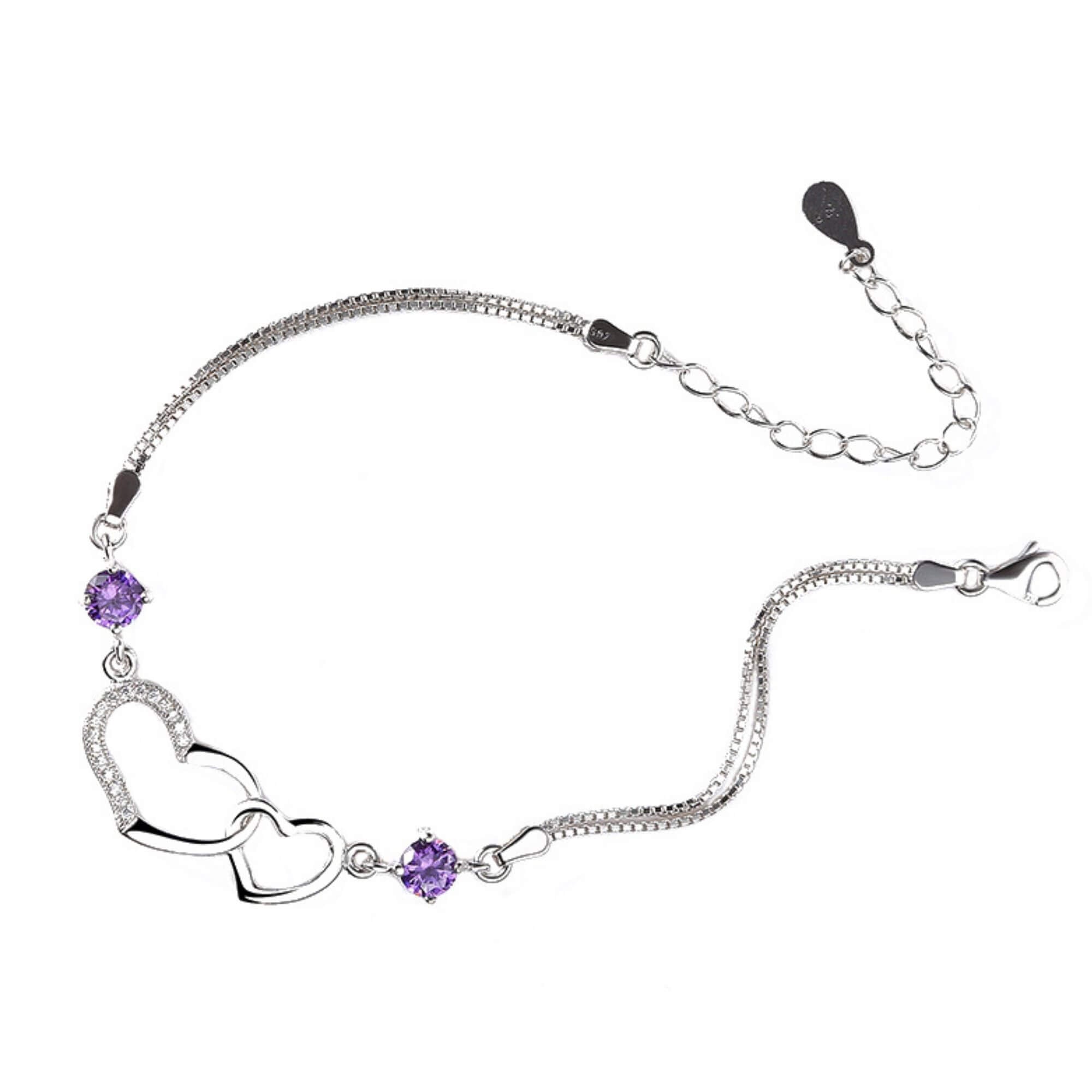 Geniet van de pracht van onze sterlingzilveren armband, meesterlijk gemaakt met dubbele Venetiaanse kettingen en verfraaid met stralende paarse kristallen. Het middelpunt, met in elkaar verweven harten, symboliseert liefde en eenheid. Het voortreffelijke vakmanschap en de aandacht voor detail van deze armband verheffen hem tot een waar kunstwerk, dat resoneert met symboliek en elegantie.