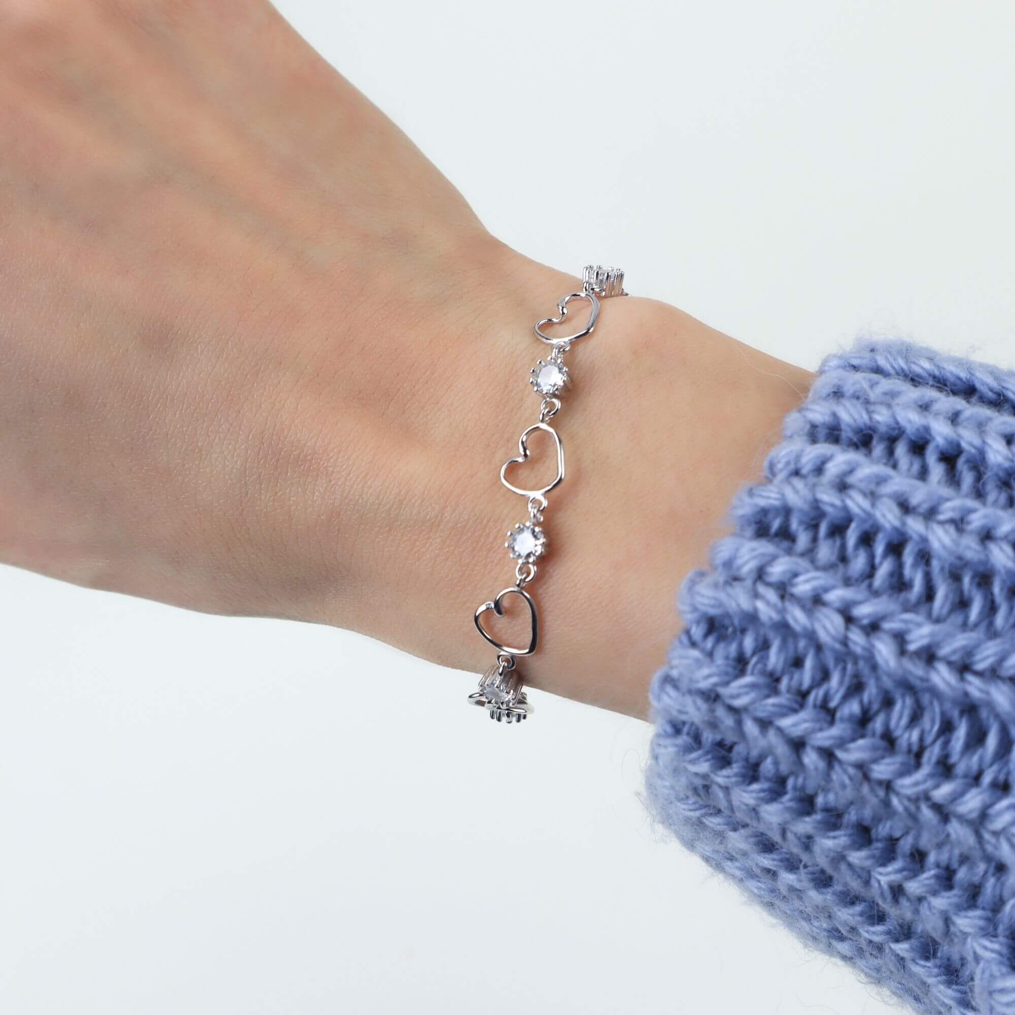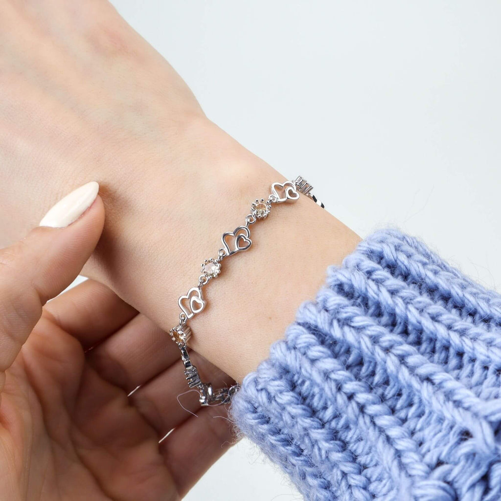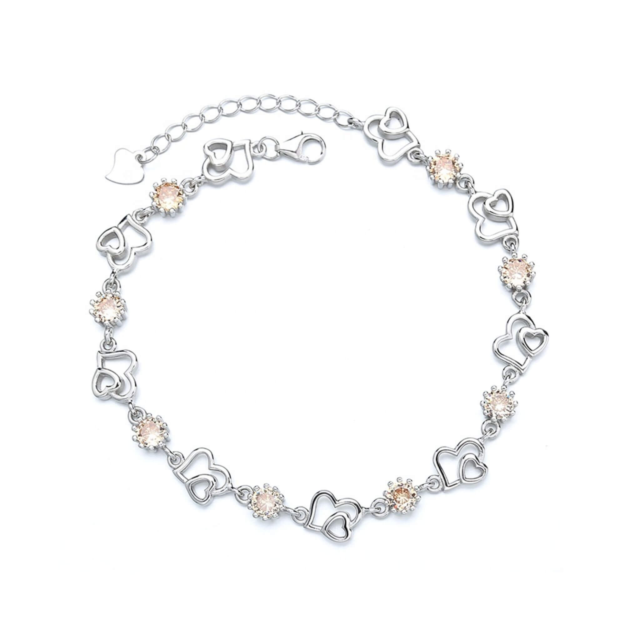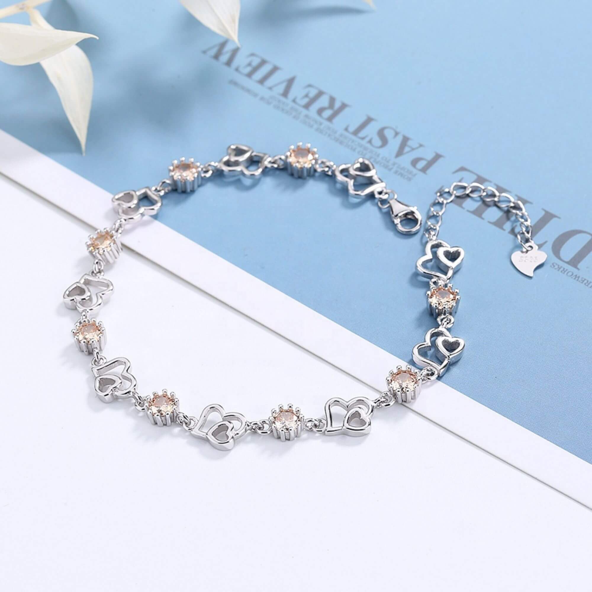 Ervaar de mix van genegenheid en warmte met onze zilveren armband, met samengevoegde harten en zachte oranje stenen. De onderling verbonden harten symboliseren een diepe verbinding, terwijl de zachte oranje tinten een levendige vonk toevoegen. Dit stuk is een viering van liefde en warmte en is ideaal voor romantische gelegenheden en vreugdevolle momenten.
