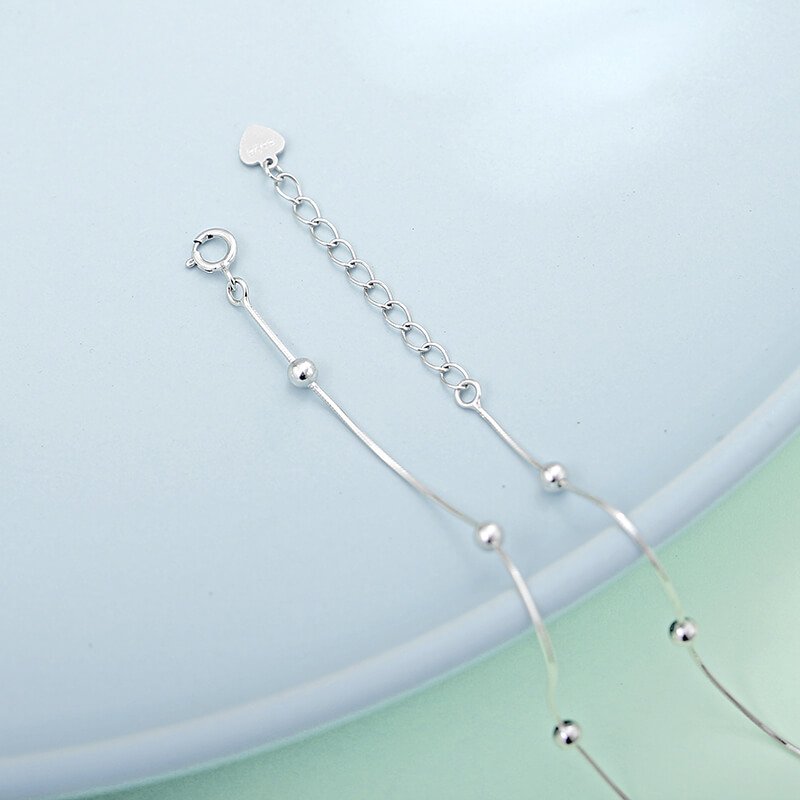 Stap de zomer in met ons elegante zilveren enkelbandje, voorzien van een strakke ketting en zeven subtiele kralen. Dit ontwerp biedt een comfortabele en chique toevoeging aan warme zomeravonden, belichaamt de zorgeloze sfeer van het seizoen en voegt speelsheid toe aan je kleding.