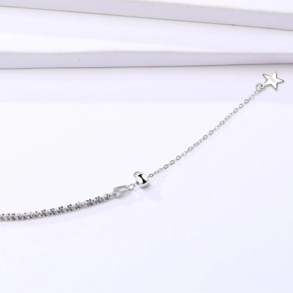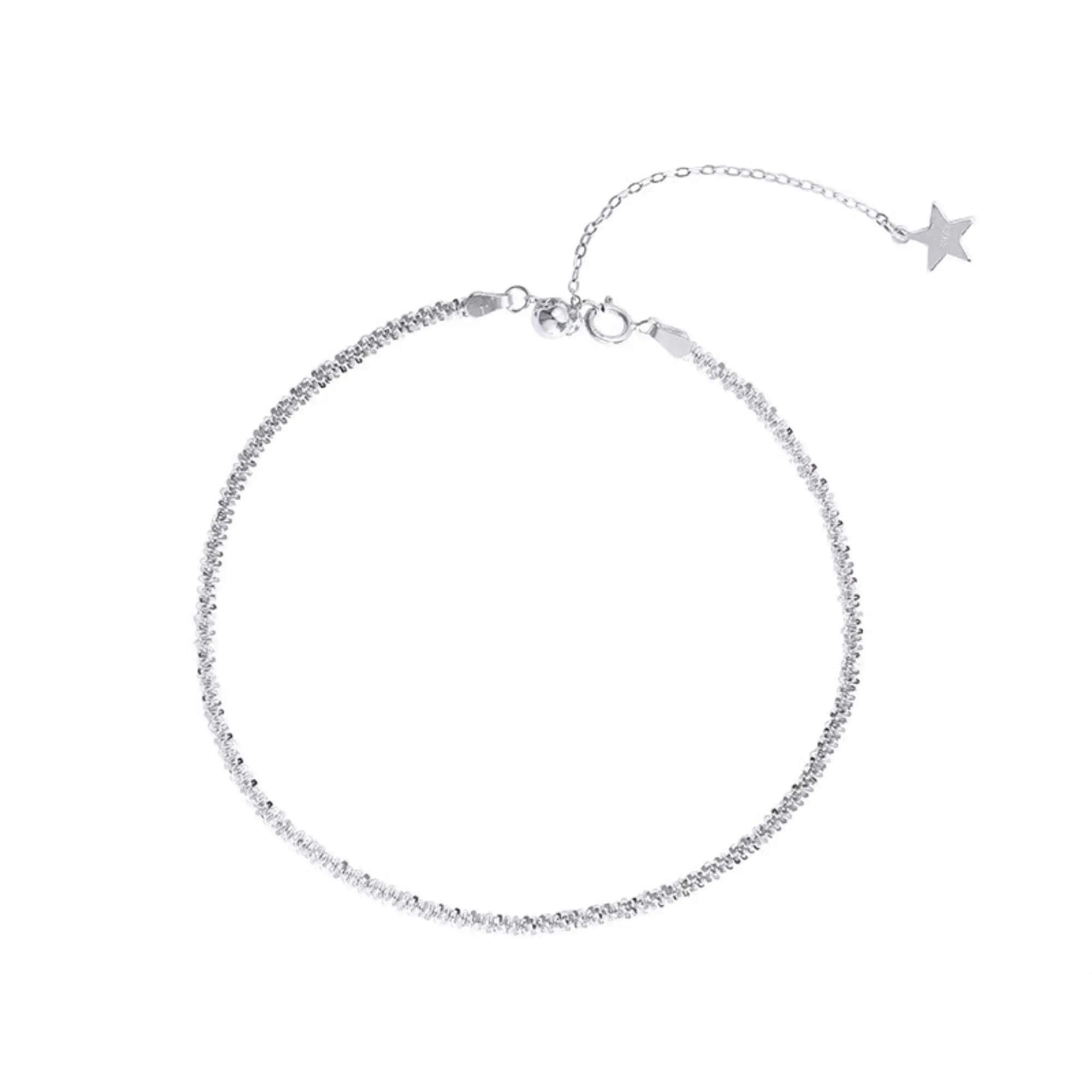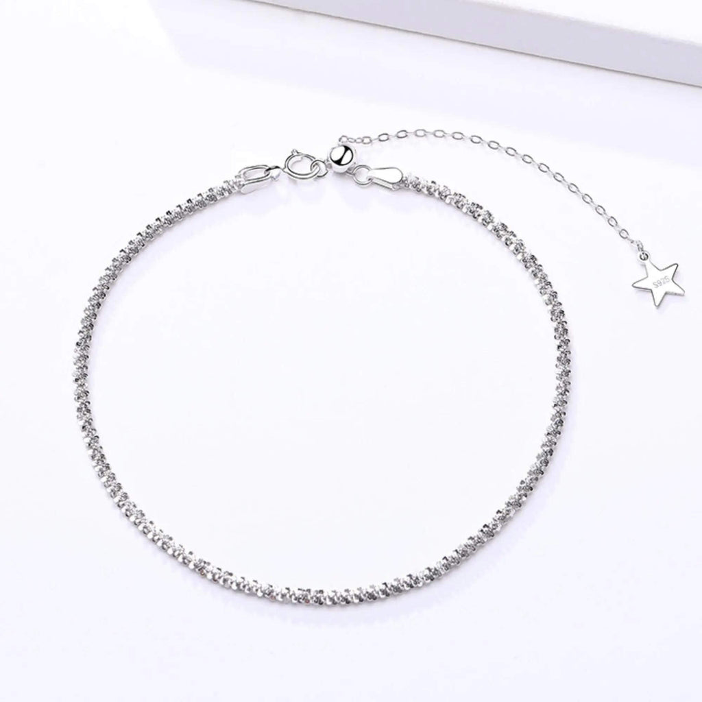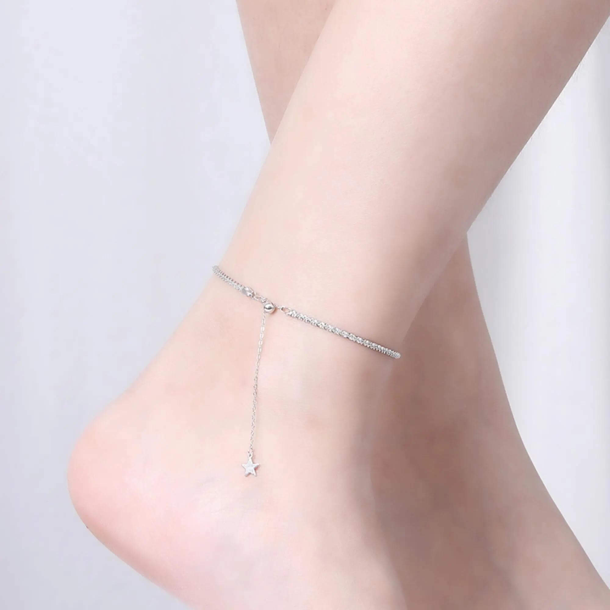 Stap in hemelse elegantie met dit unieke zilveren enkelbandje. Het ingewikkelde gevlochten ontwerp en de stervormige hanger maken het tot een opvallend accessoire. De verstelbare functie zorgt voor een comfortabele pasvorm, waardoor het essentieel is om je zomerstijl op te fleuren en een vleugje sterren toe te voegen aan elke stap.