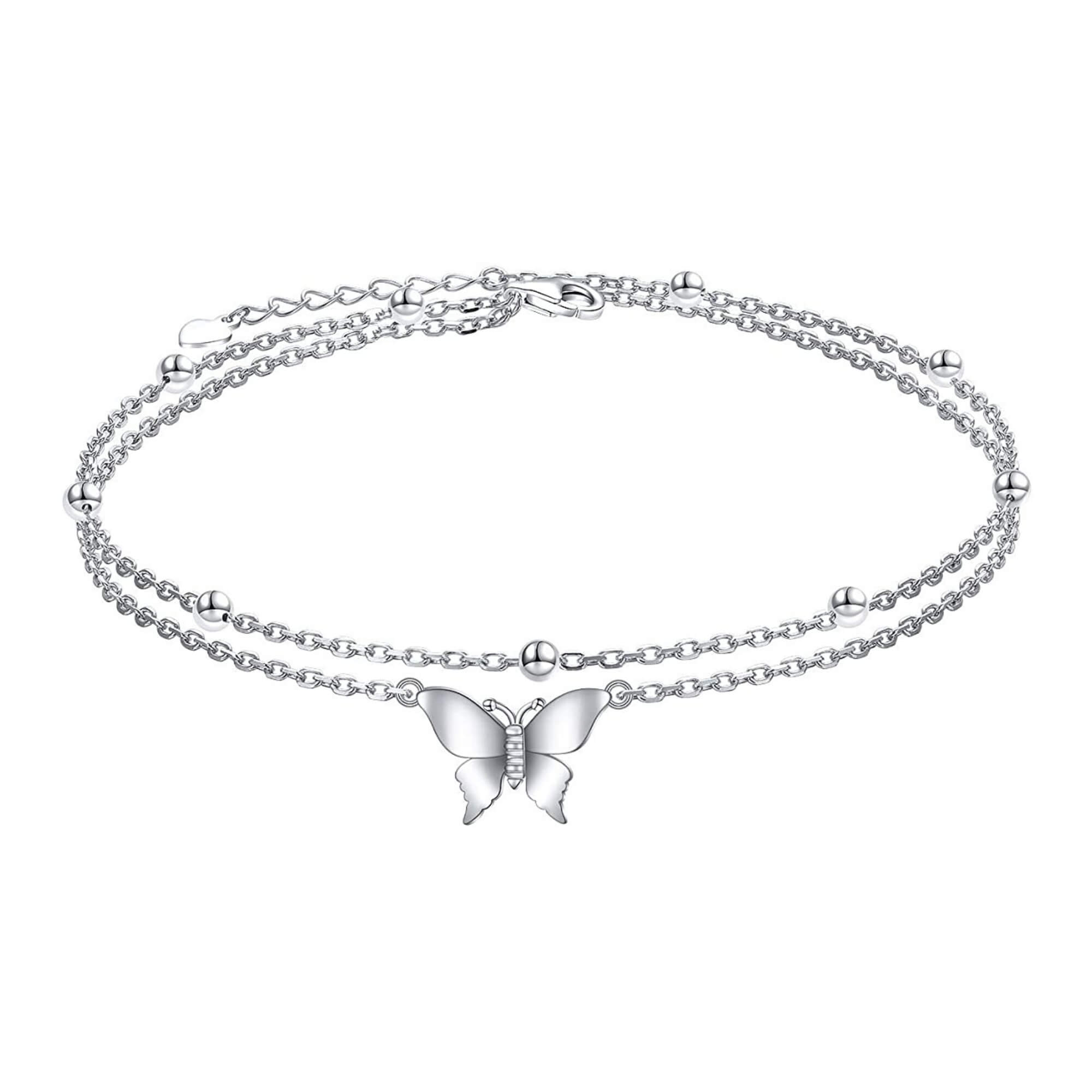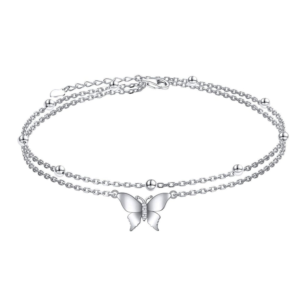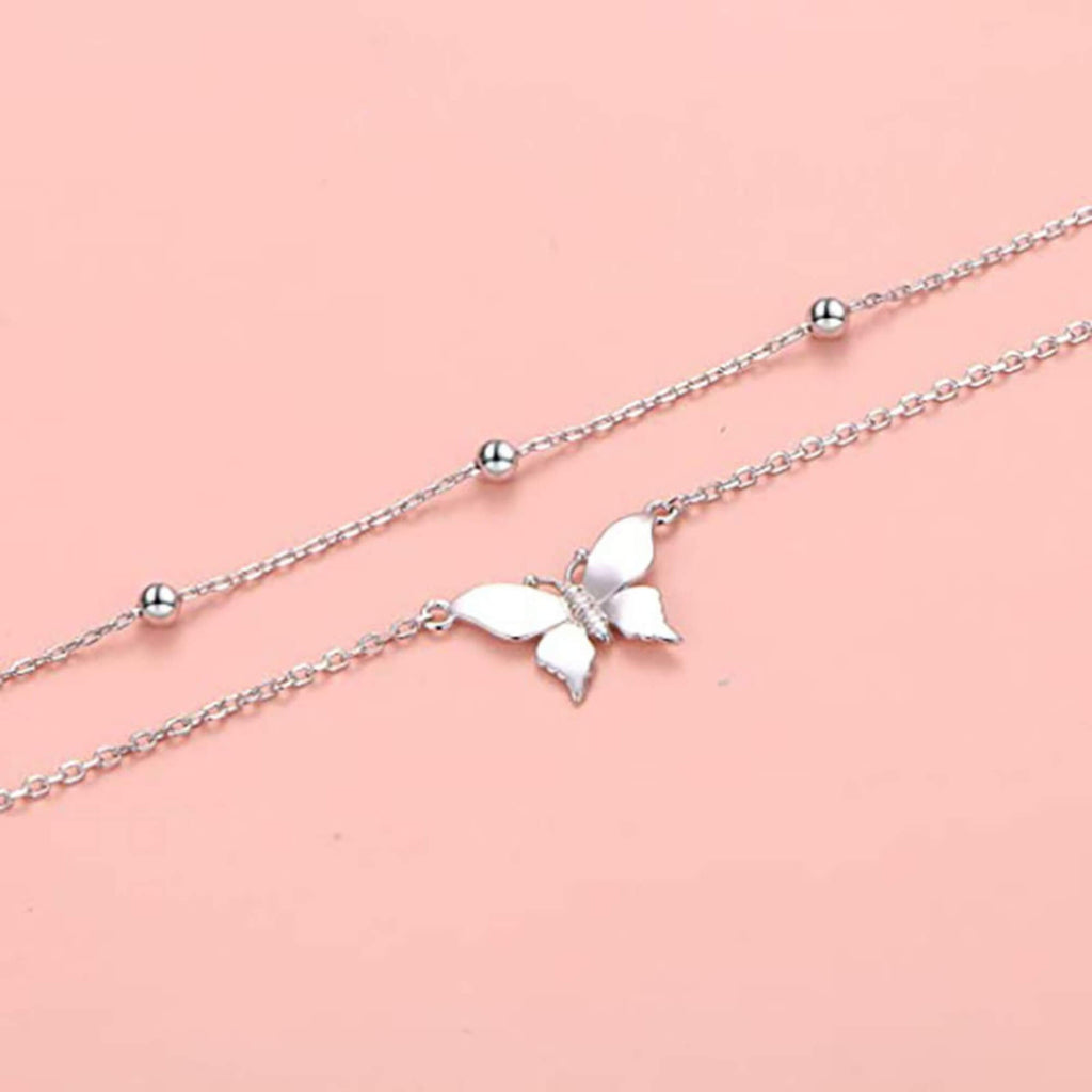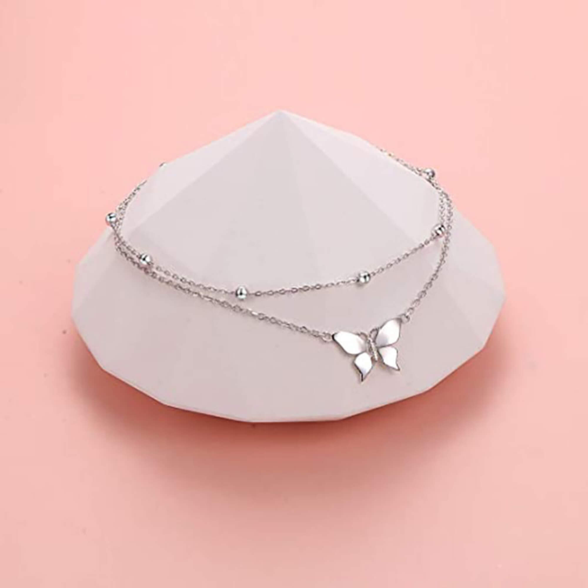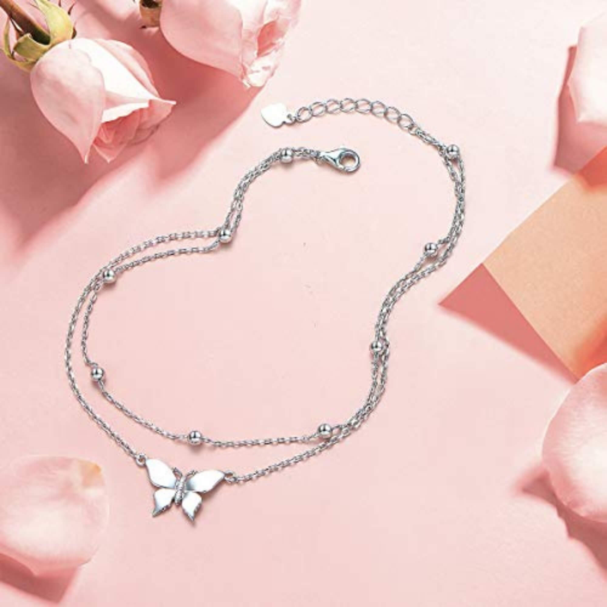 Prachtig dubbel zilveren enkelbandje, elegant versierd met delicate kralen. De charmante vlinderhanger in het midden voegt vrouwelijke gratie toe aan dit boeiende ontwerp. Dit enkelbandje is perfect voor strandwandelingen of luchtige zomerdagen en vult je look aan met verfijning en stijl.