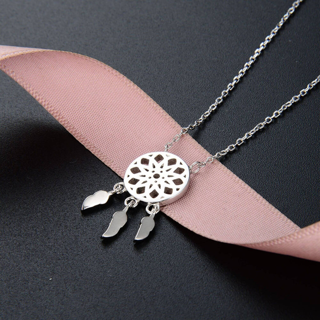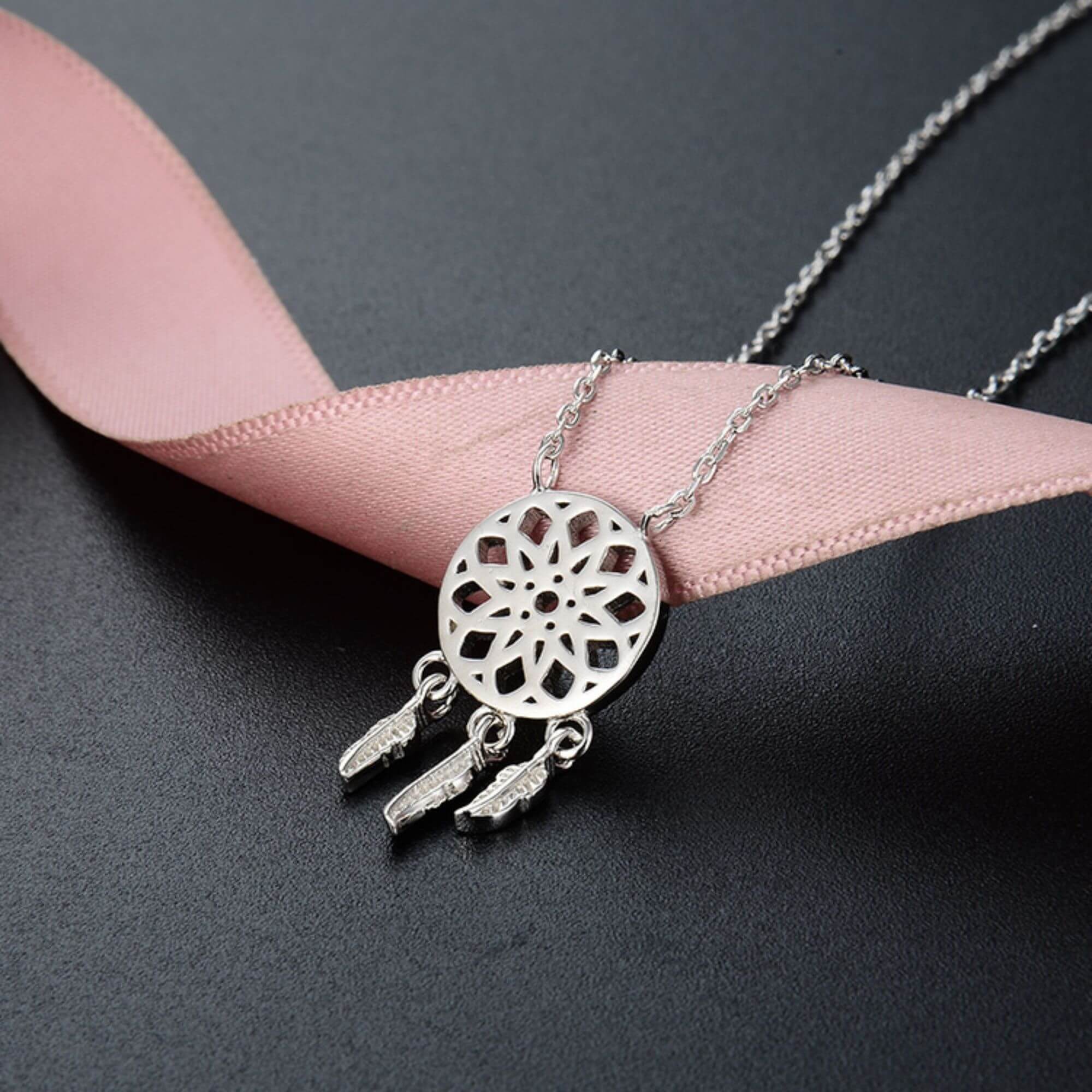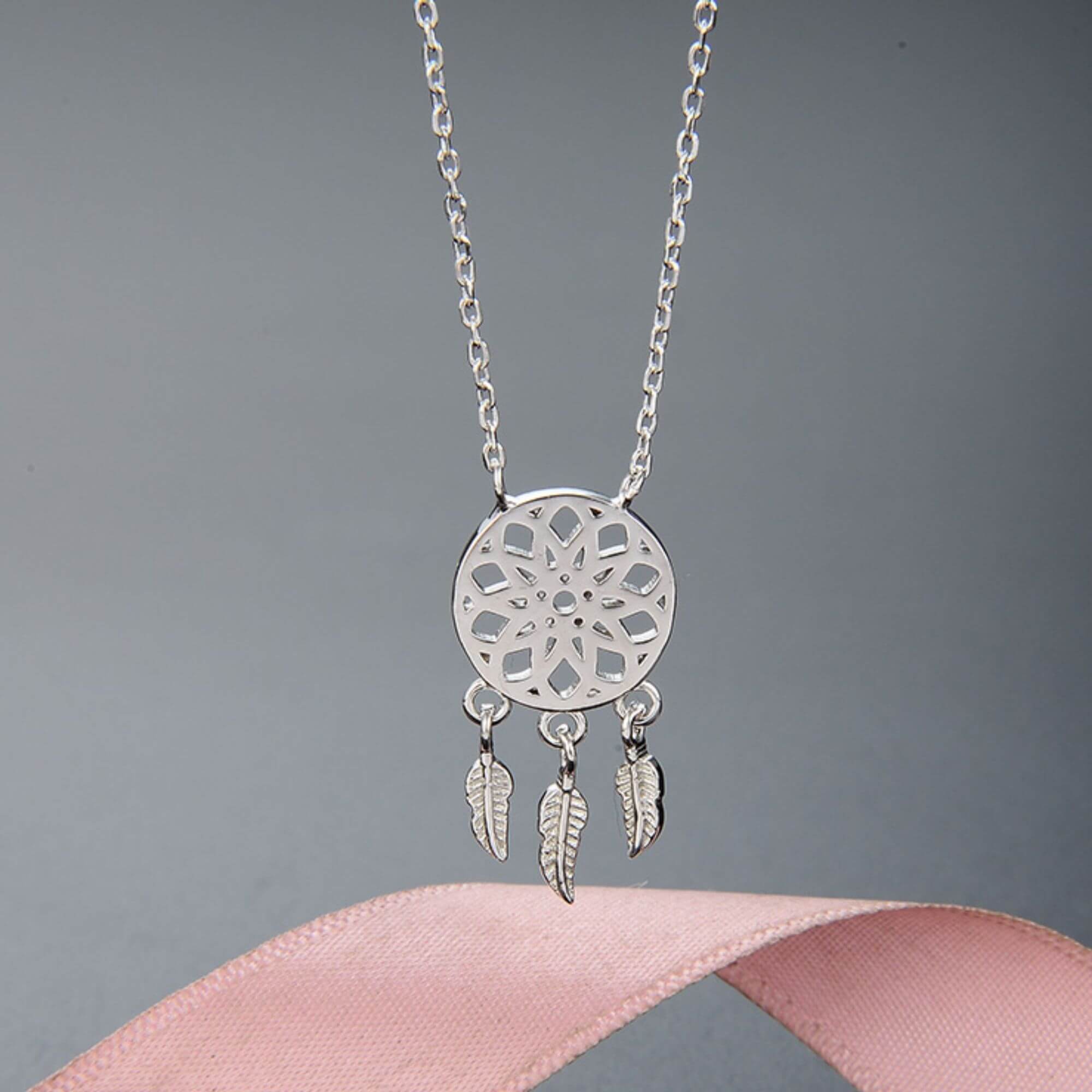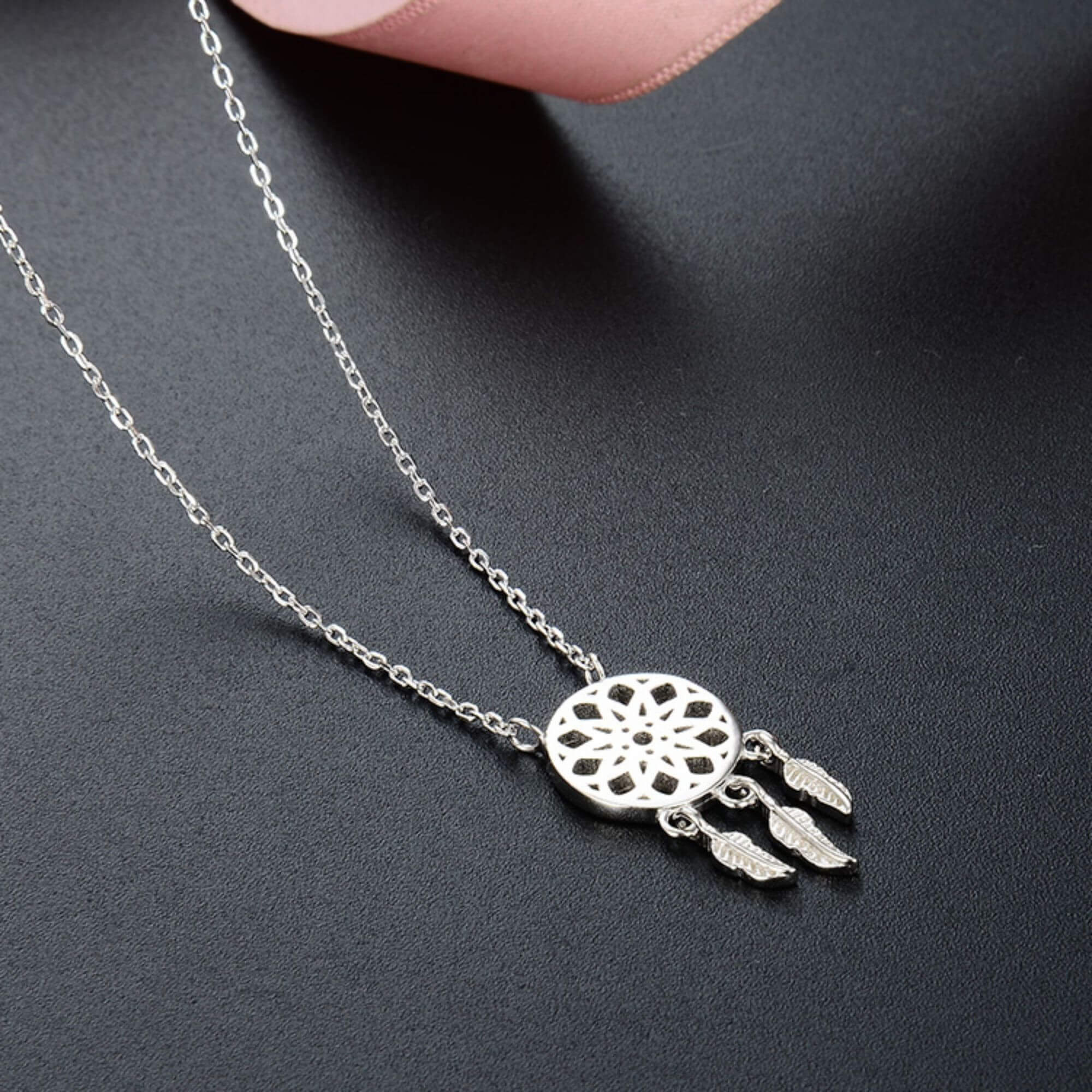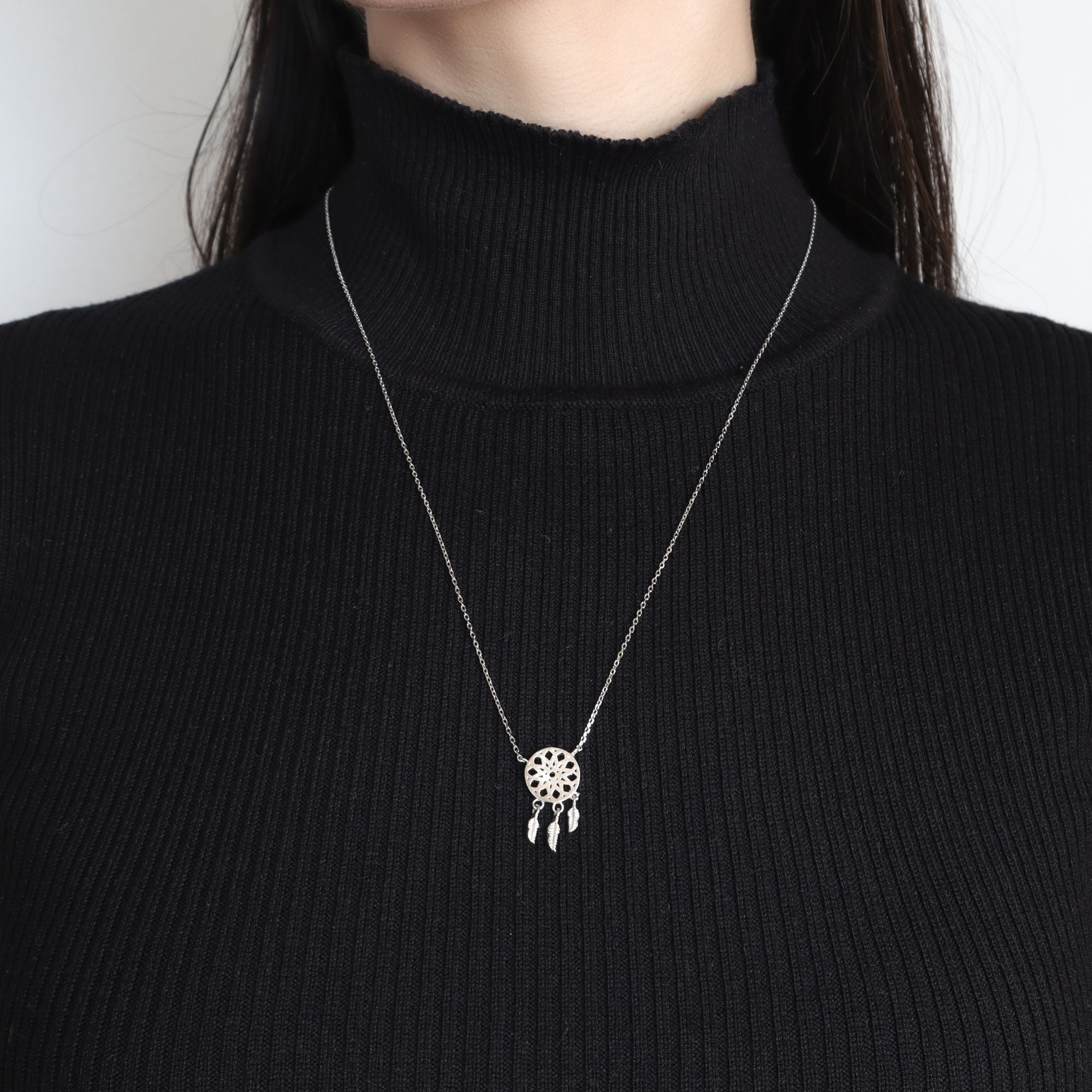 Mooie zilveren ketting versierd met een boeiende dromenvangerhanger die de symbolische cyclus van het leven belichaamt en waarvan wordt aangenomen dat deze positieve energie kanaliseert. Deze veelzijdige en moeiteloos chique ketting past bij elke outfit, waardoor het een geweldige aanvulling is op je sieradencollectie. Je kunt hem gemakkelijk met andere kledingstukken dragen, zodat je verbluffende combinaties kunt creëren die jouw unieke stijl weerspiegelen.