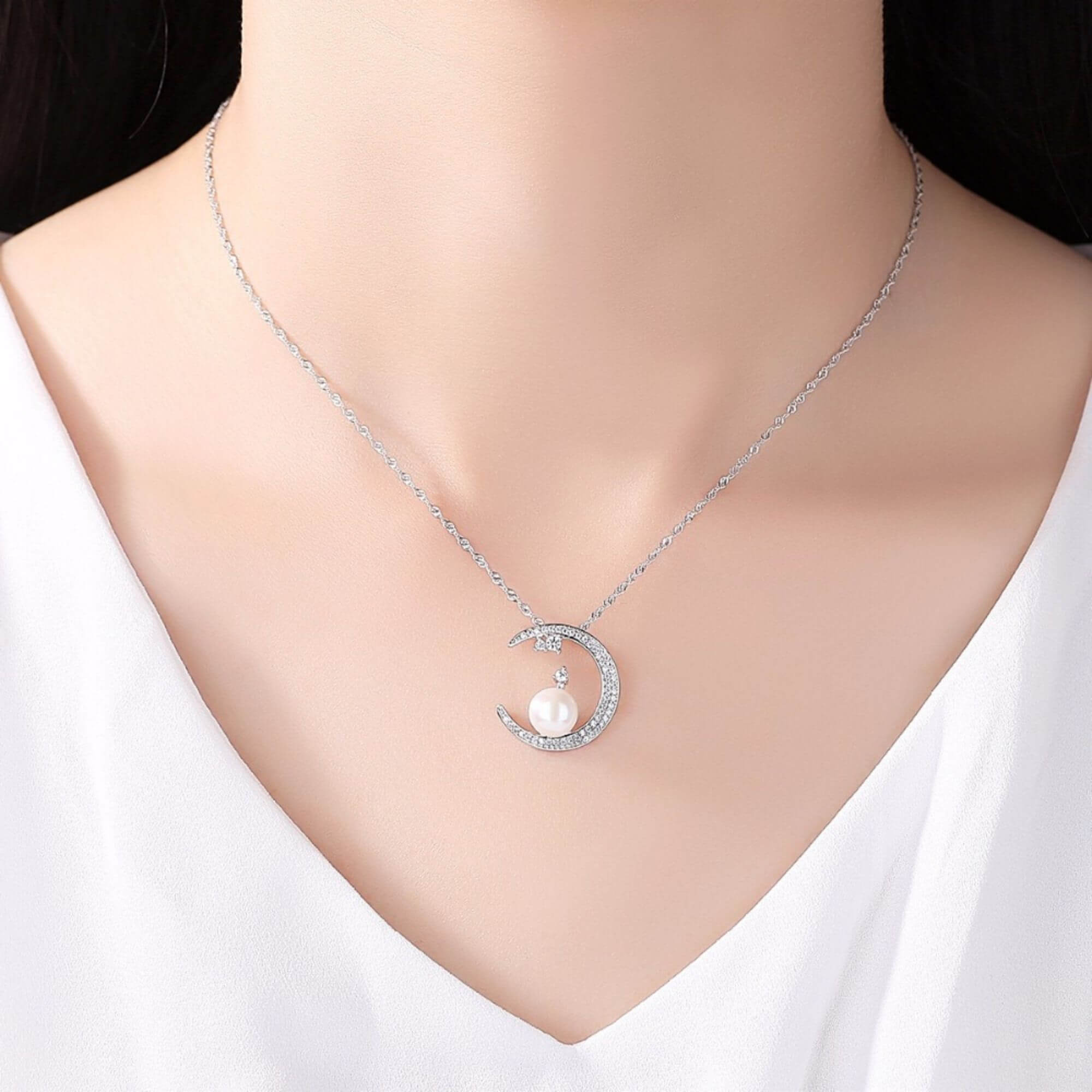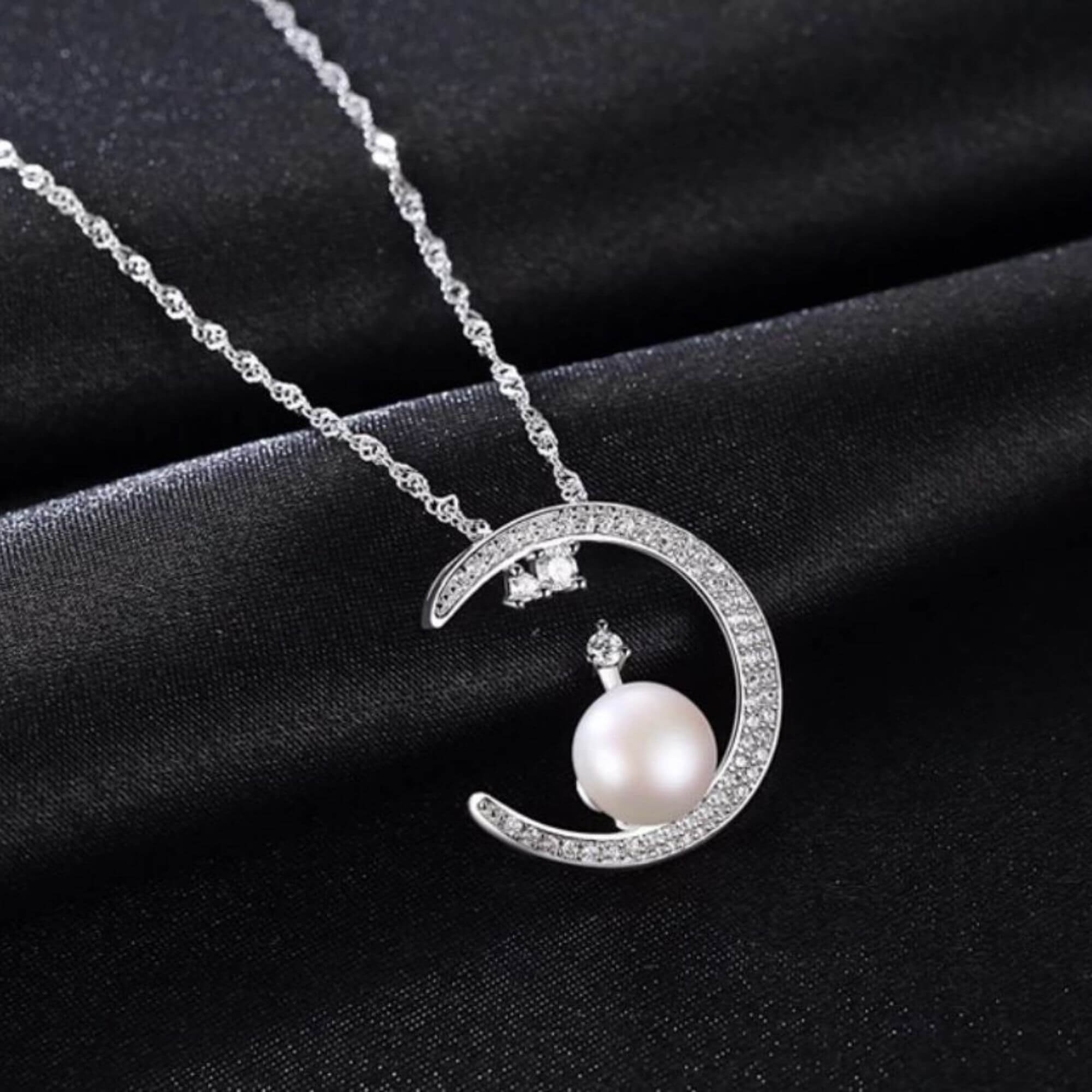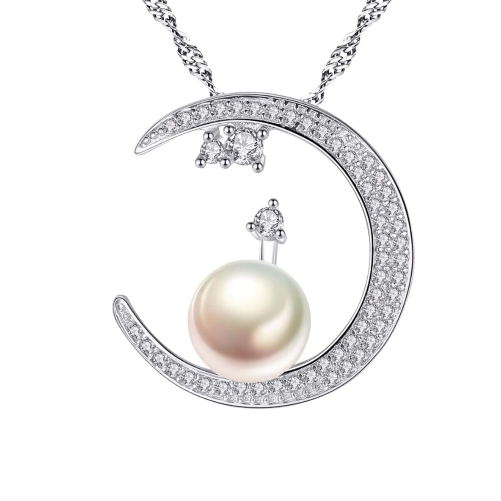 Deze prachtige zilveren ketting toont de tijdloze elegantie van de parel naast de oogverblindende schittering van zirkonia. De hanger, met een delicaat maansikkelontwerp, is op ingewikkelde wijze verweven met een opvallende ketting. Versierd met tientallen fonkelende stenen, vangt dit stuk prachtig het licht op en voegt een subtiele maar betoverende schittering toe aan je look, perfect voor degenen die een mix van klassieke charme en eigentijdse flair waarderen.