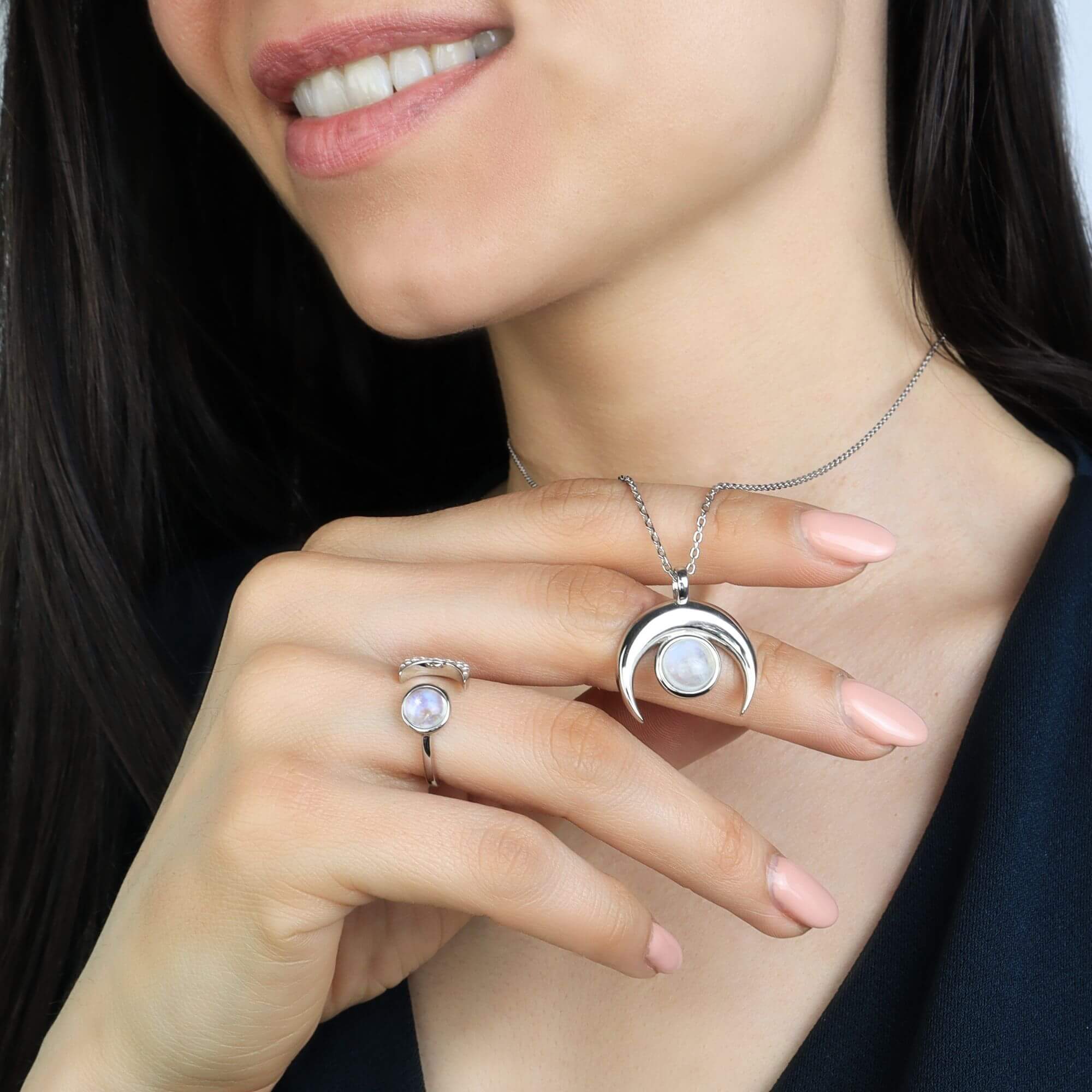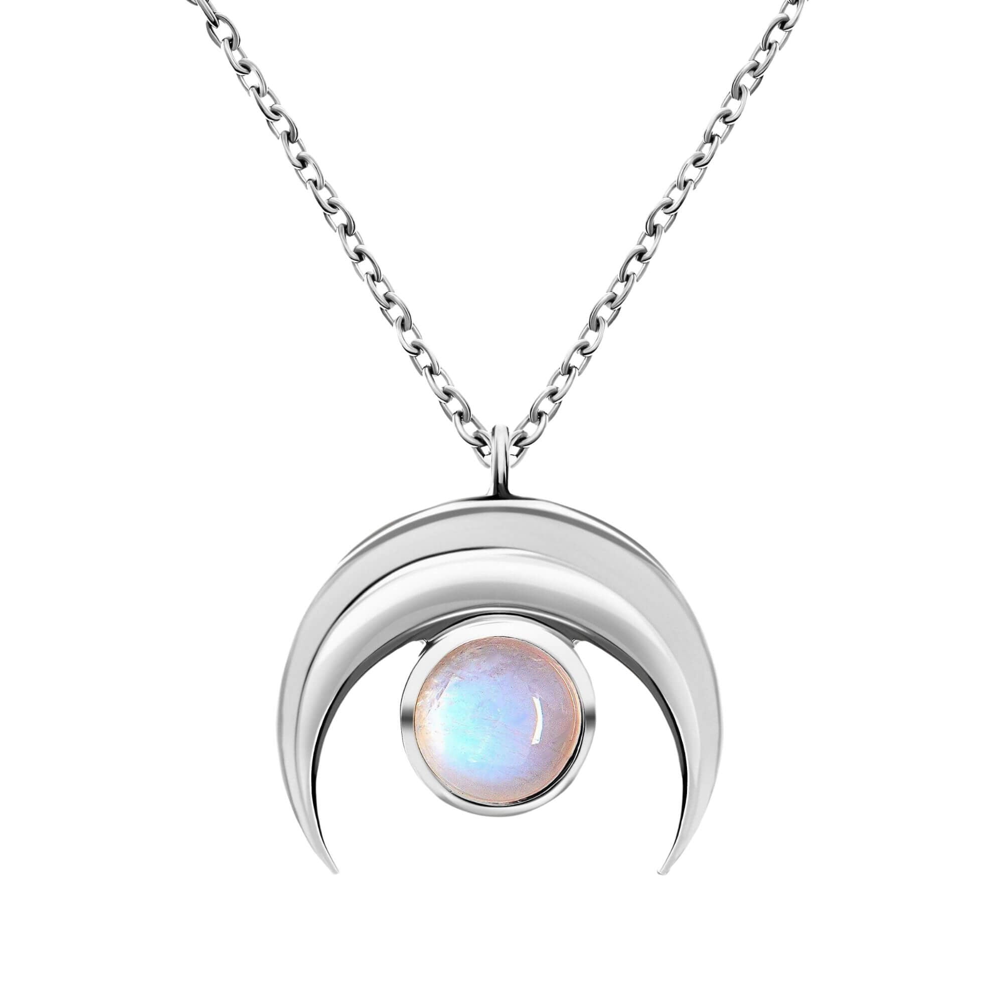 Deze zilveren ketting, met zijn hemelse charme, vangt de mystiek van de maan. De maansikkelhanger, versierd met een ronde, natuurlijke maansteen van AA+ kwaliteit, is een unieke creatie. Het belichaamt de magie van de maan met elke ronding en glans, waardoor een buitenaardse elegantie aan je stijl wordt toegevoegd.