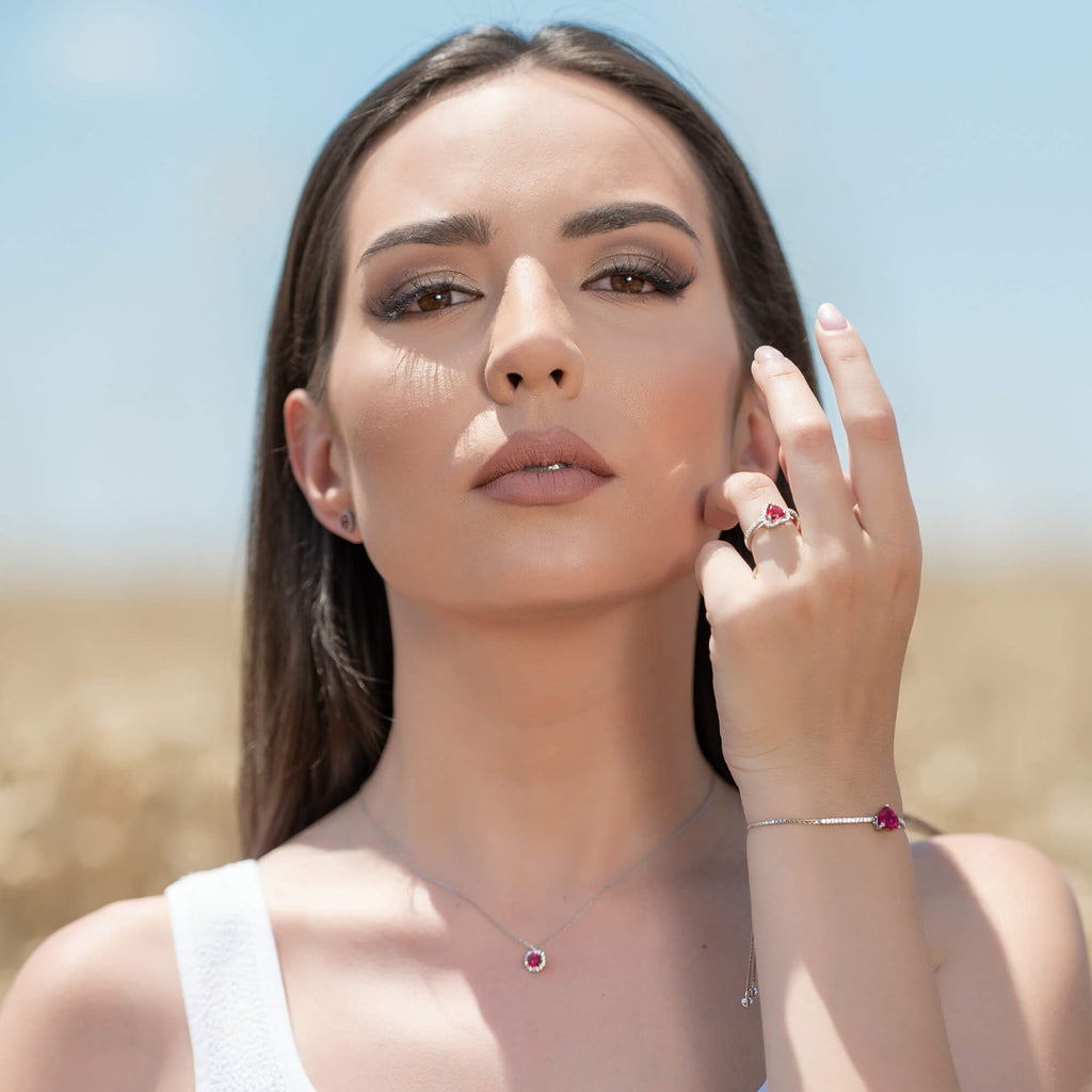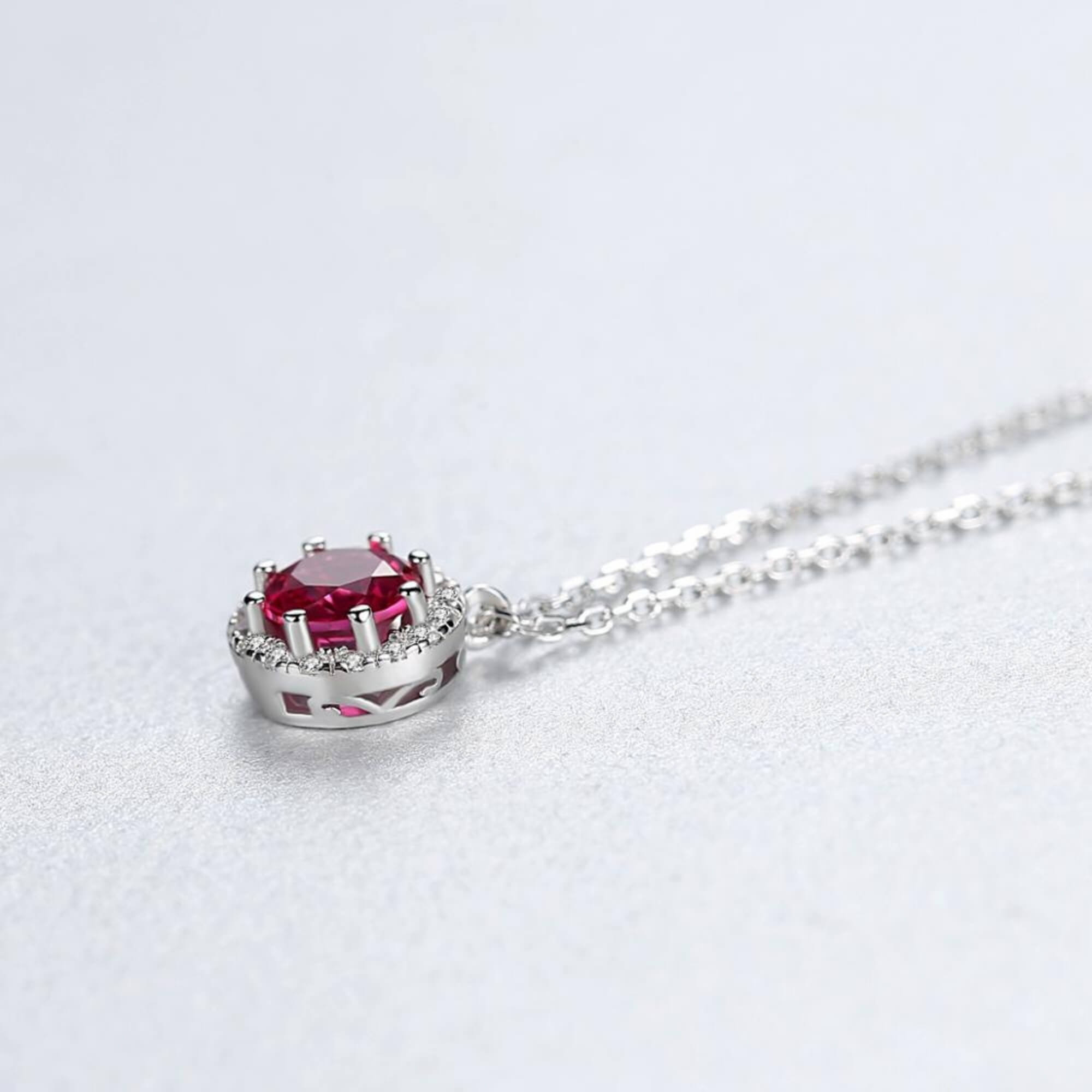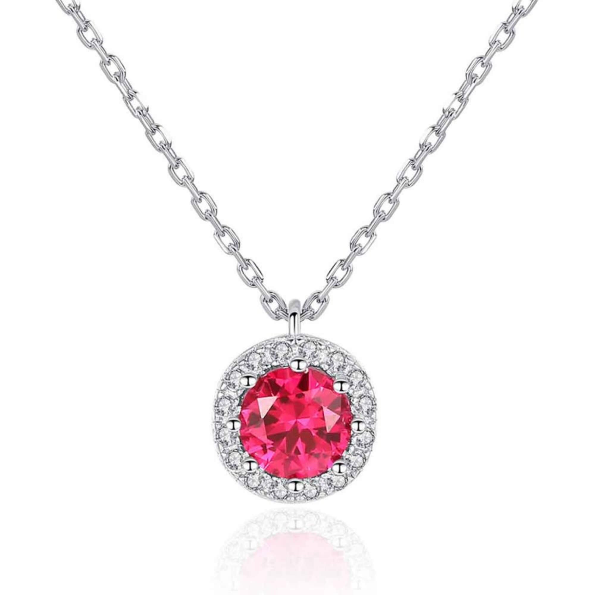 Ervaar de allure van koninklijke elegantie met deze zilveren ketting, voorzien van een klassiek vlechtontwerp en een hanger versierd met een levendige rode synthetische robijn, omringd door kleinere kristallen. Deze ketting is perfect voor speciale gelegenheden of om een verfijnd tintje te geven aan het dagelijks leven. Het is een statement van gratie en elegantie.