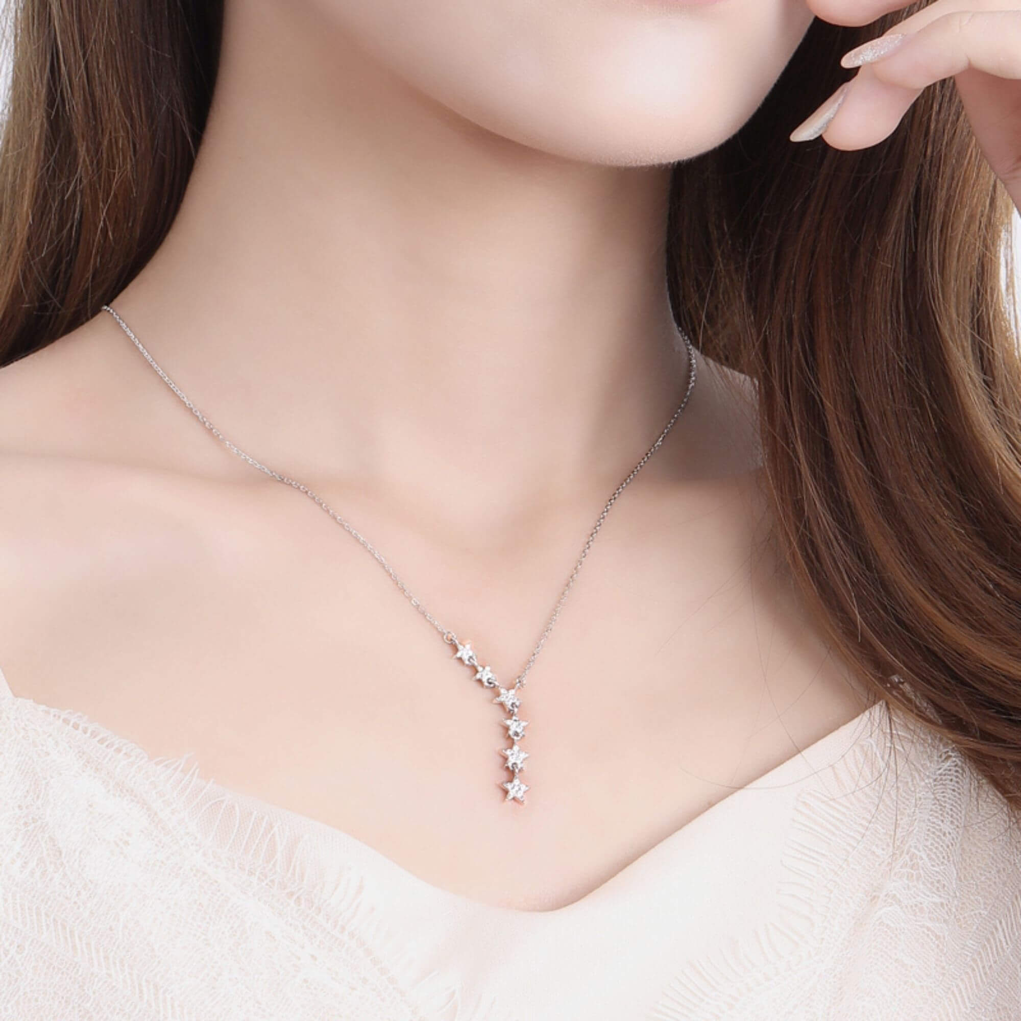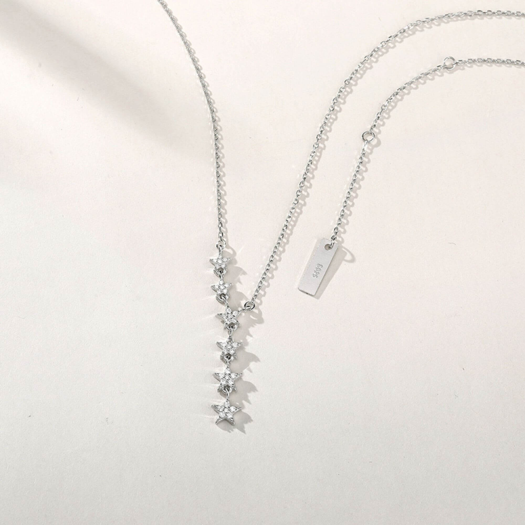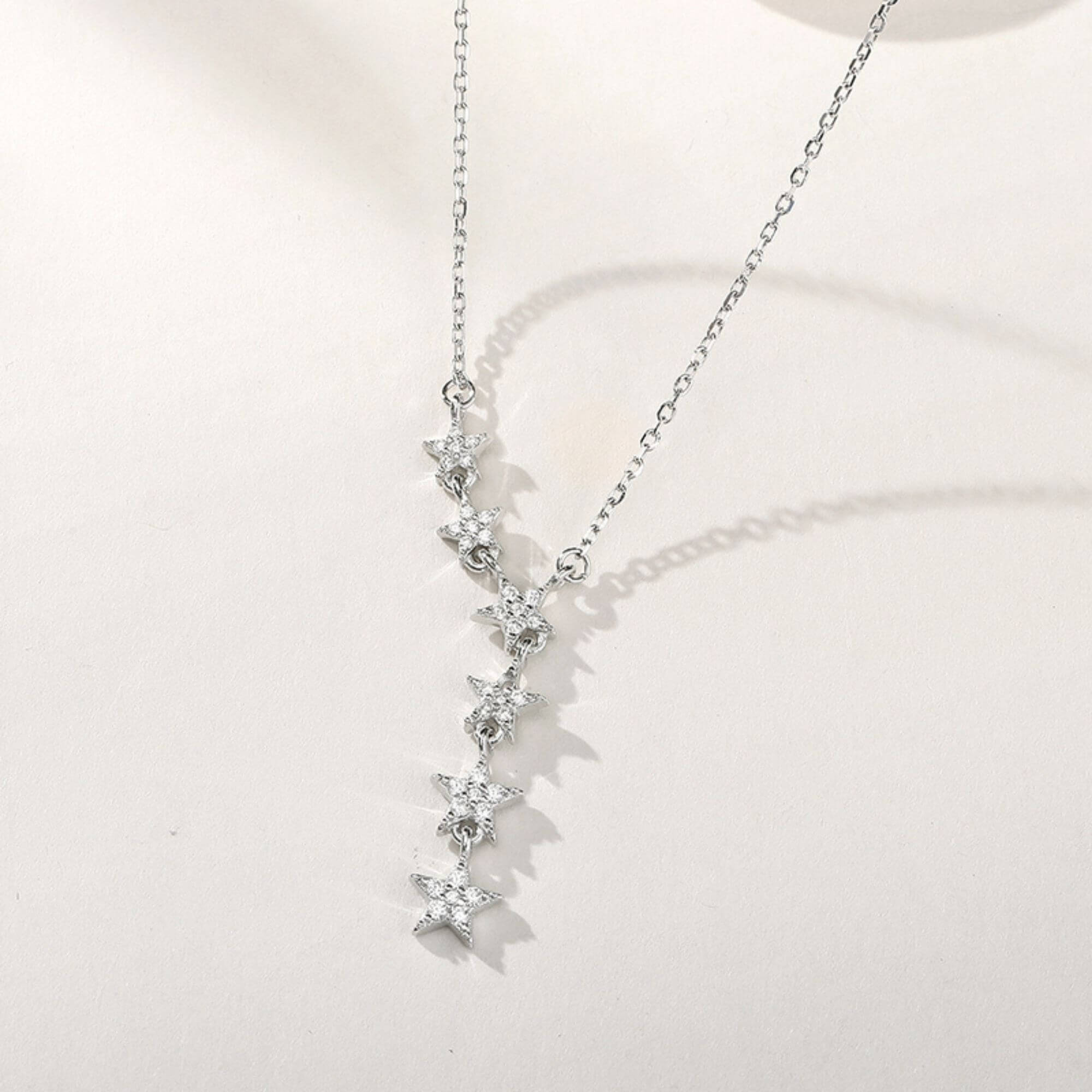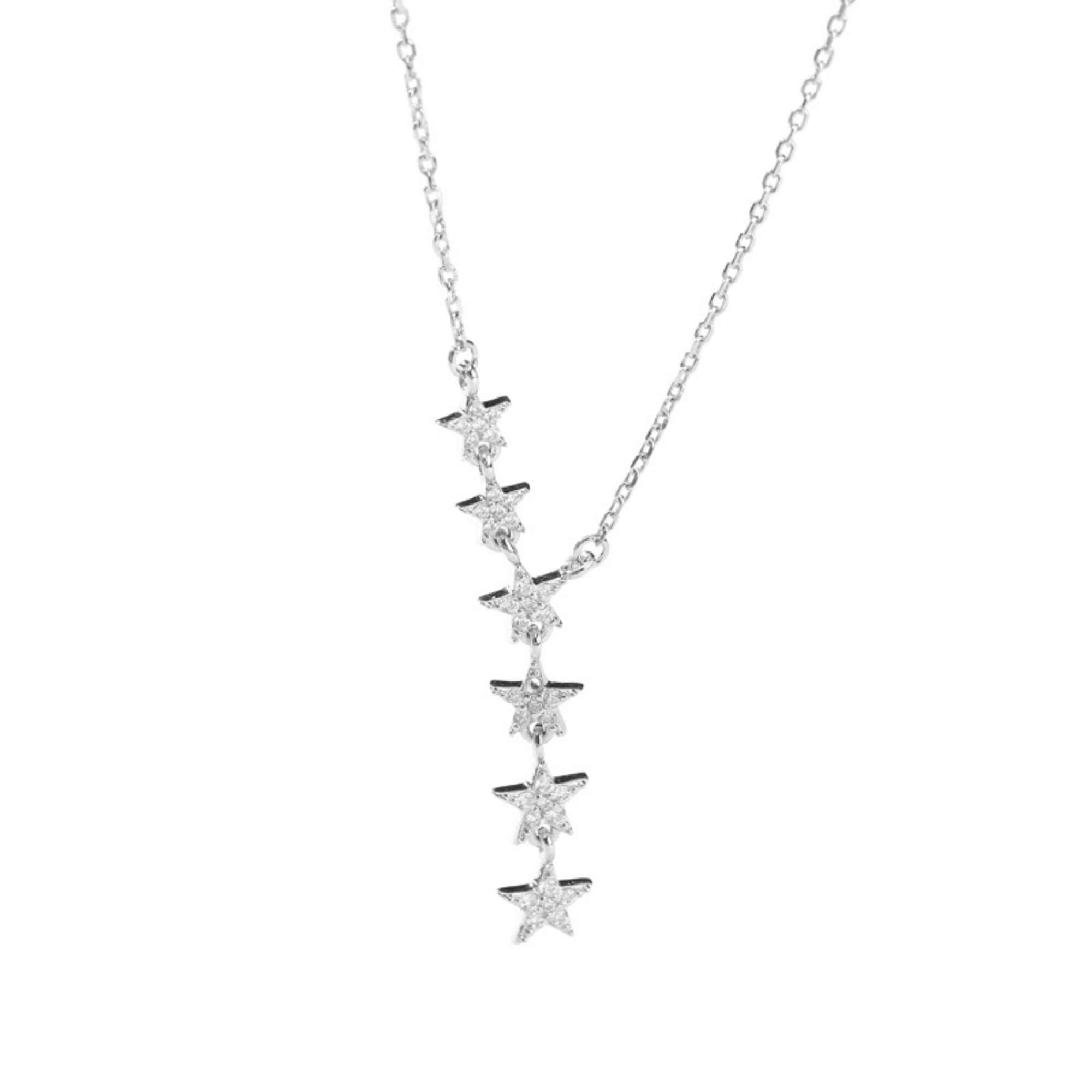 Geniet van de charme van asymmetrie met deze delicate zilveren ketting. Het klassieke vlechtwerk straalt elegantie uit, terwijl de zes sterren die aan één kant naar beneden lopen een uniek, opvallend ontwerp bieden. De asymmetrische opstelling van de sterren introduceert een gevoel van beweging en visuele intriges, waardoor deze ketting zich onderscheidt. Of het nu het middelpunt van je outfit is of wordt gecombineerd met andere kettingen, dit accessoire is een echte gespreksstarter en een statement in stijl.
