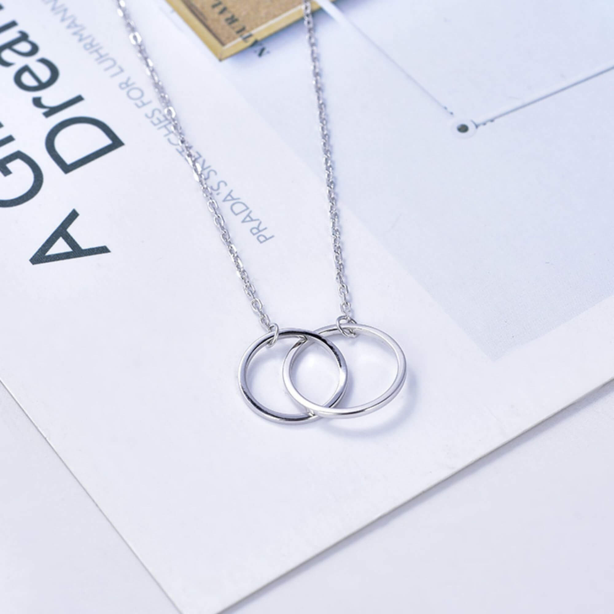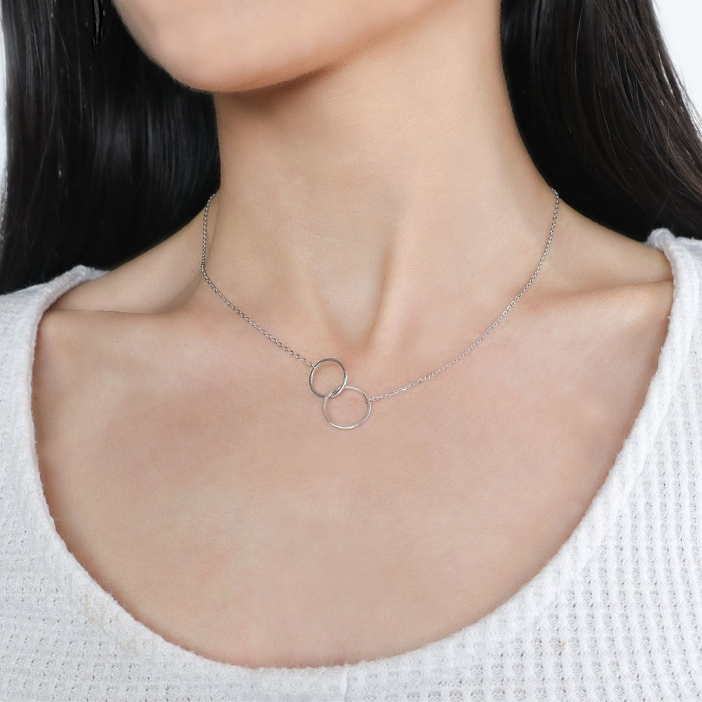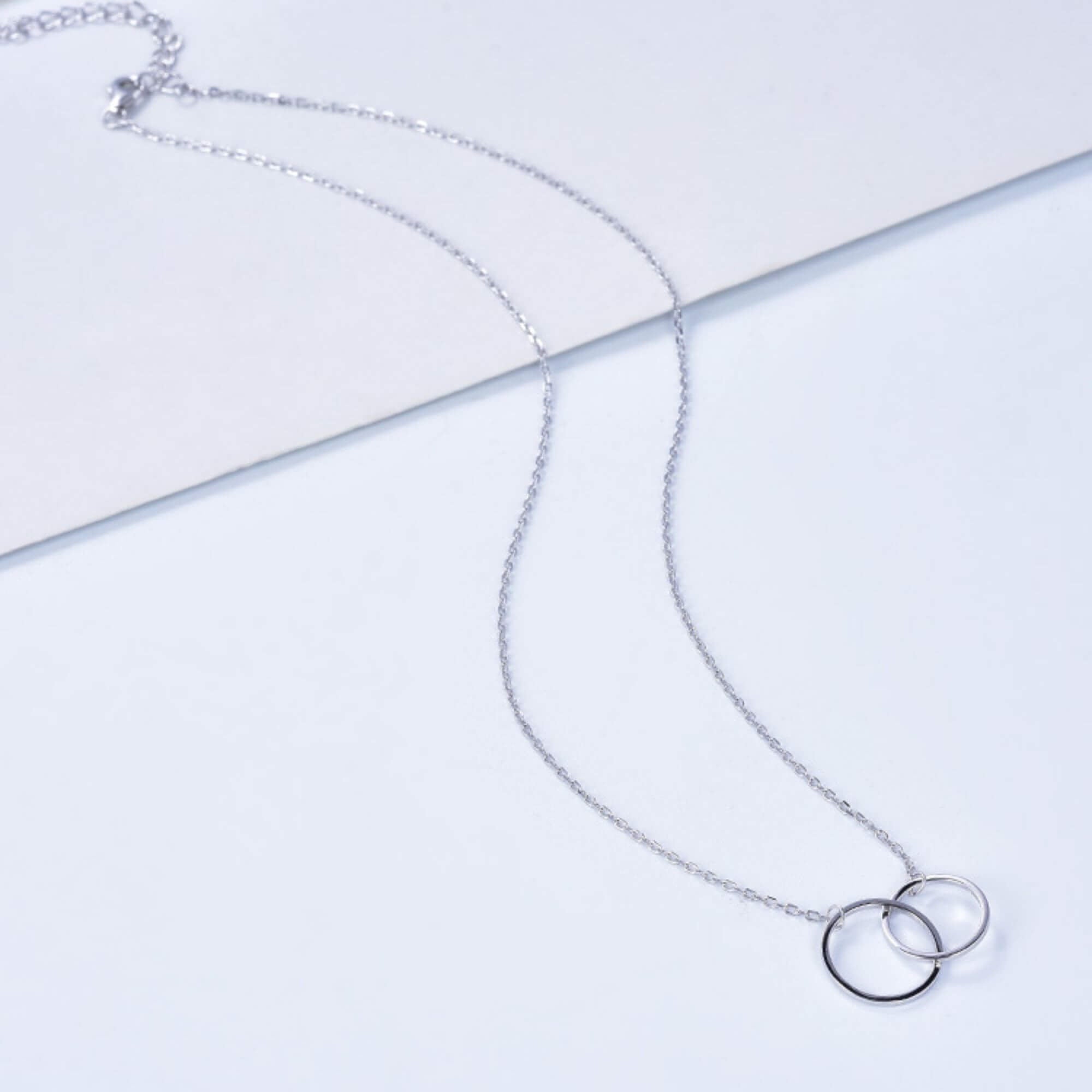 Deze zilveren ketting, met twee onderling verbonden ringen, belichaamt elegantie in zijn eenvoudigste vorm. Het ontwerp, intrigerend en toch ingetogen, past bij elke stijl en gelegenheid. Het is meer dan alleen een mooi stuk, het symboliseert de band tussen twee mensen. Het is een attent cadeau om de band te verdiepen of een verfijnde toets aan je look toe te voegen.