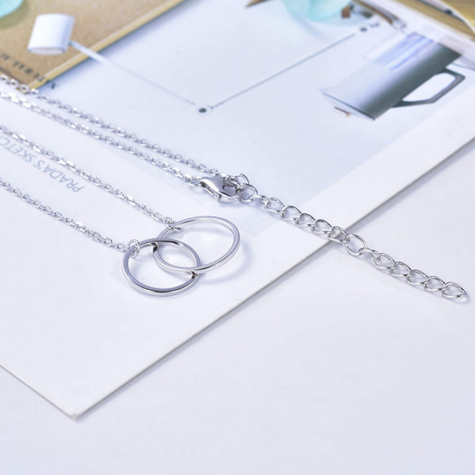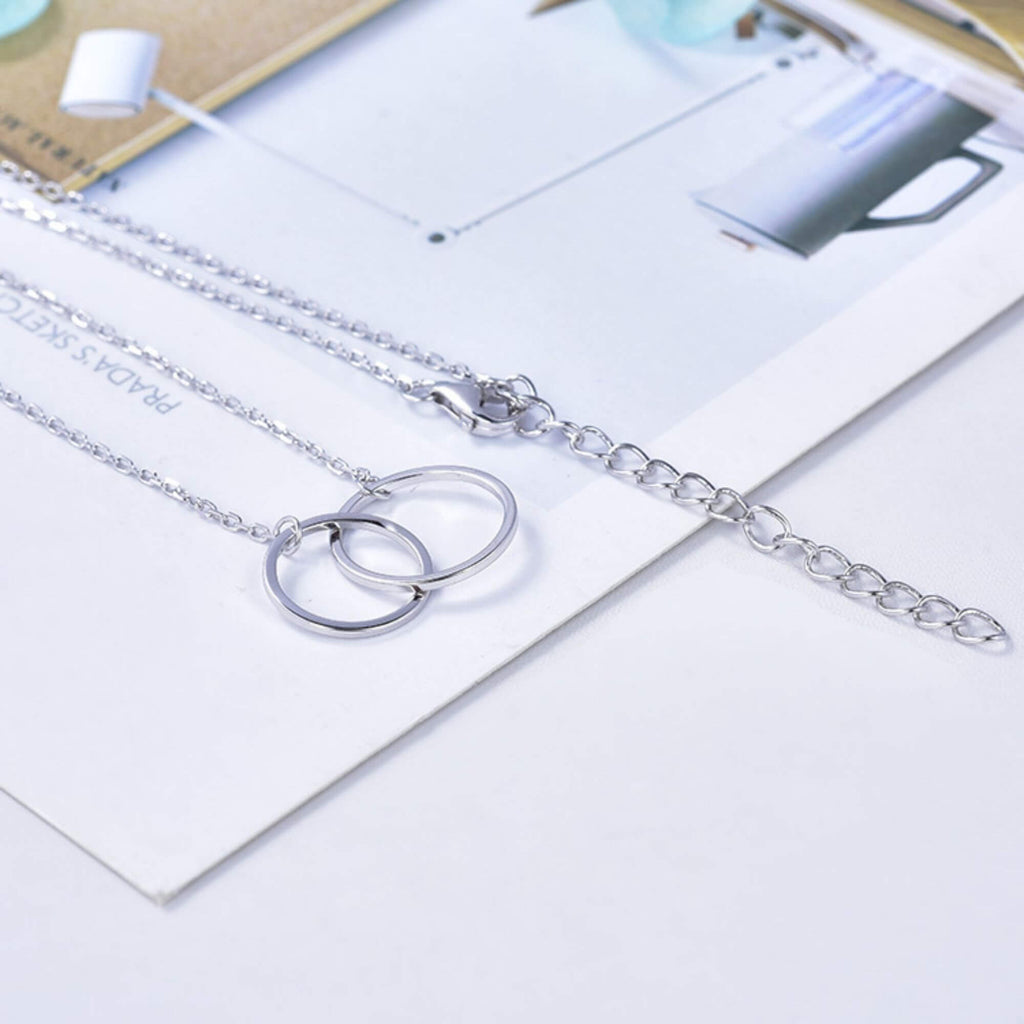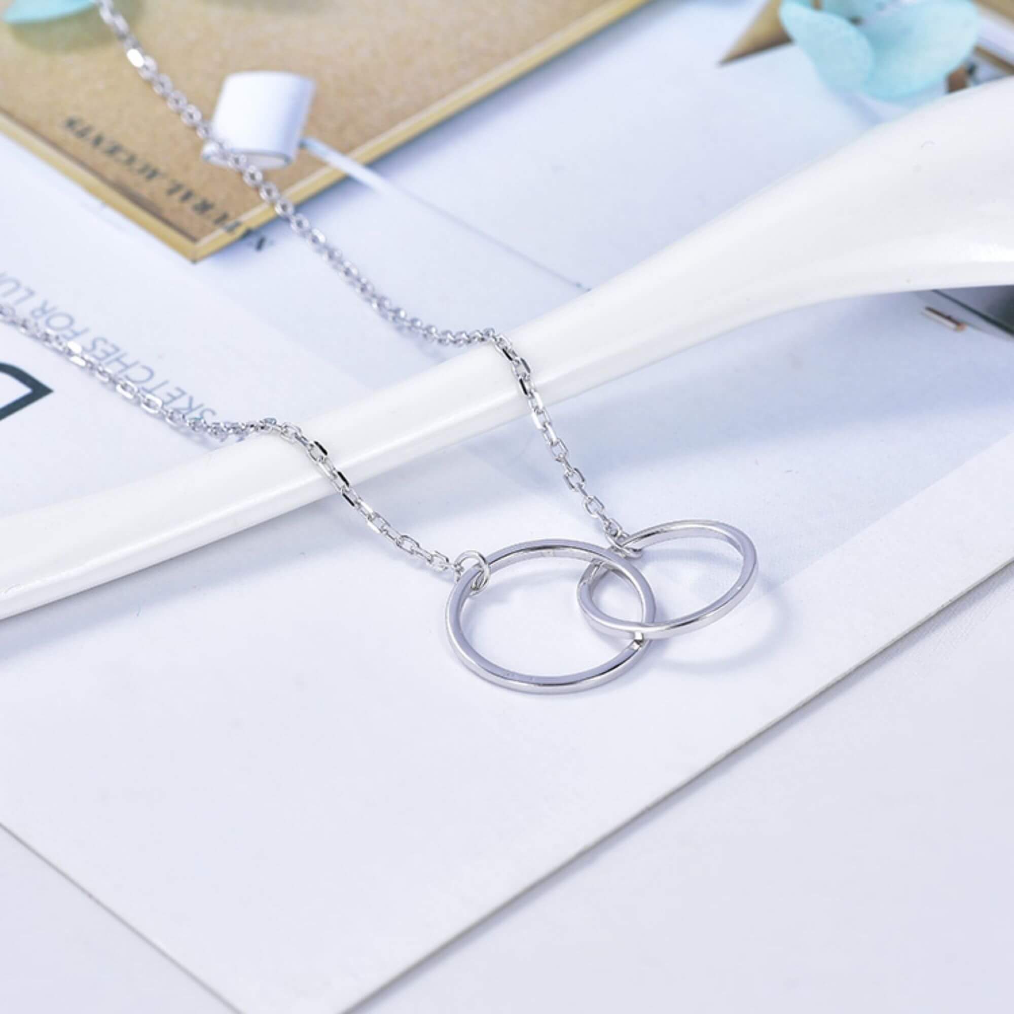 Deze zilveren ketting, met twee onderling verbonden ringen, belichaamt elegantie in zijn eenvoudigste vorm. Het ontwerp, intrigerend en toch ingetogen, past bij elke stijl en gelegenheid. Het is meer dan alleen een mooi stuk, het symboliseert de band tussen twee mensen. Het is een attent cadeau om de band te verdiepen of een verfijnde toets aan je look toe te voegen.