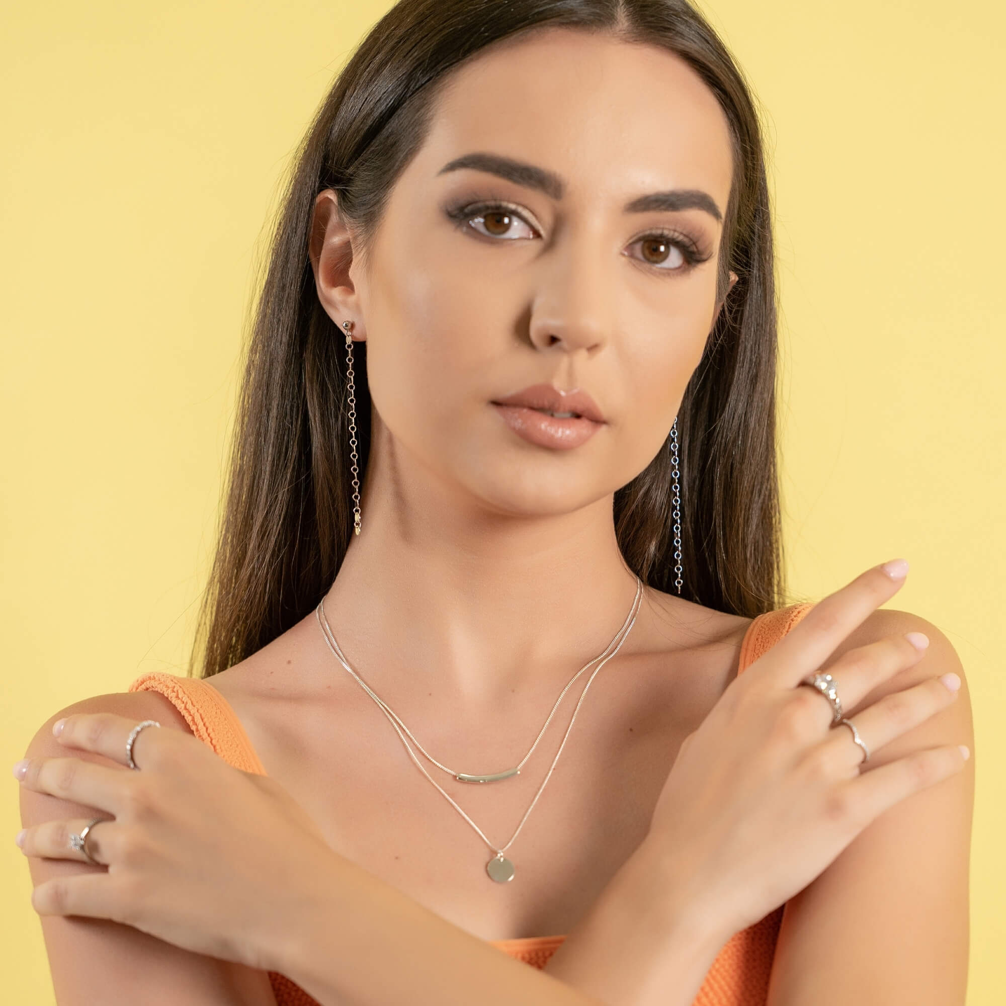 Voeg een frisse toets toe aan je dagelijkse stijl met de verfijnde elegantie van deze gelaagde zilveren ketting. Het strakke, klassieke ontwerp past naadloos bij een verscheidenheid aan outfits en voegt elegantie toe aan je drukke leven. Deze ketting belichaamt de perfecte fusie van stijl en eenvoud, waardoor een statement wordt gemaakt dat resoneert met jouw modegevoel.