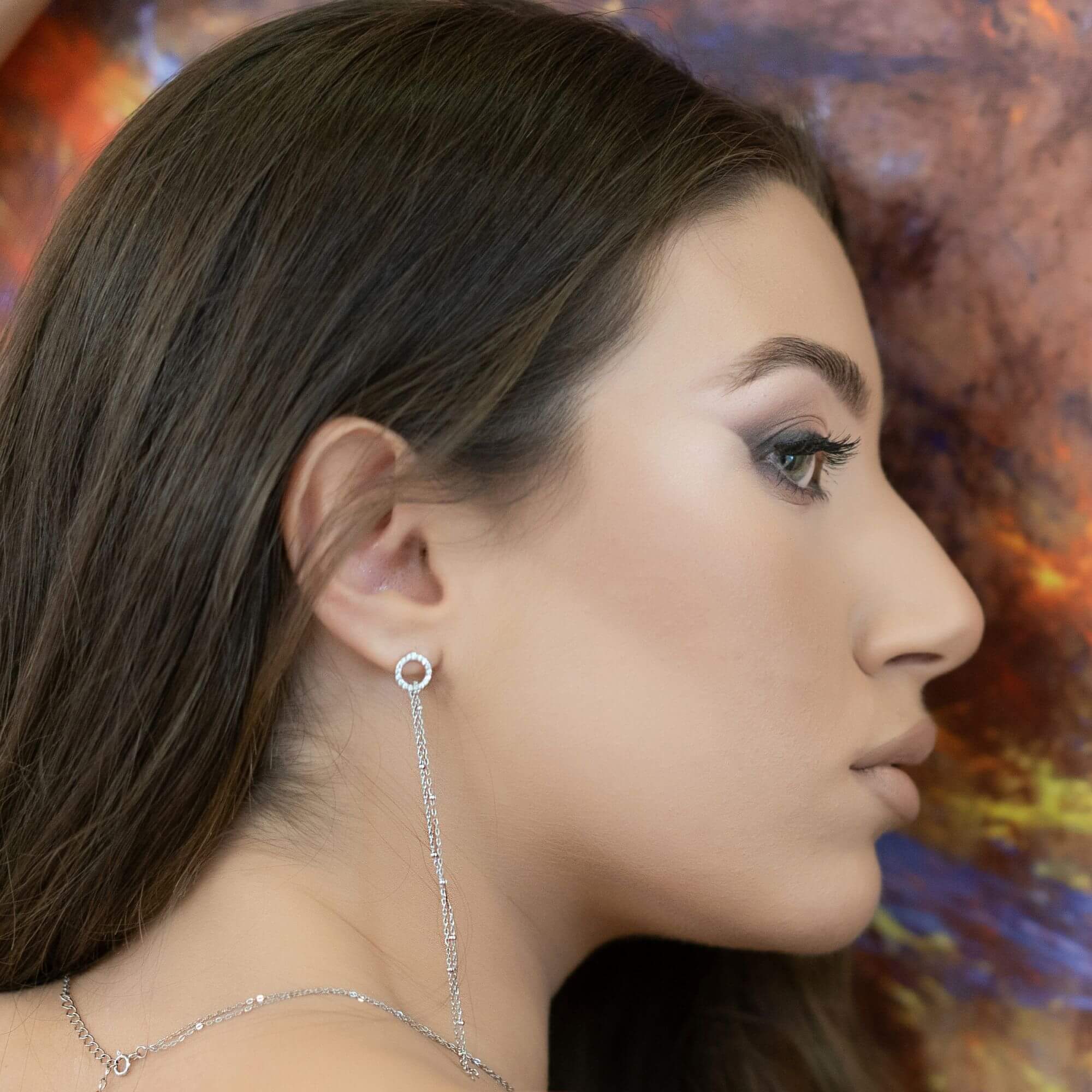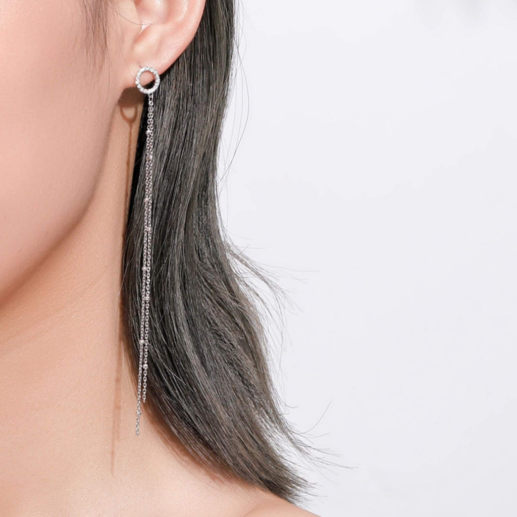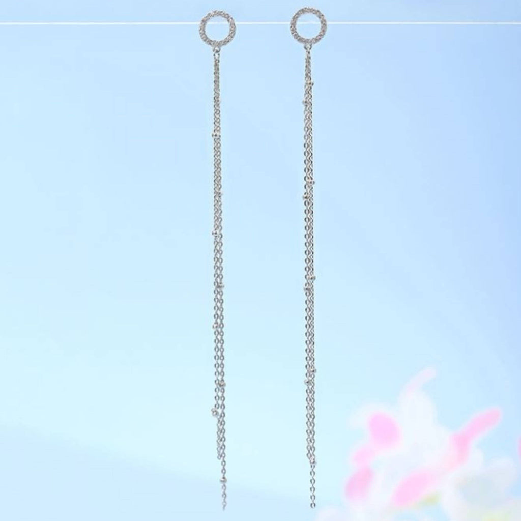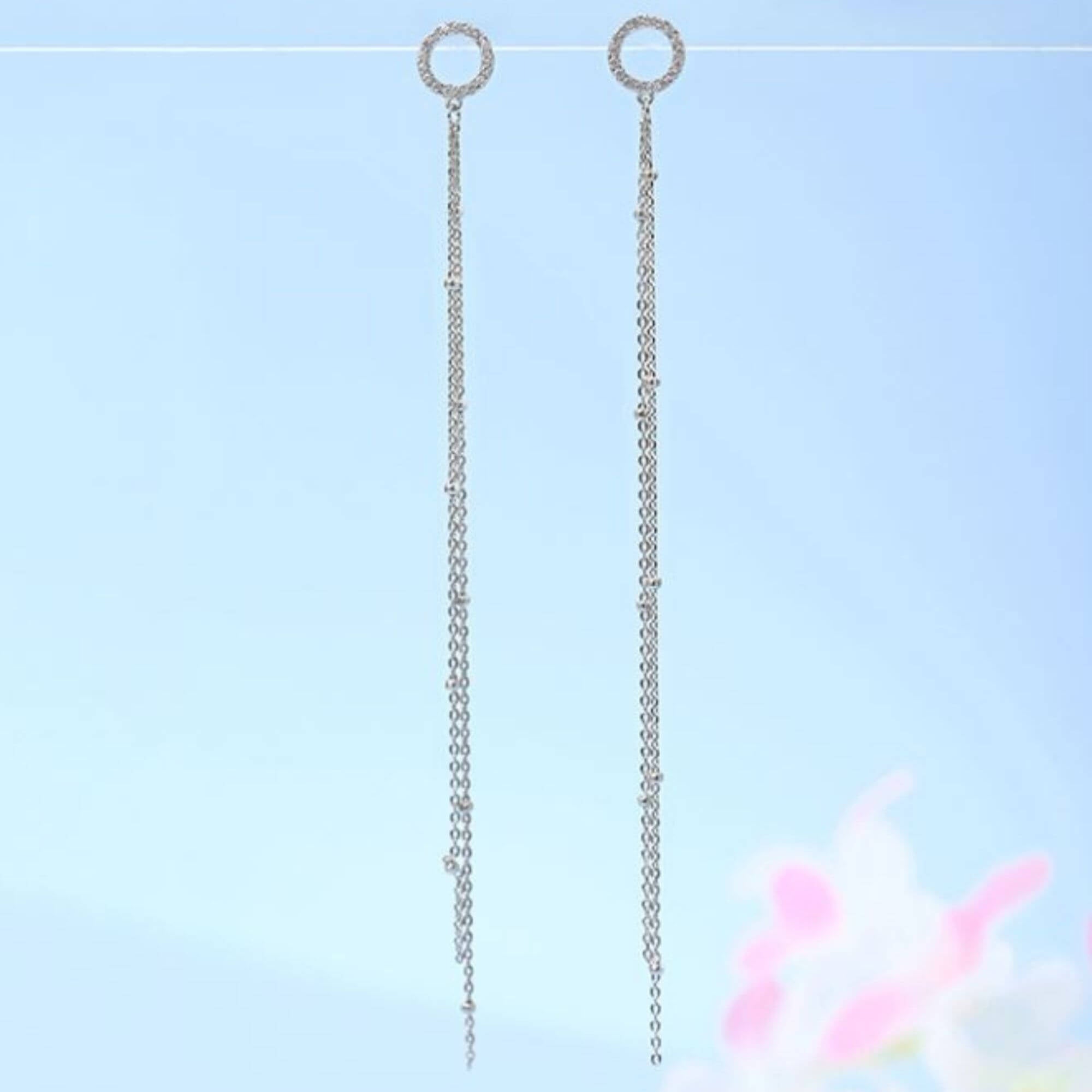 Verbeter je stijl met onze elegante zilveren oorbellen. Deze prachtige stukken zijn maar liefst 11 cm lang en vertonen een delicaat spoor van negen gepolijste bollen, die leiden naar een stralende cirkel versierd met sprankelende zirkonia. Ze zijn het perfecte vleugje verfijning dat je outfit nodig heeft om echt te schitteren.