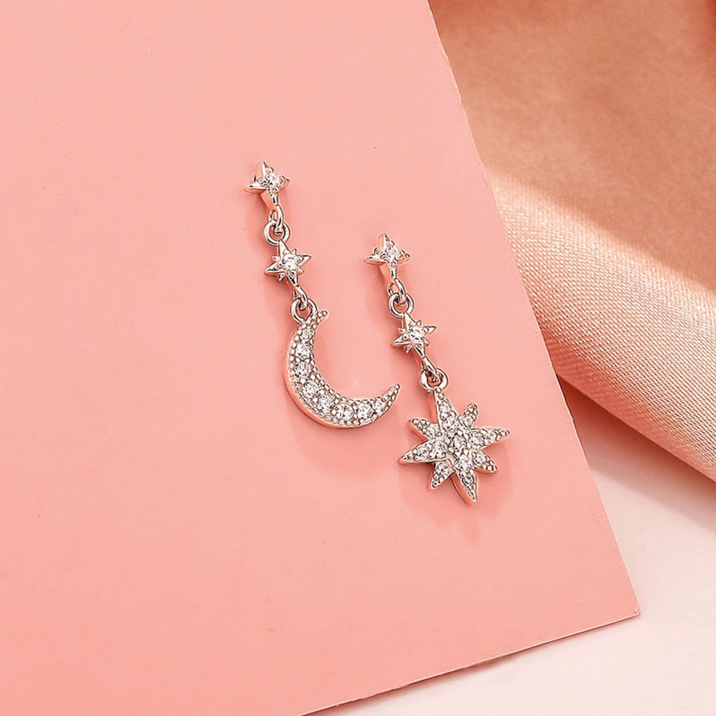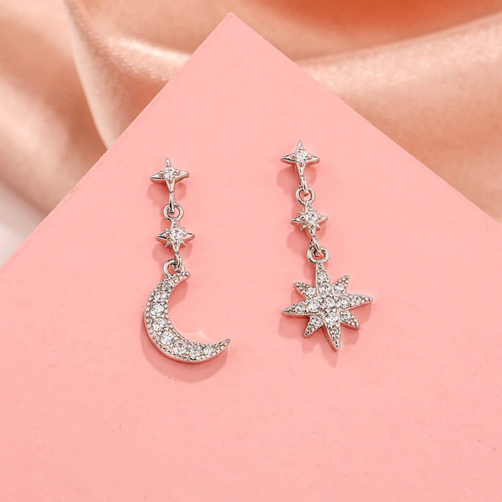 Stap in de magie van de nachtelijke hemel met onze hemels geïnspireerde sterling zilveren oorbellen. Dit delicate en artistieke paar heeft een charmant maan- en sterontwerp, waarbij elk stuk glinstert met sprankelende zirkoniastenen. Hun speelse asymmetrie zorgt voor een uniek en betoverend tintje, waardoor ze een veelzijdige keuze zijn voor elke gelegenheid. Of je je nu verkleedt voor een avondje uit of een vleugje eigenzinnigheid toevoegt aan je dagelijkse kleding, deze oorbellen zullen zeker boeien en charmeren.