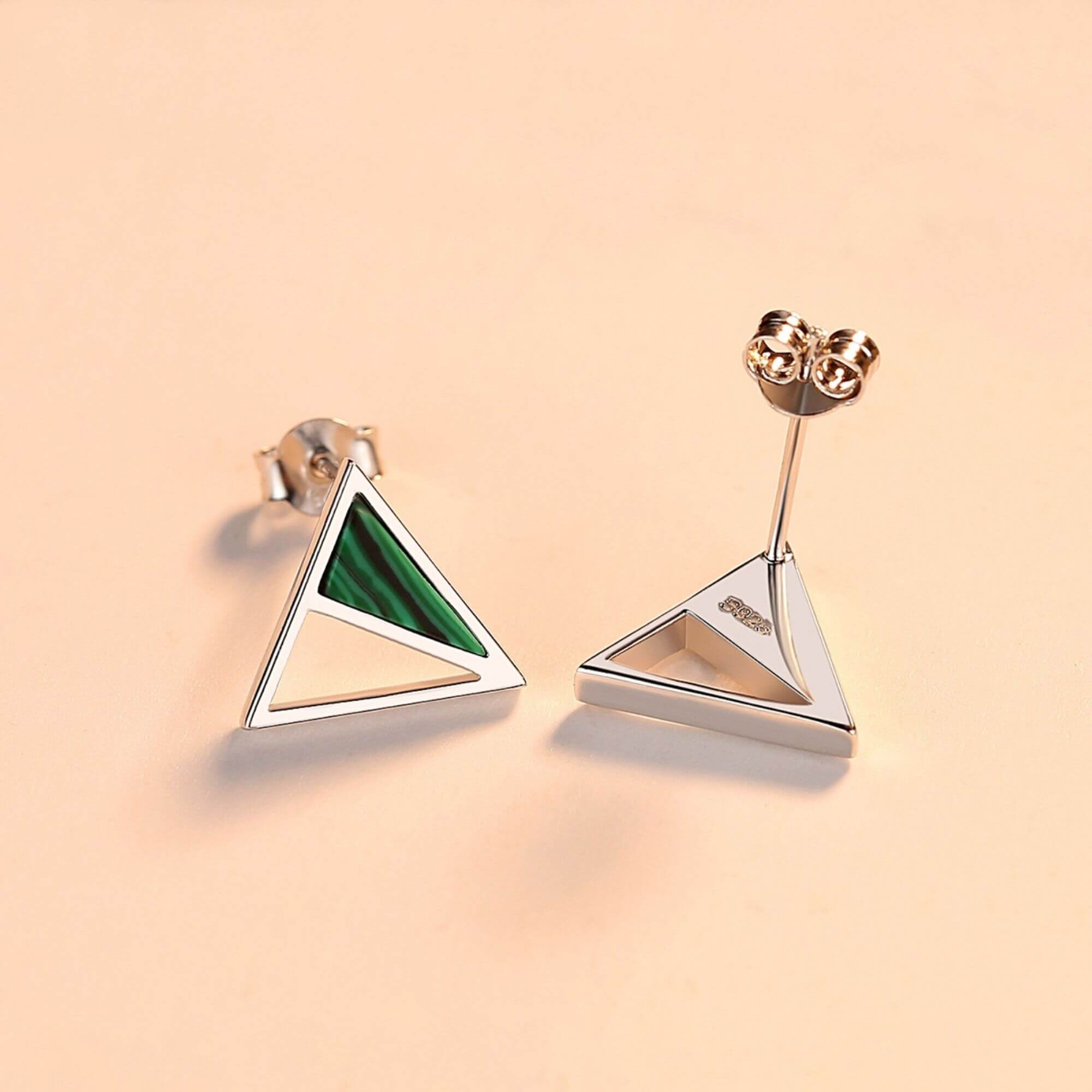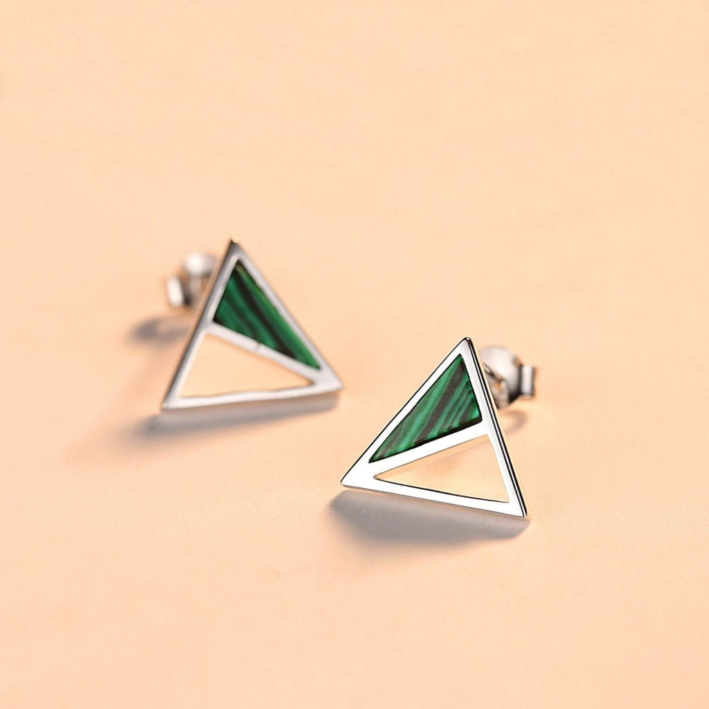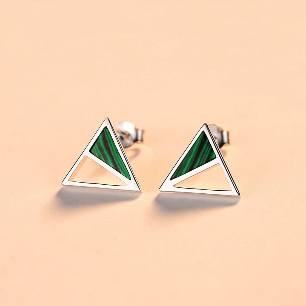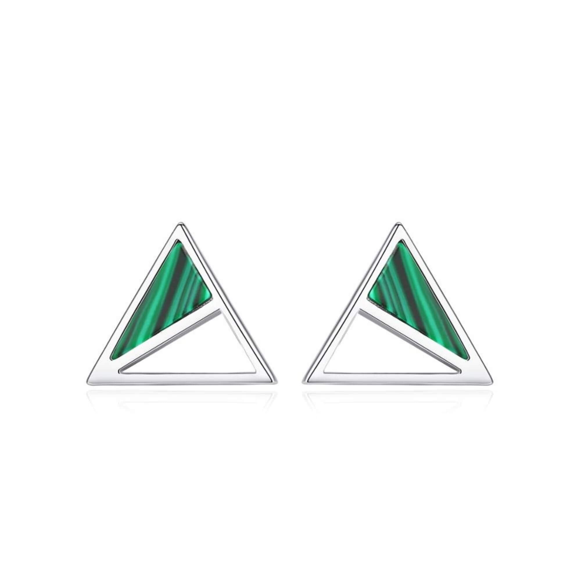 Val op met onze opvallende zilveren oorbellen, met een opvallend driehoekig ontwerp waarvan de ene helft versierd is met levendig groen malachiet. Deze mix van geometrische stijl en levendige edelsteen creëert een opvallende en onconventionele look die zeker de aandacht zal trekken.