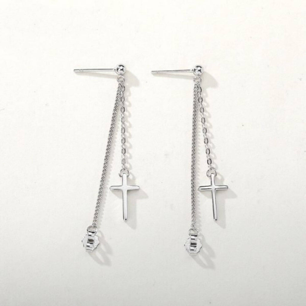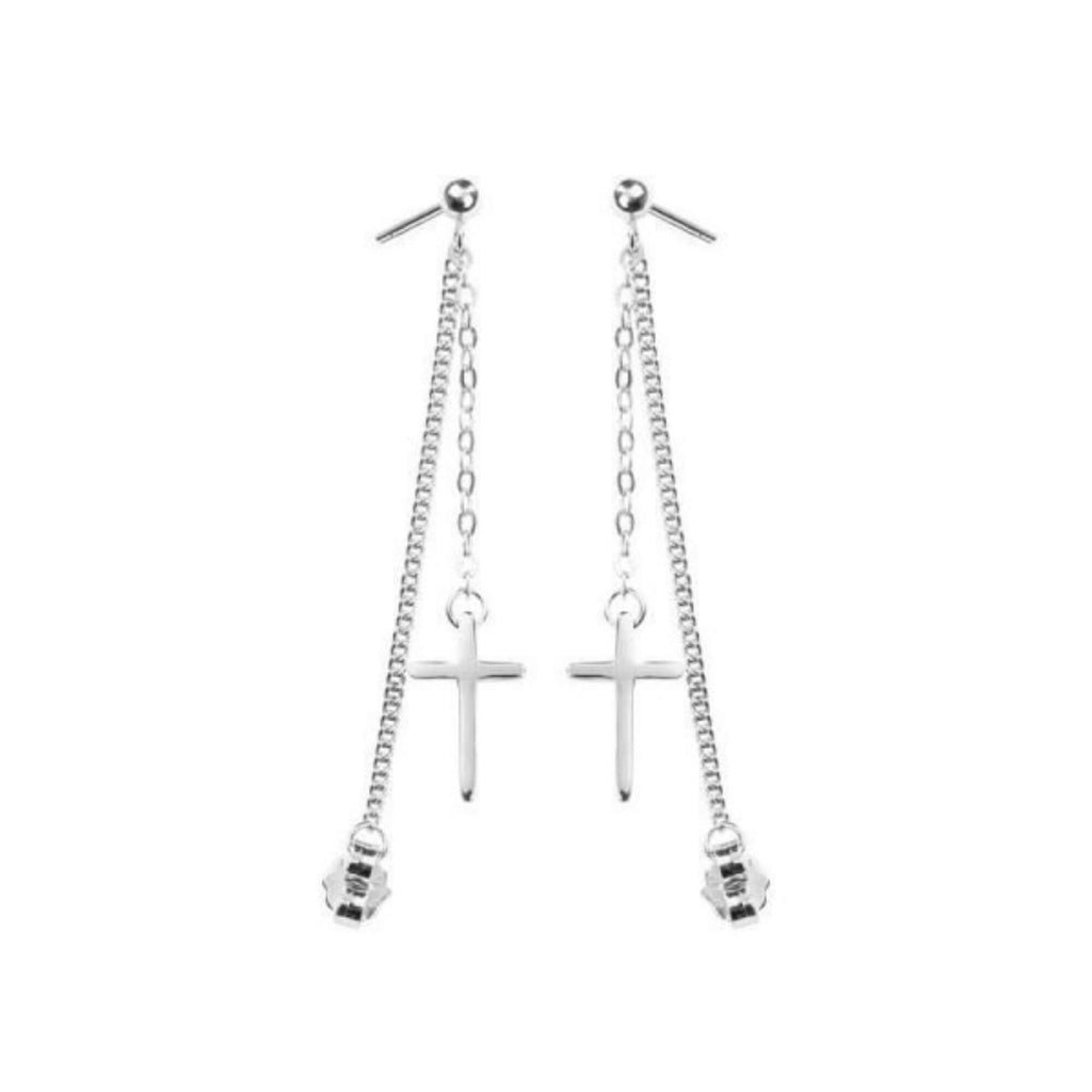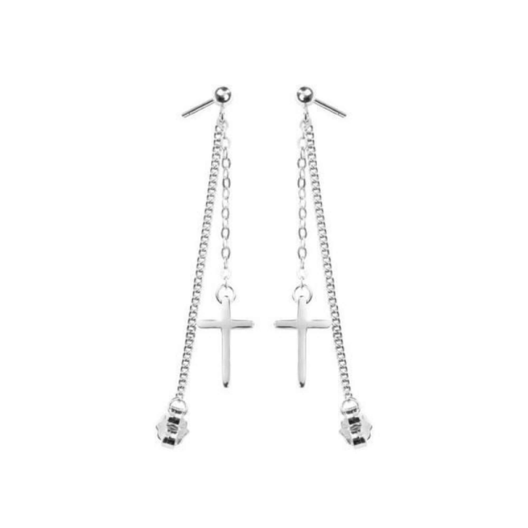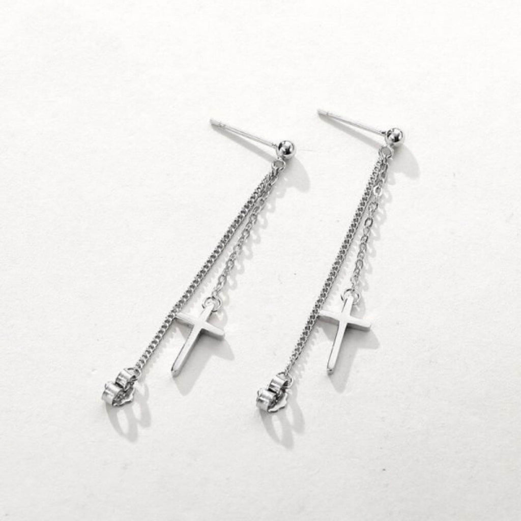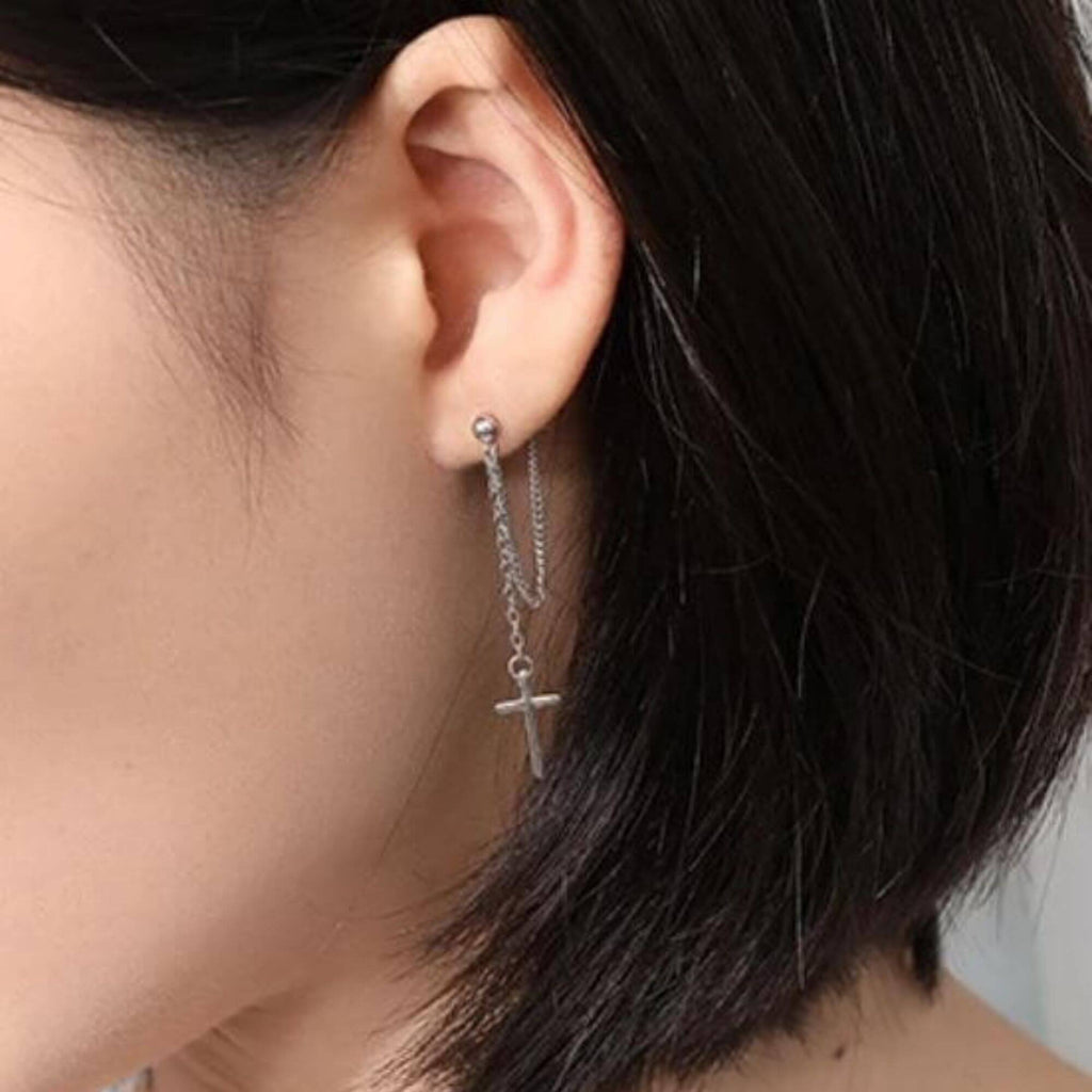 Verhoog je stijl met onze opvallende zilveren oorbellen, elk versierd met een hangend kruis en een slanke ketting die elegant tot onder het oor valt. Dit onderscheidende ontwerp geeft een vleugje intriges aan elk ensemble, waardoor deze oorbellen een veelzijdige aanvulling zijn op je accessoirecollectie. Deze oorbellen zijn perfect voor alledaagse elegantie of voor het toevoegen van een verfijnde flair aan formele kleding. Ze zijn een harmonieuze mix van klassieke en eigentijdse stijlen, ontworpen om een gedurfd modestatement te maken.
