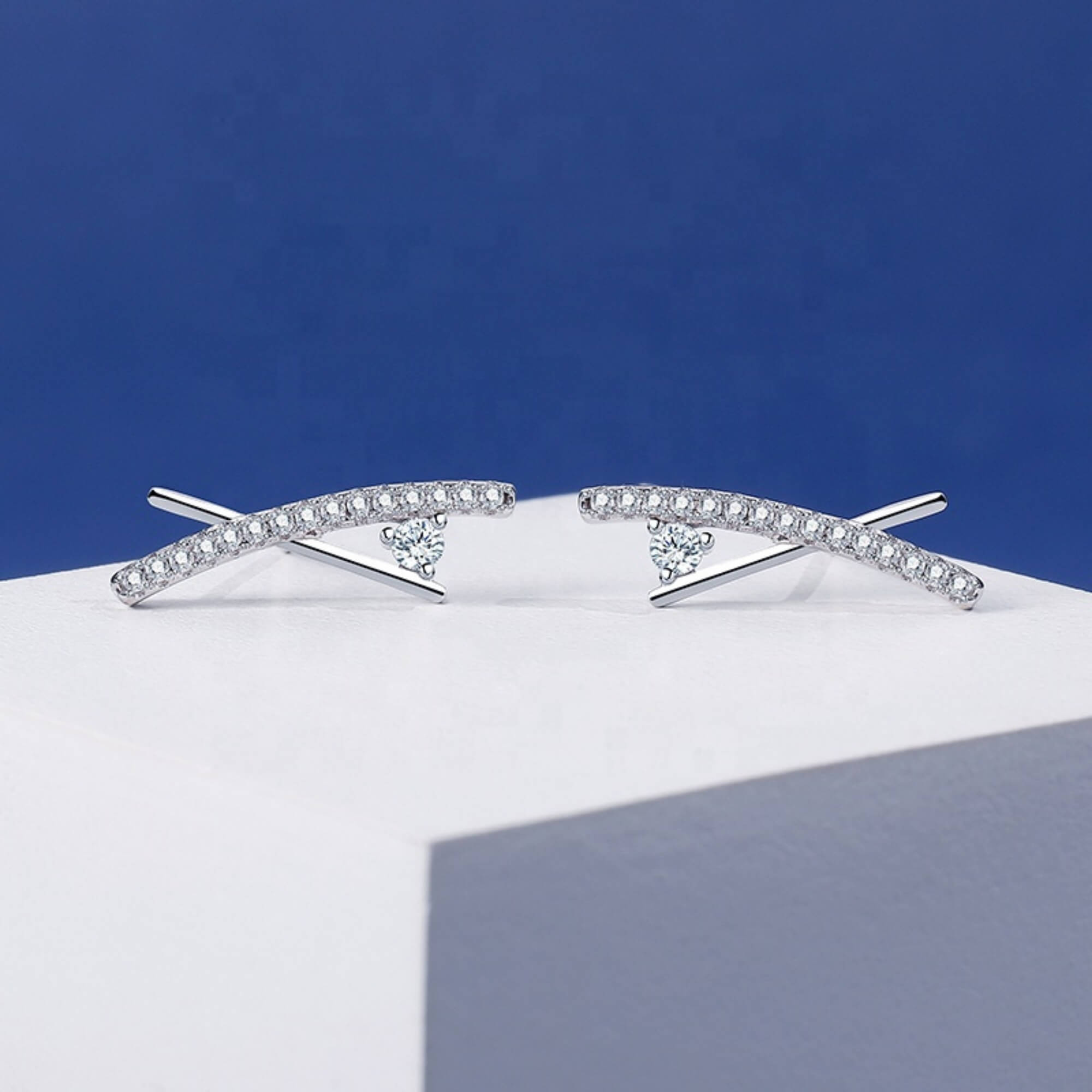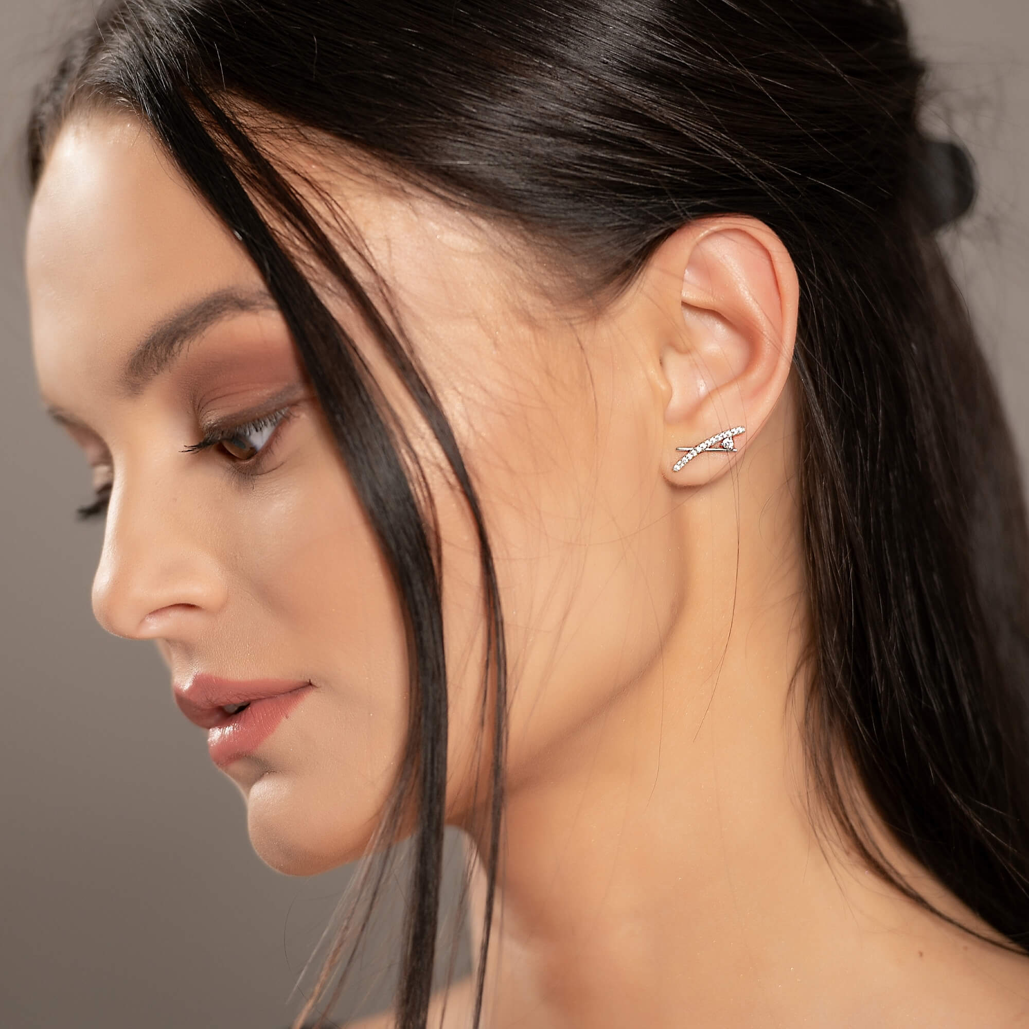 Boeiende zilveren oorbellen met een sierlijke ronding, versierd met een groot aantal glinsterende zirkonia-edelstenen die een onderscheidende charme verlenen aan het uiterlijk van elke vrouw. Hoewel het ontwerp gemakkelijk een statement kan maken, zijn ze lichtgewicht en comfortabel. Een perfect paar oorbellen voor dagelijks gebruik.