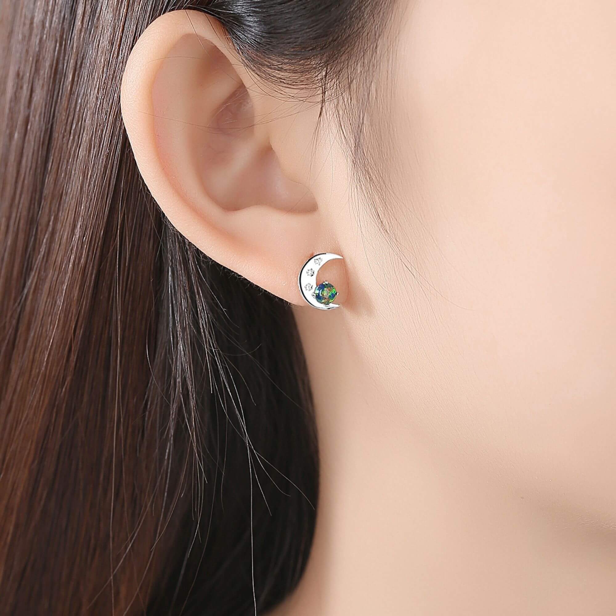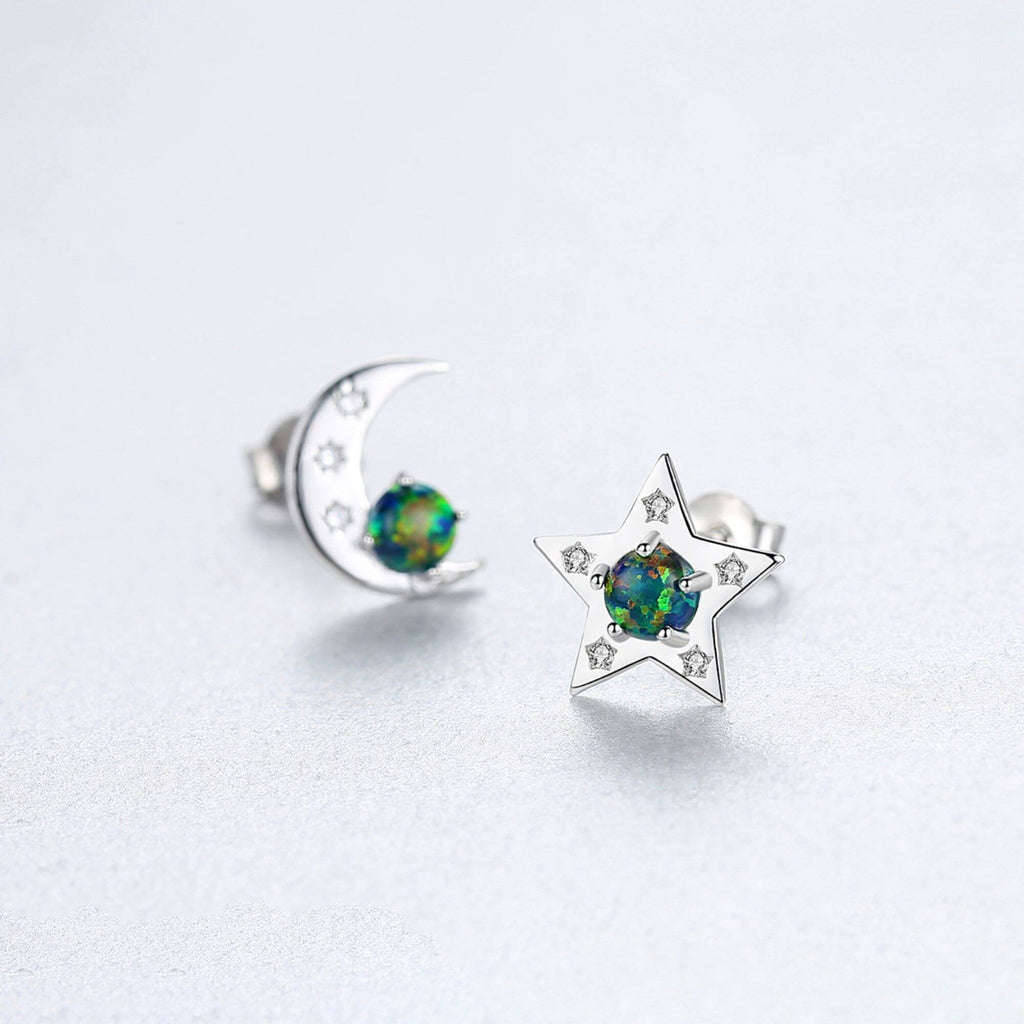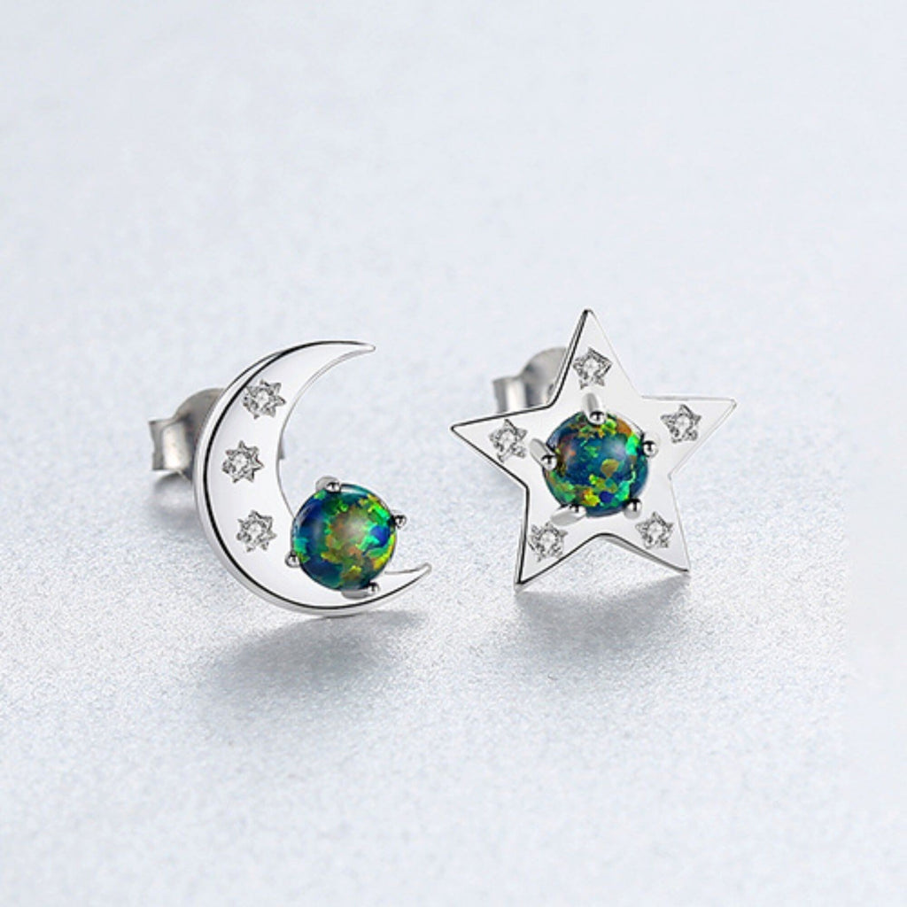Geniet van hemelse elegantie met deze buitengewone zilveren oorbellen. De ene oorbel omarmt een astrologisch motief en heeft de vorm van een stralende ster, terwijl de andere de sierlijke maansikkel weerspiegelt. De fascinerende ronde opaal in het midden voegt een betoverende vleugje schittering toe en versterkt de algehele schittering en allure van deze hemels geïnspireerde oorbellen. Perfect voor degenen die zichzelf willen versieren met een vleugje kosmos.