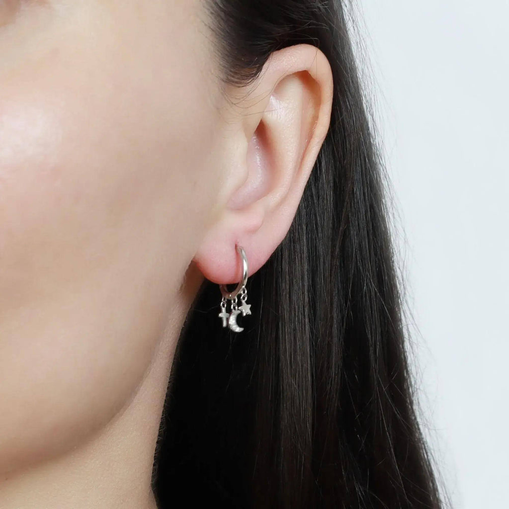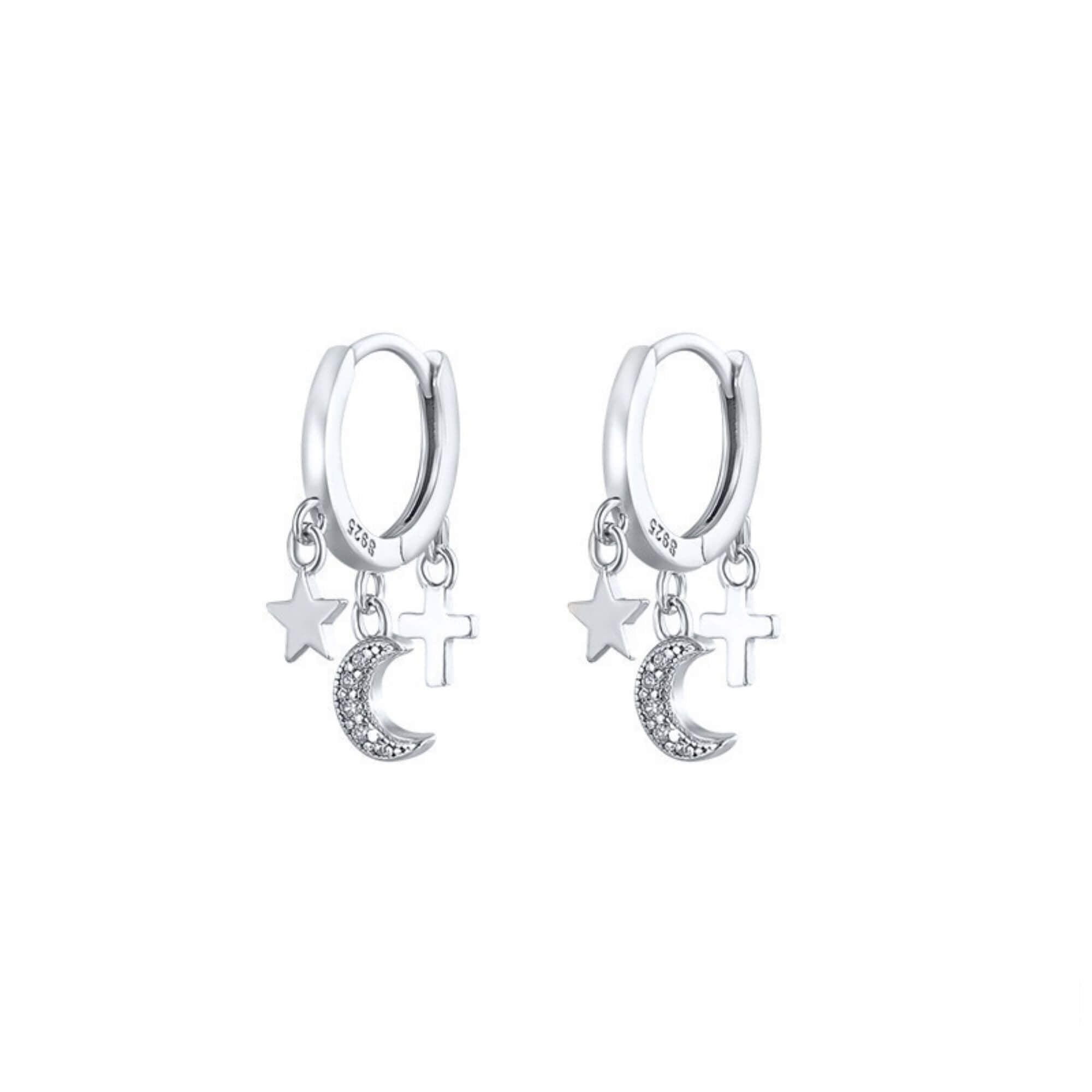 Voeg een vleugje kosmische elegantie toe aan je dag met deze charmante knuffeloorringen. Elk exemplaar is speels versierd met drie symbolen: een kruis, een maan en een ster, waardoor een unieke mix van stijl en persoonlijkheid ontstaat. Ze zijn perfect om een speelse toets aan je outfit toe te voegen en je look moeiteloos naar een hoger niveau te tillen met hun hemelse gratie.