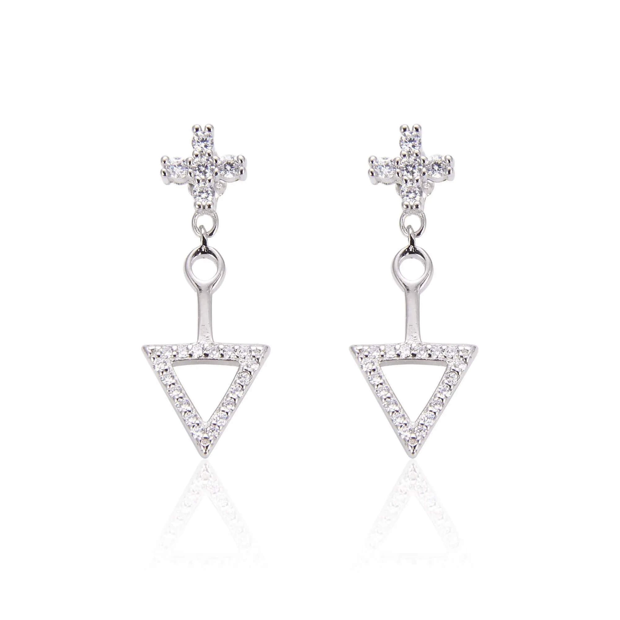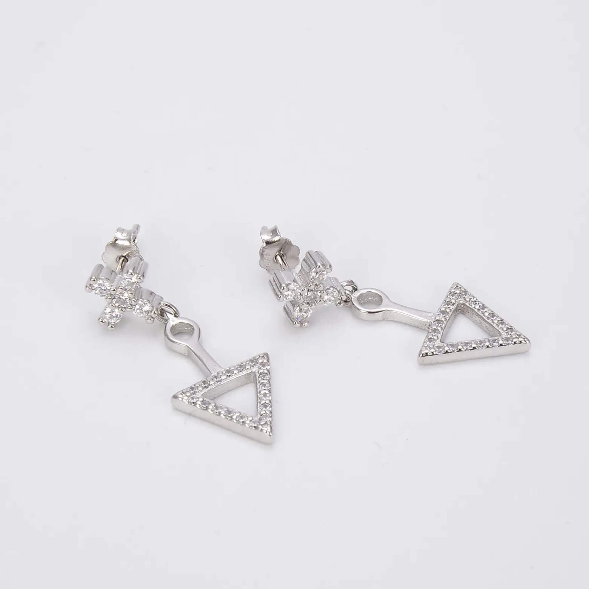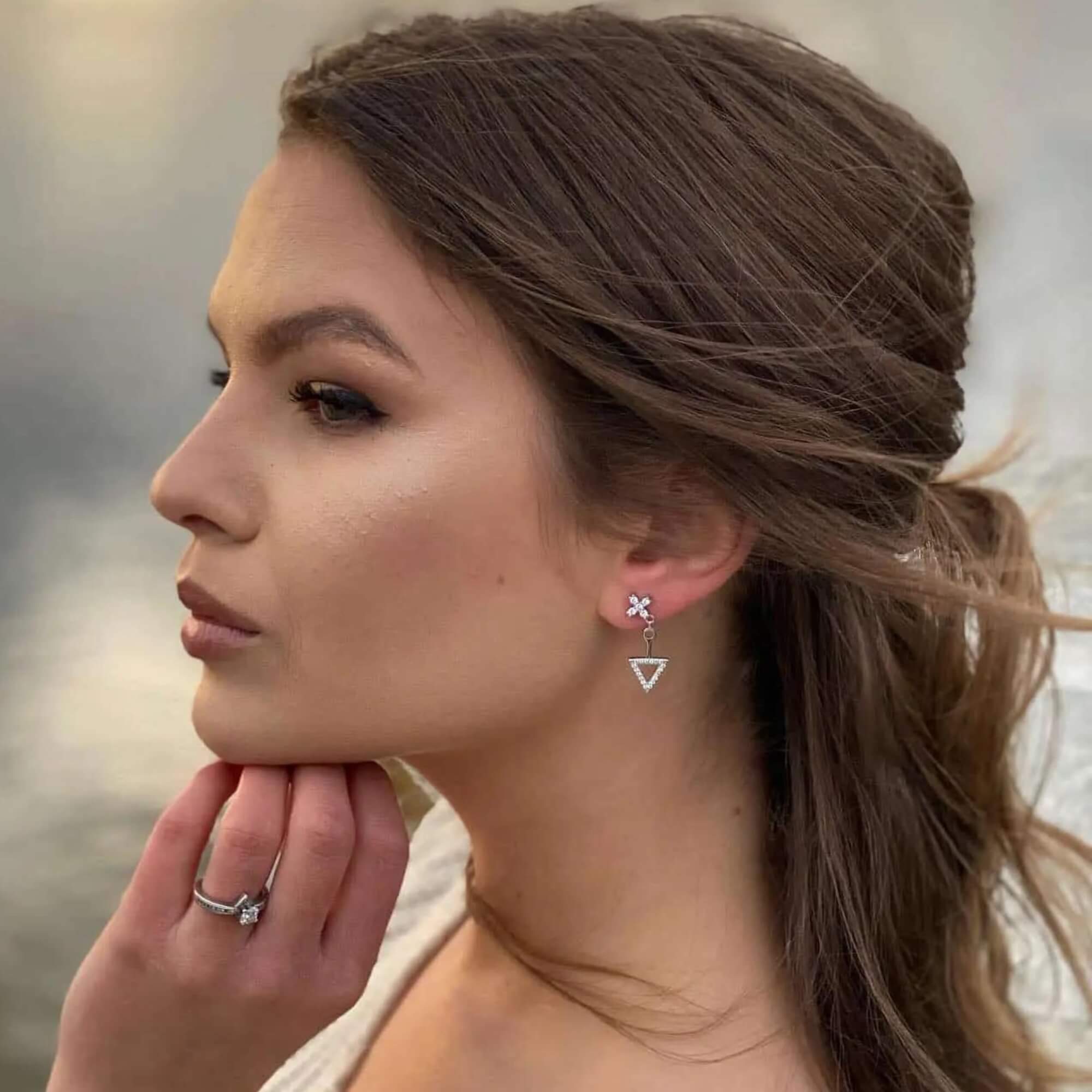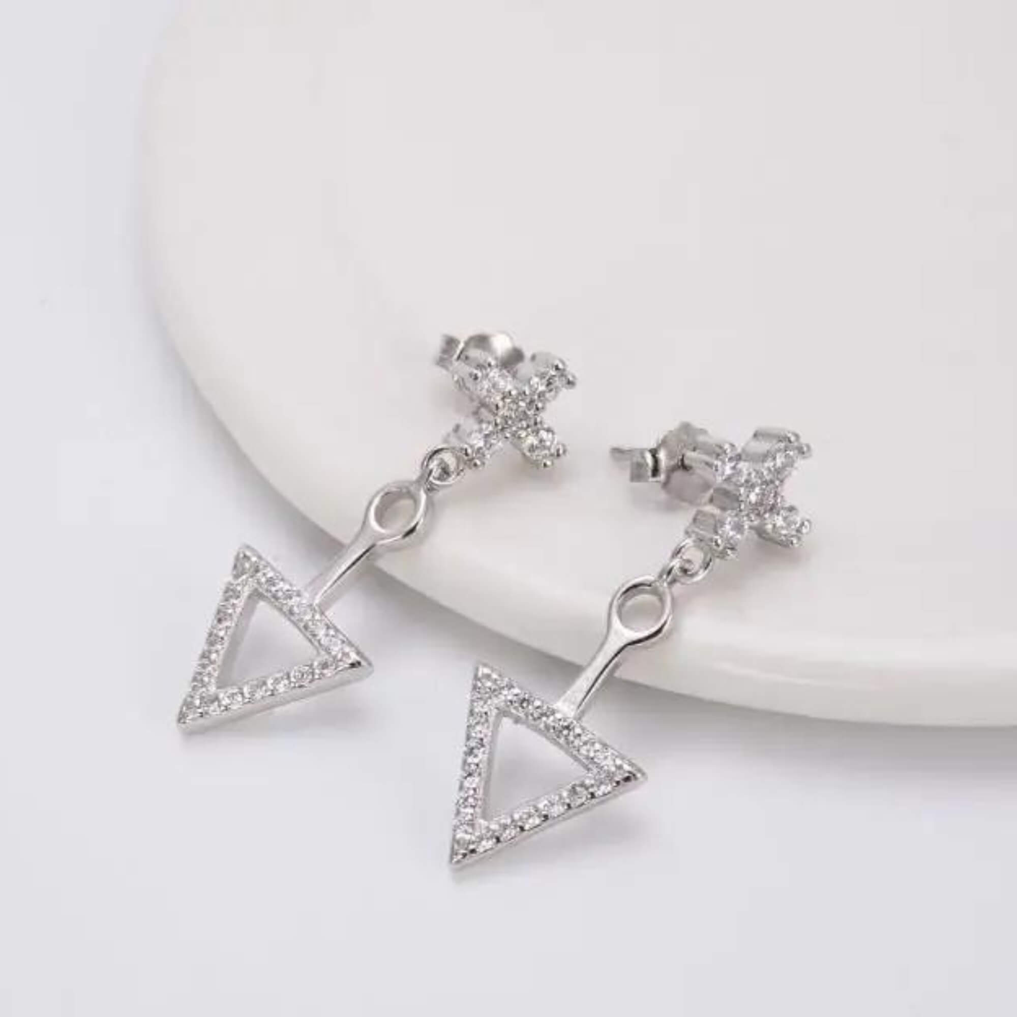 Verhef je look met deze driehoekige zilveren oorbellen, prachtig ingelegd met sprankelende zirkonia. Ideaal voor zowel speciale evenementen als dagelijks gebruik, hun ingewikkelde ontwerp en glinsterende stenen beloven de aandacht te trekken en een vleugje glamour toe te voegen aan elk moment. Of je nu kiest voor een chique uitstraling of het casual houdt, deze oorbellen zijn jouw keuze om een statement te maken.