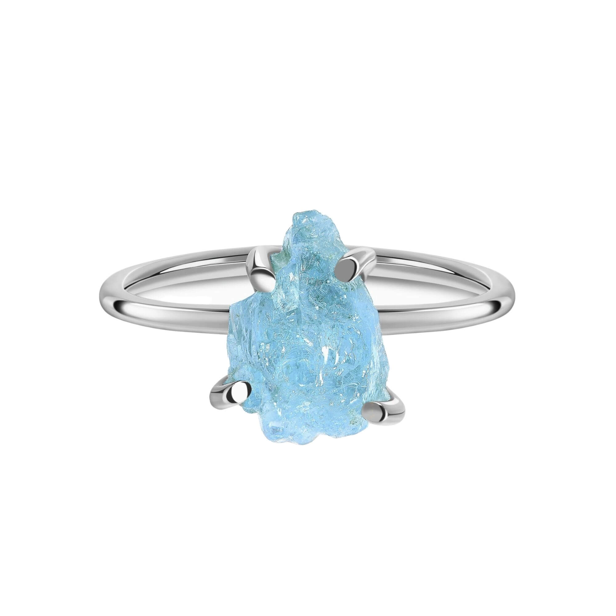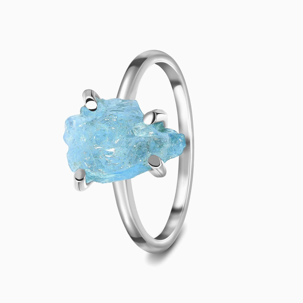 Introductie van een prachtige nieuwe toevoeging aan onze collectie zilveren ringen met natuurlijke en onbehandelde mineralen. Elk stuk in dit ontwerp heeft een unieke vorm, een bewijs van de onbehandelde aard van de steen. De naam 'Aquamarijn' is afgeleid van het Latijnse woord voor zeewater en heeft een speciale betekenis als geboortesteen voor maart.