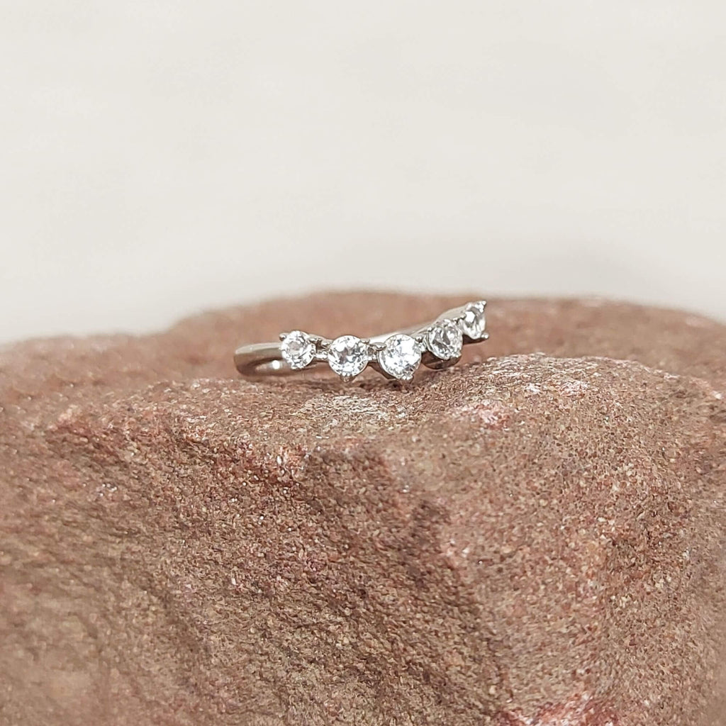 Stap in een wereld van verfijnde elegantie met onze zilveren ring, waar minimalisme de sierlijke allure van topaas ontmoet. Vijf schitterende edelstenen versterken het ontwerp van de ring en voegen een prachtige schittering toe. Het is een tijdloos sieraad, perfect voor de veeleisende vrouw die de subtiliteit van fijne sieraden waardeert.