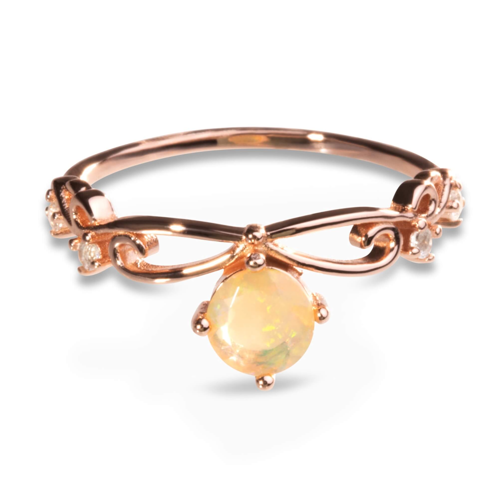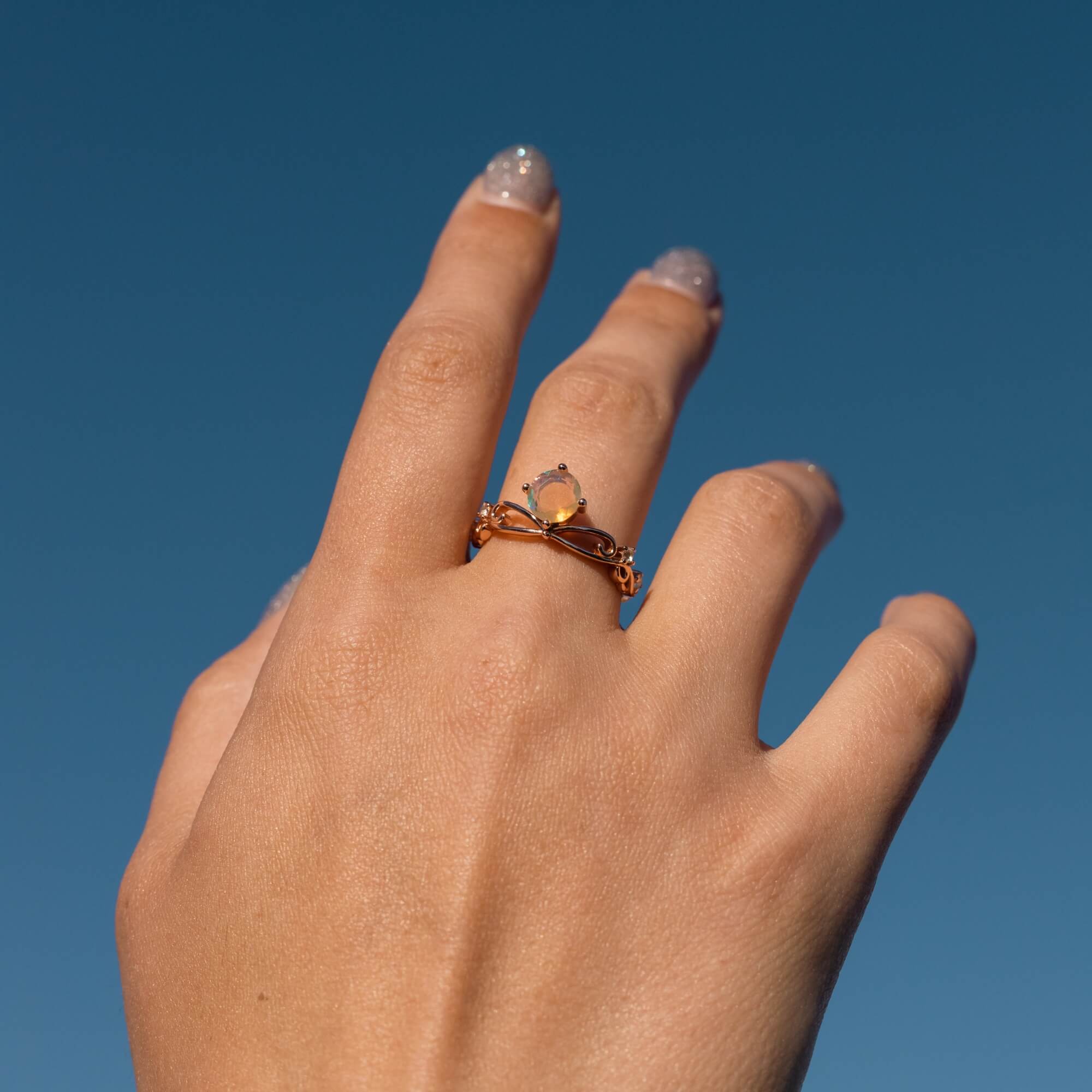Exquise zilveren ring, sierlijk verguld in roségoud en versierd met een magnetische natuurlijke opaal. Genesteld tussen vier glinsterende witte topaas edelstenen, is deze ring een harmonieuze mix van elegantie en allure. Het opaal, met zijn enorme en verleidelijke tinten, draagt een rijke symboliek van hoop, zuiverheid en waarheid in zich, waardoor dit stuk niet alleen een prachtig accessoire is, maar ook een betekenisvol accessoire.