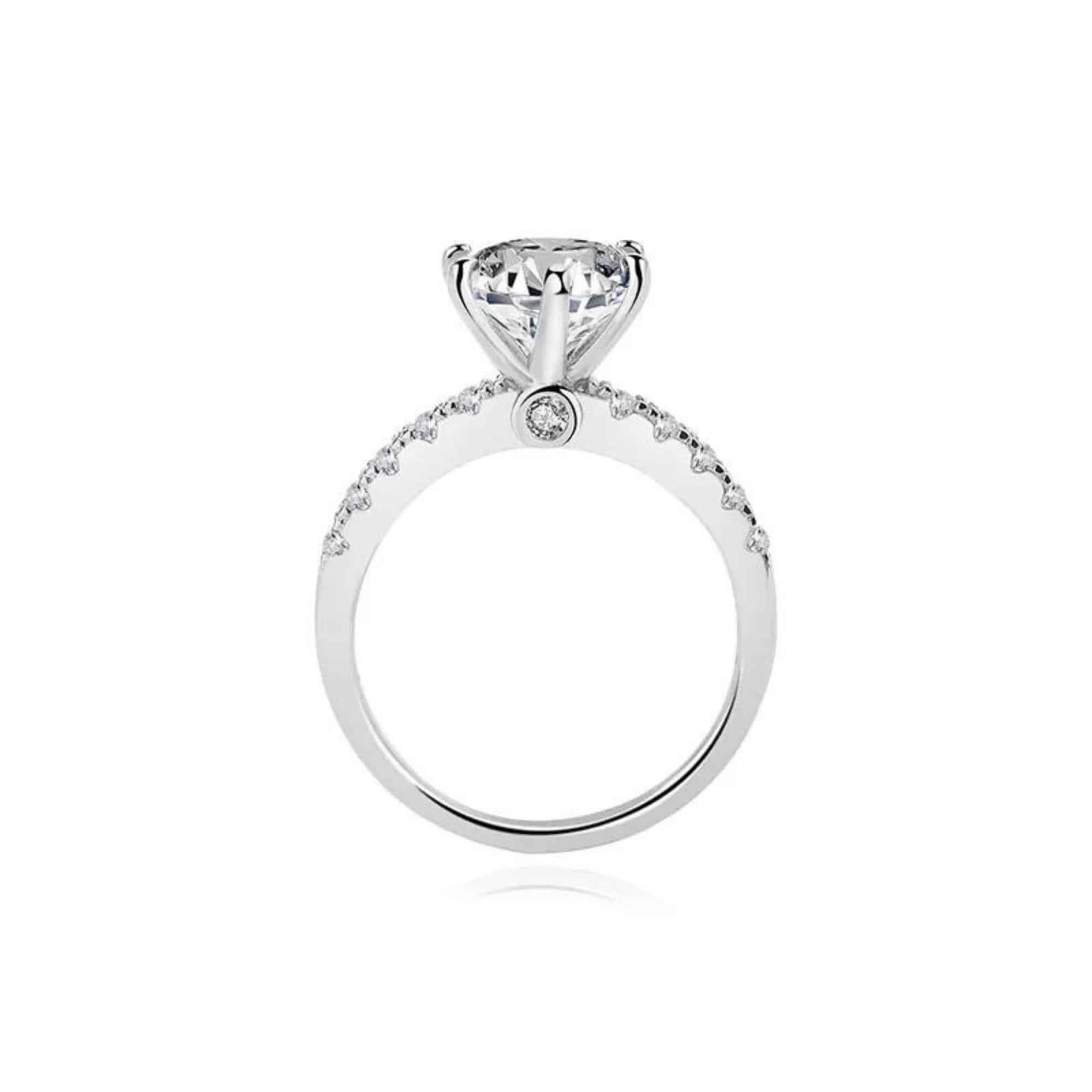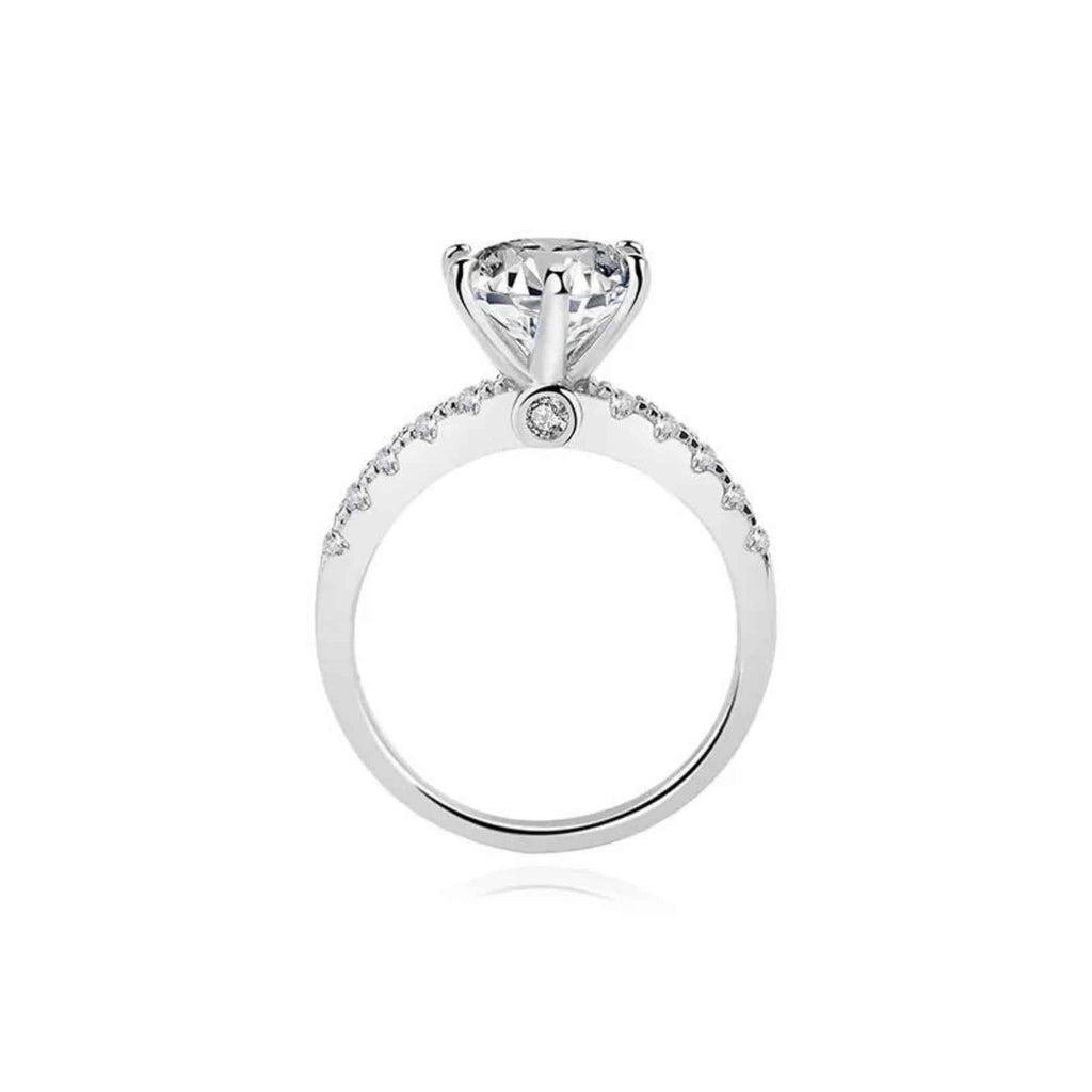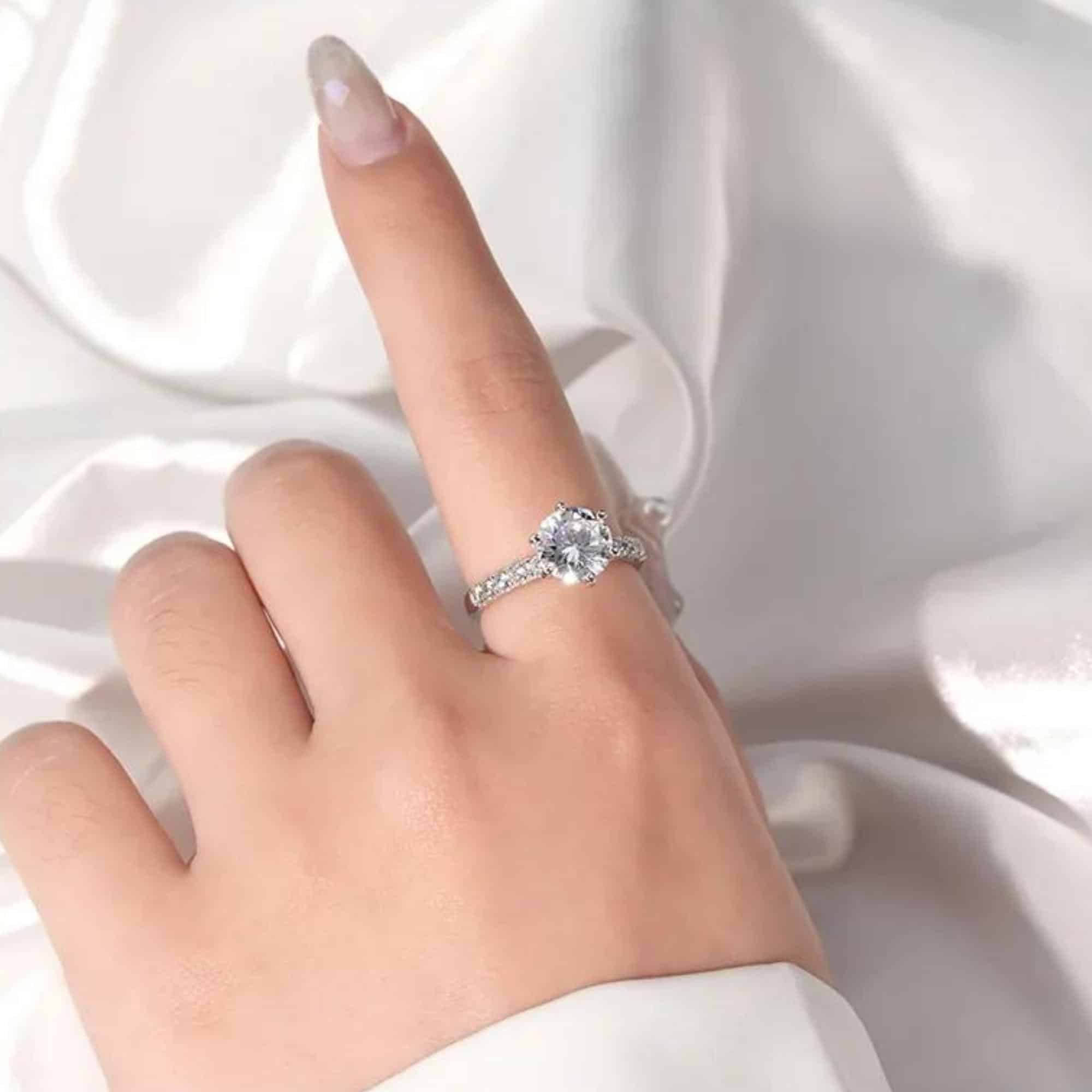 Laat je adem benemen door de betoverende charme van deze zilveren ring. In het hart ligt een schitterende moissanietsteen, bekend om zijn opvallende helderheid en schittering. Deze ring is een belofte van betovering, ideaal voor verlovingen of elk moment dat om een vleugje buitengewone schittering vraagt. De omliggende zirkoniastenen harmoniëren met het middelpunt en creëren een ensemble van ongeëvenaarde schoonheid.