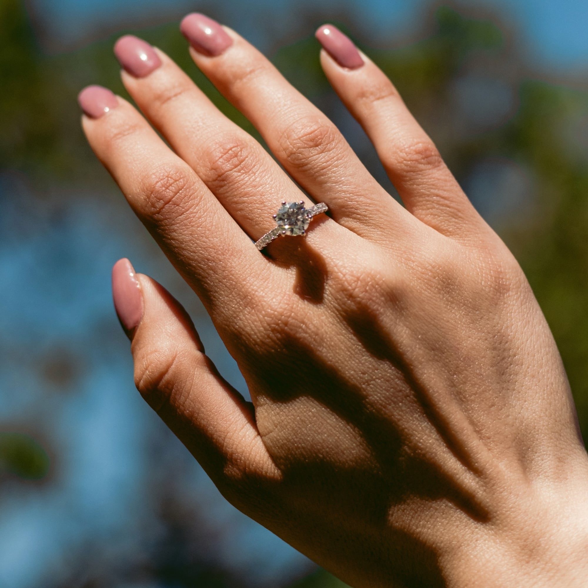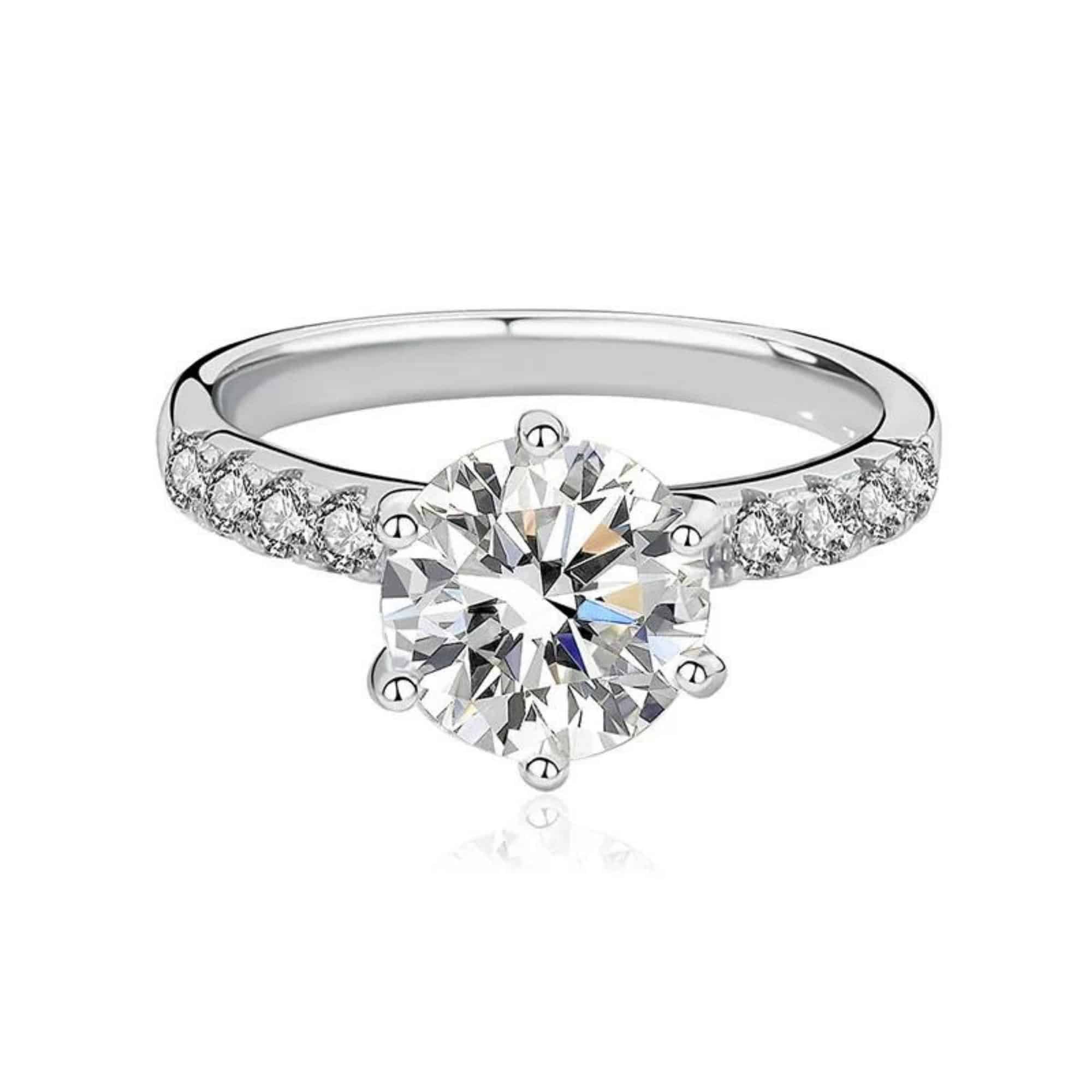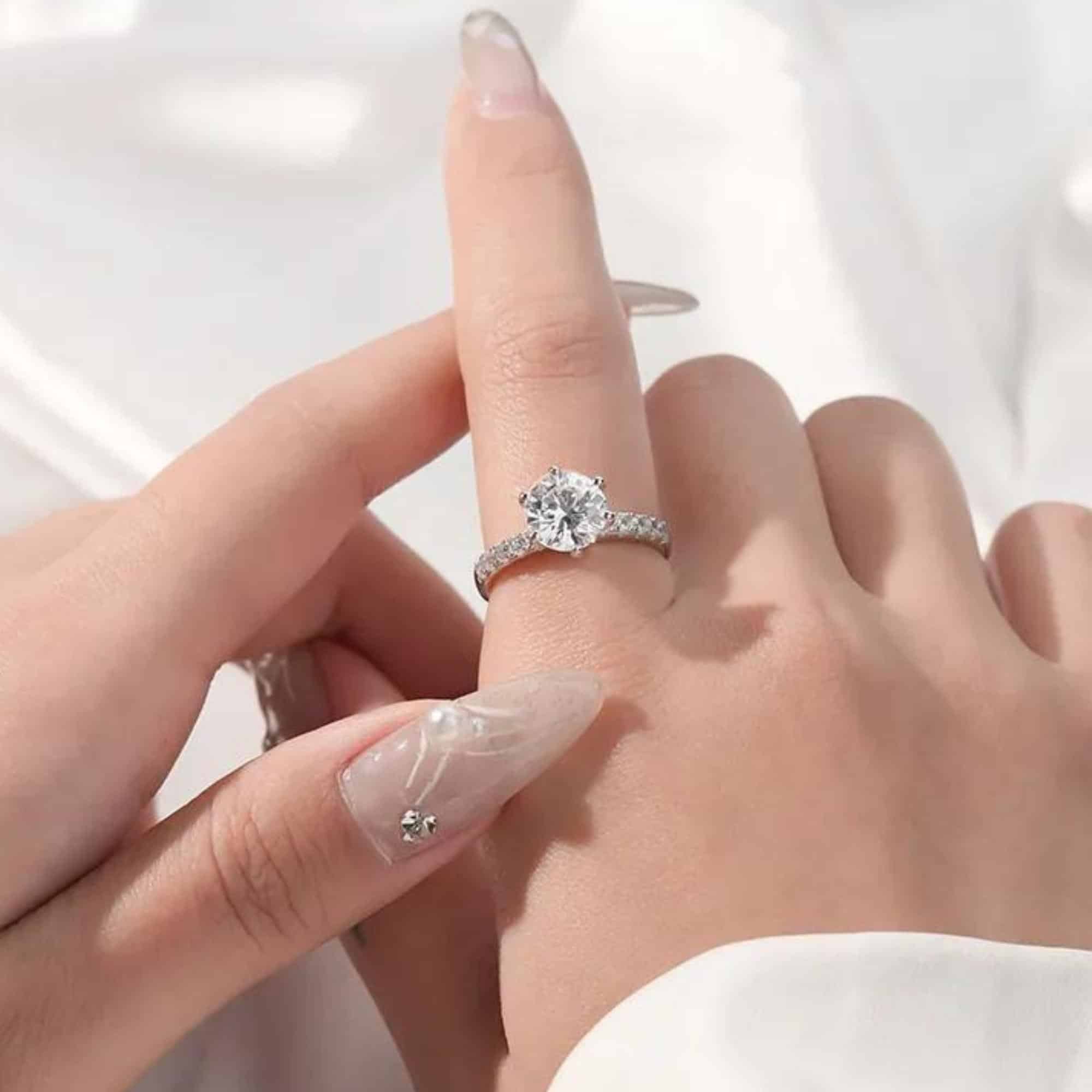 Laat je adem benemen door de betoverende charme van deze zilveren ring. In het hart ligt een schitterende moissanietsteen, bekend om zijn opvallende helderheid en schittering. Deze ring is een belofte van betovering, ideaal voor verlovingen of elk moment dat om een vleugje buitengewone schittering vraagt. De omliggende zirkoniastenen harmoniëren met het middelpunt en creëren een ensemble van ongeëvenaarde schoonheid.
