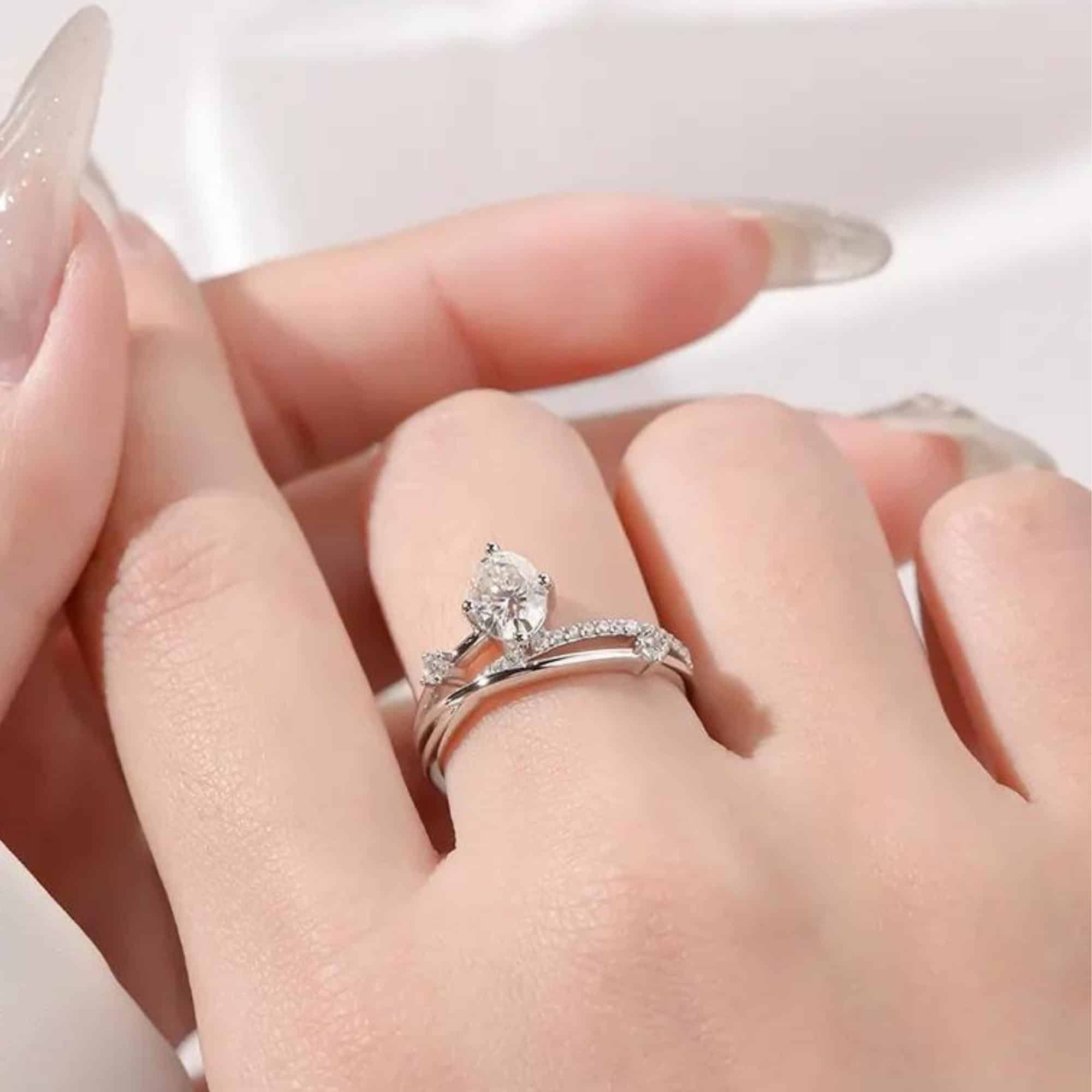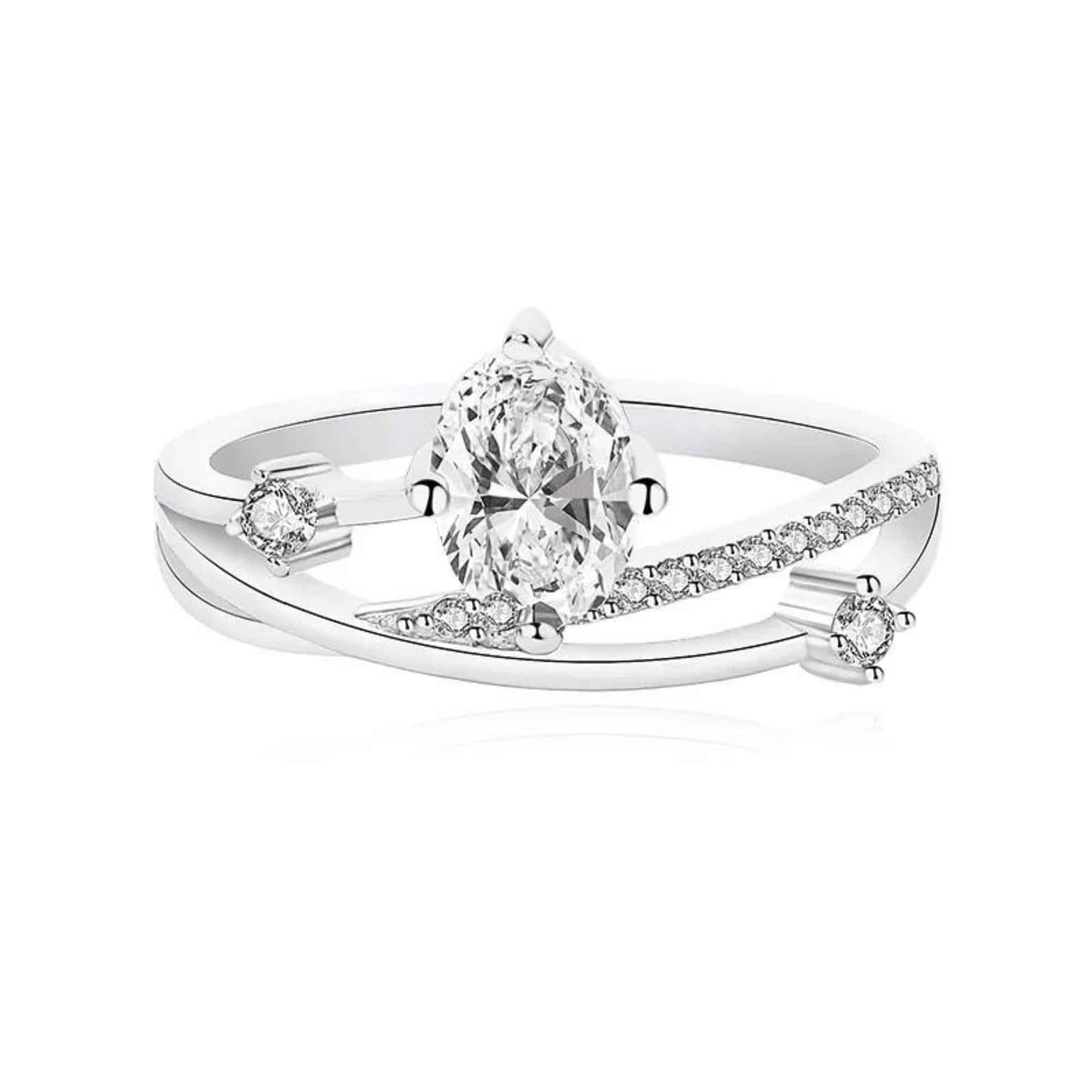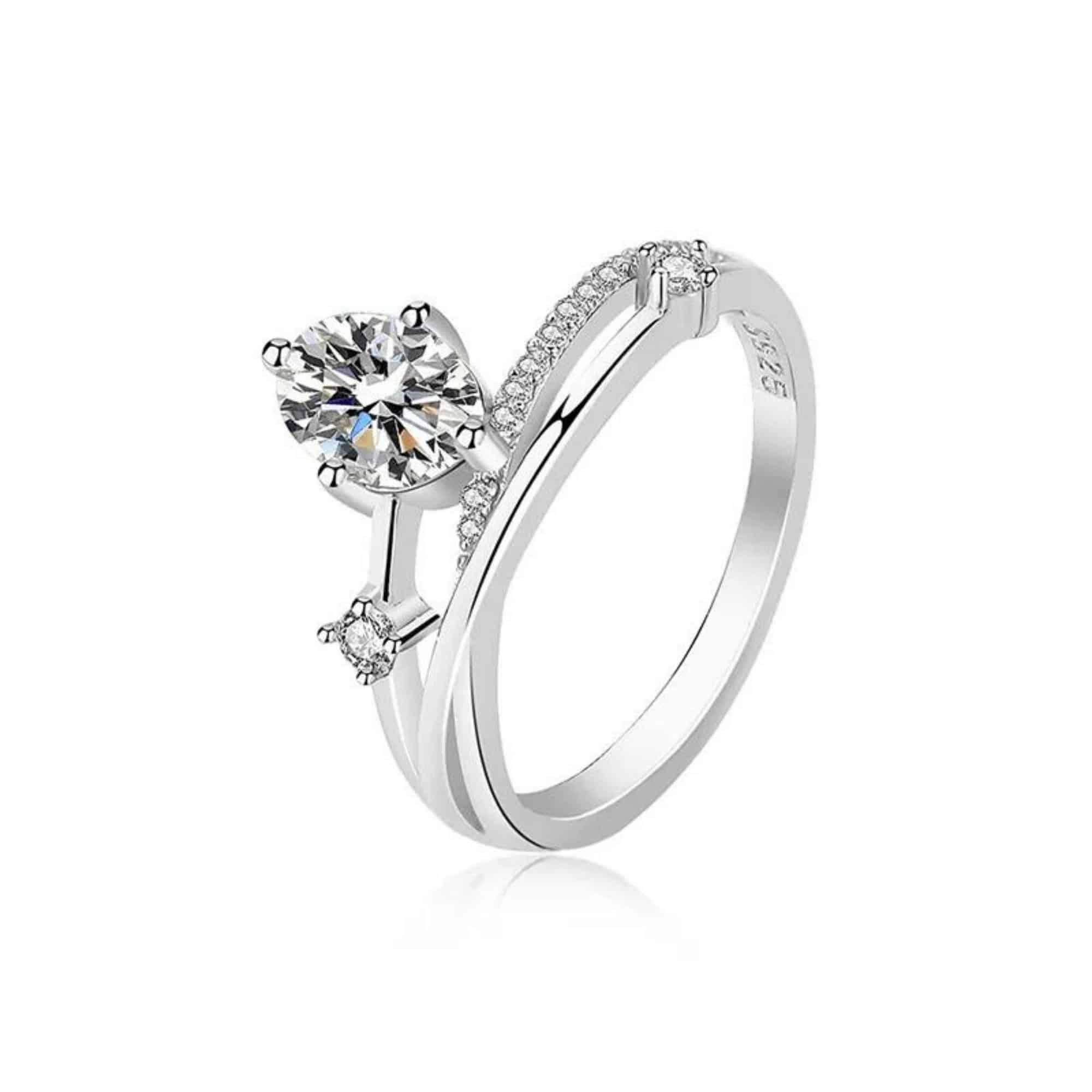 Ontdek de samensmelting van moderniteit en klassieke elegantie met onze zilveren "Comfort" ring. Dit prachtig ontworpen stuk bestaat uit een drietal verschillende banden, die elk bijdragen aan een dynamische asymmetrie. De banden zijn elegant versierd met zirkoniastenen, harmonieus gecontrasteerd met een glinsterend moissanite middenstuk. De ring is een bewijs van innovatief vakmanschap en biedt een mix van comfort en luxe.