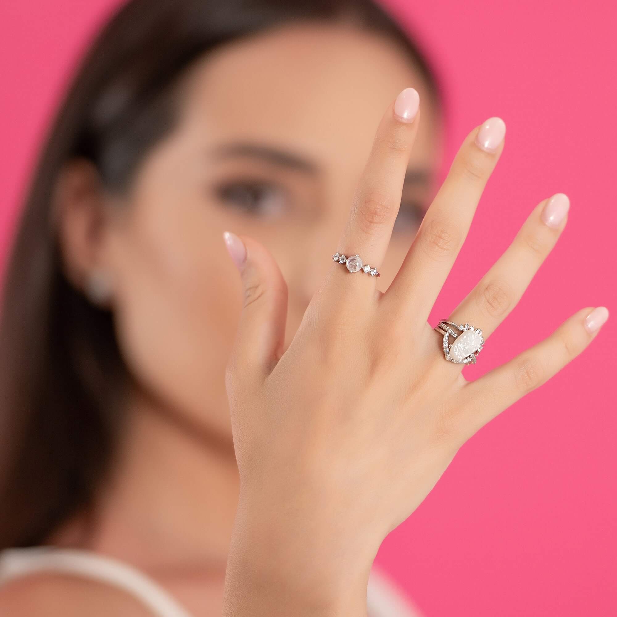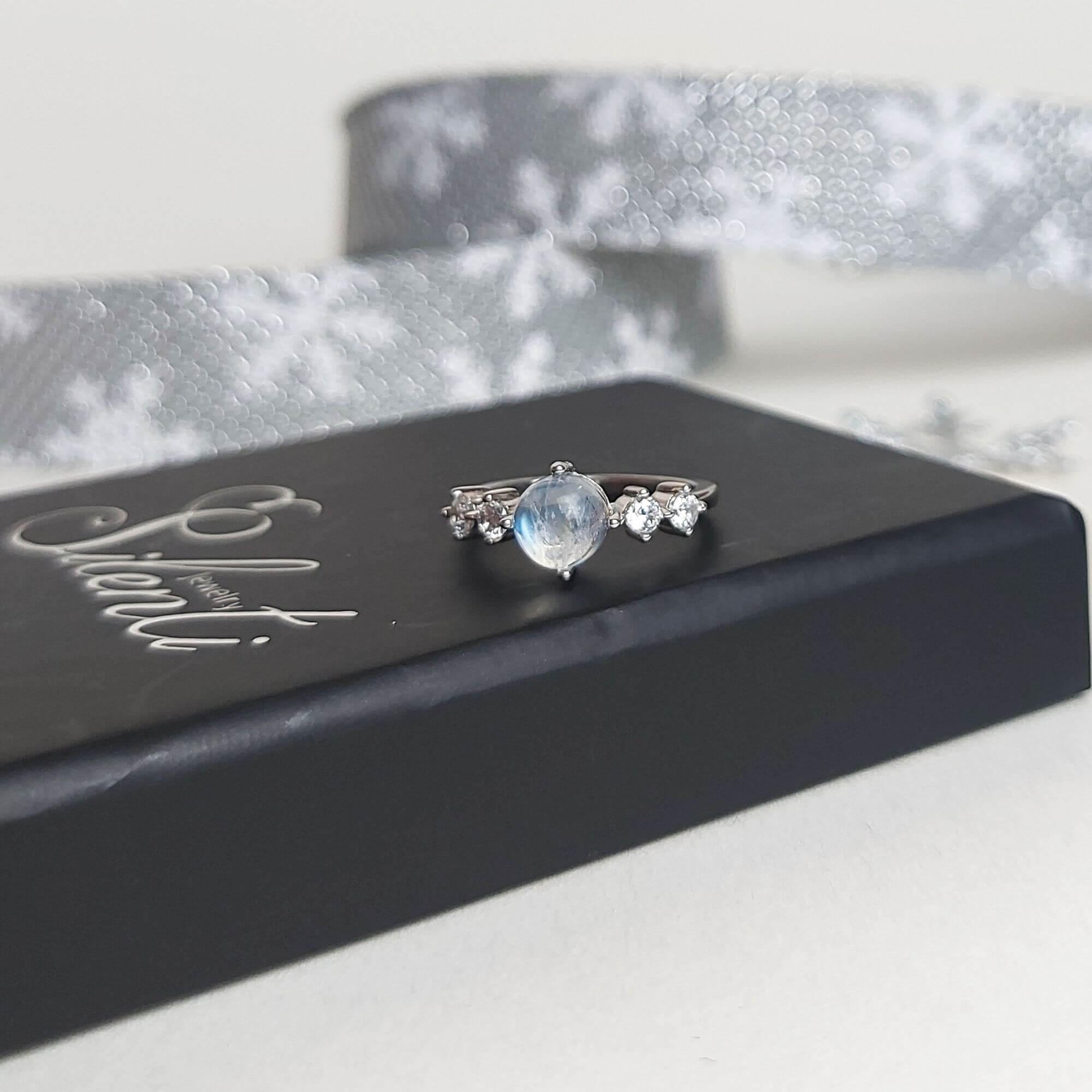 Omarm de allure van maan-elegantie met onze sterlingzilveren ring, met een majestueuze natuurlijke maansteen AA+. Deze edelsteen, gevormd in een perfecte ovaal, wordt aangevuld met twee kleinere topaasstenen, waardoor een symmetrische balans ontstaat. De ring is een bewijs van glamour en draagt de mystiek van de maan en de gratie van de nachtelijke hemel in zich, waardoor het een opvallende aanvulling is op je sieradencollectie.