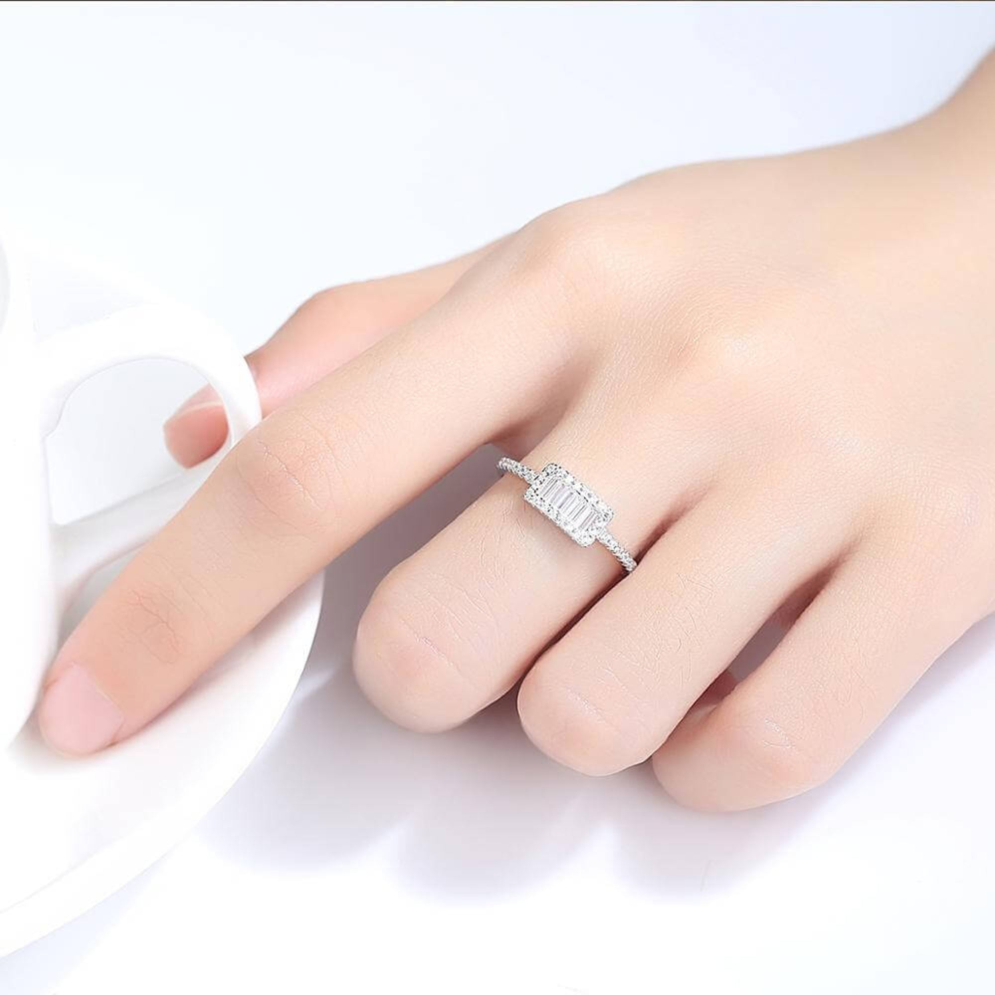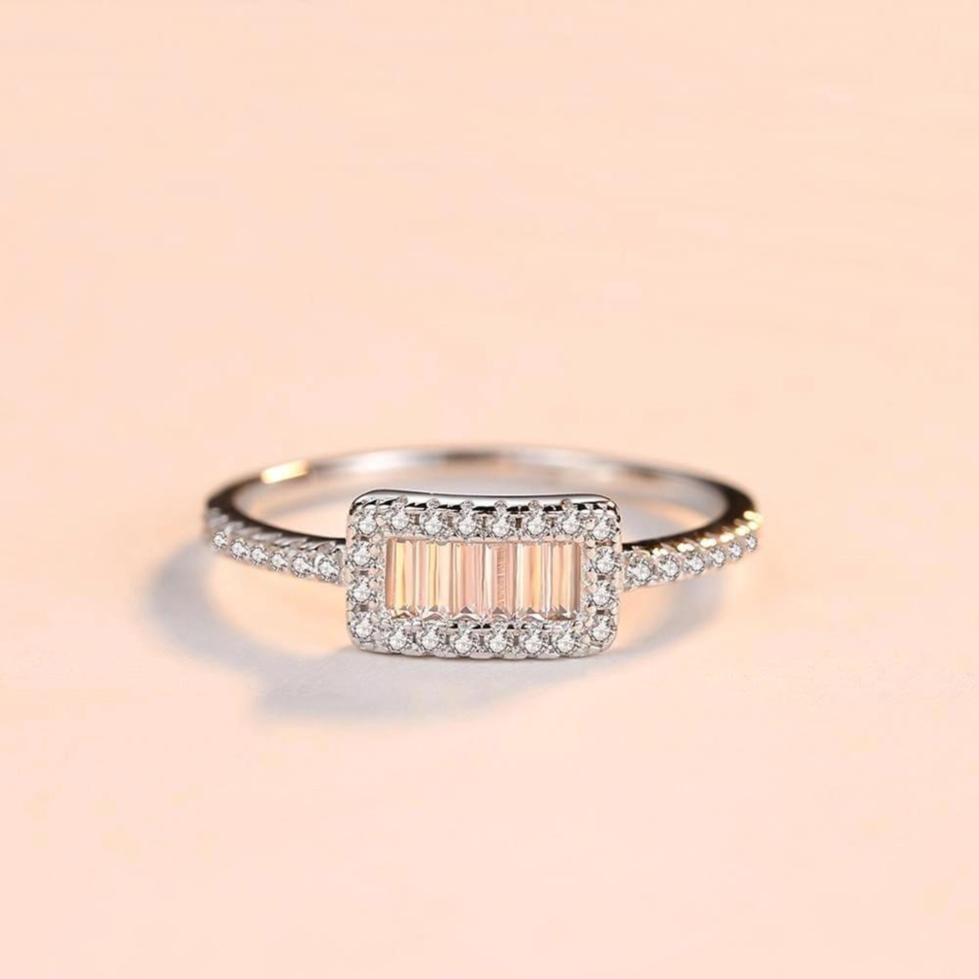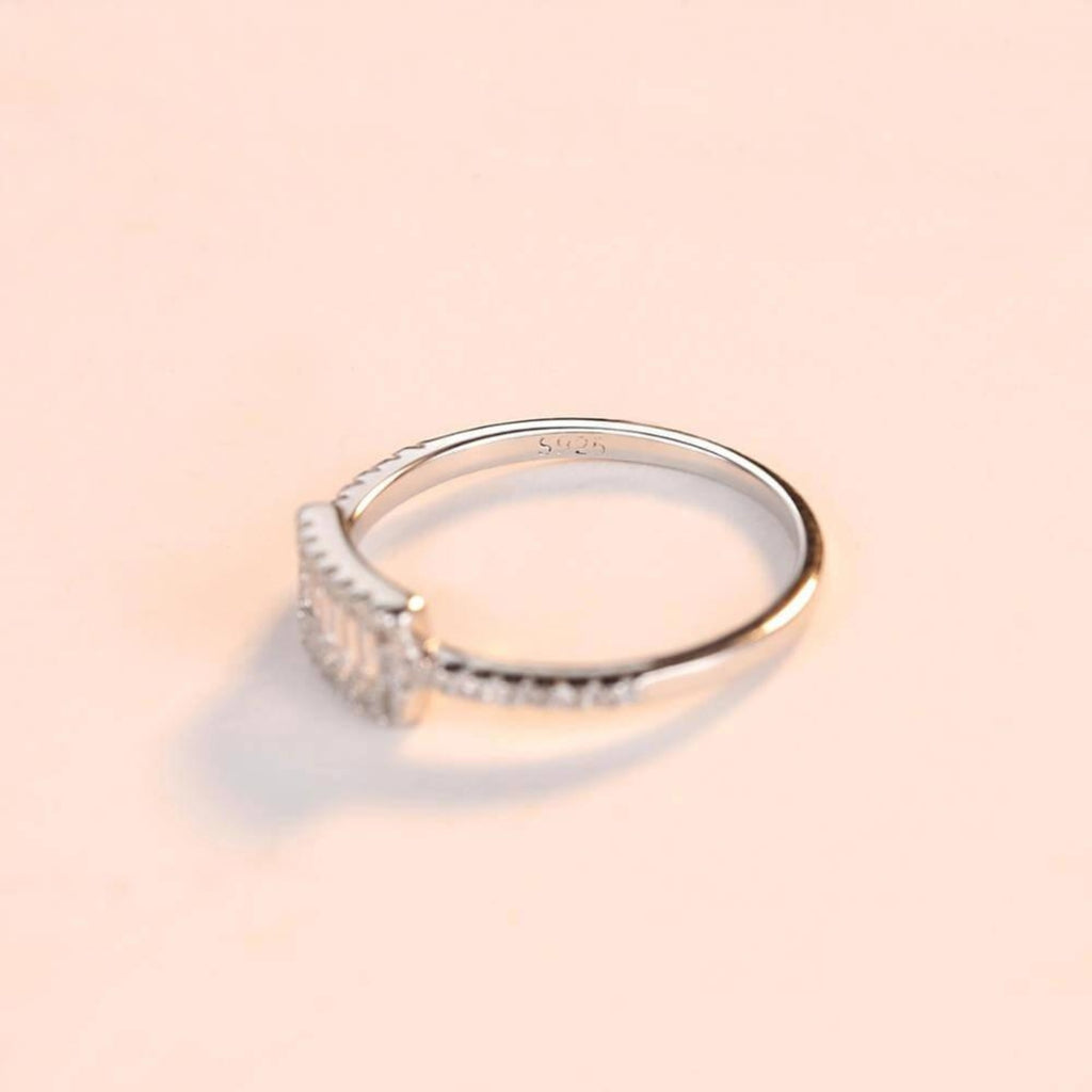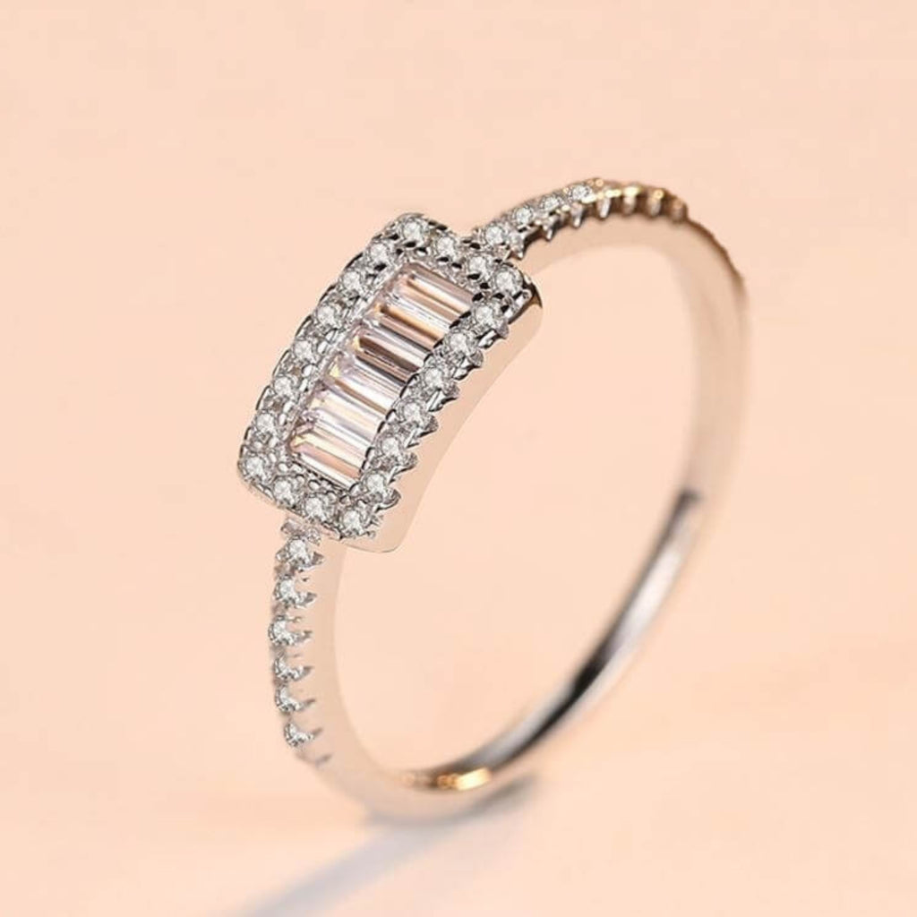 Ontdek de allure van verfijnde eenvoud met onze zilveren ring, een schat die sierlijk een rechthoekig zirkonia-middenstuk omhult. Geflankeerd door een reeks kleinere kristallen, danst deze ring met licht en werpt een boeiende betovering van helderheid uit. Het uitgebalanceerde ontwerp maakt het een ideale aanvulling op zowel alledaagse elegantie als speciale gelegenheden, en overbrugt de kloof tussen casual gratie en formele pracht.