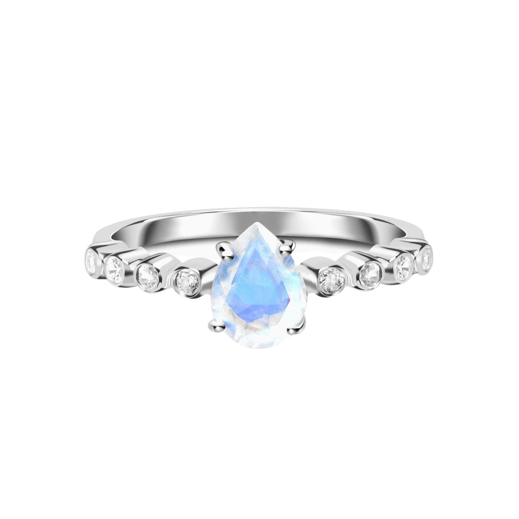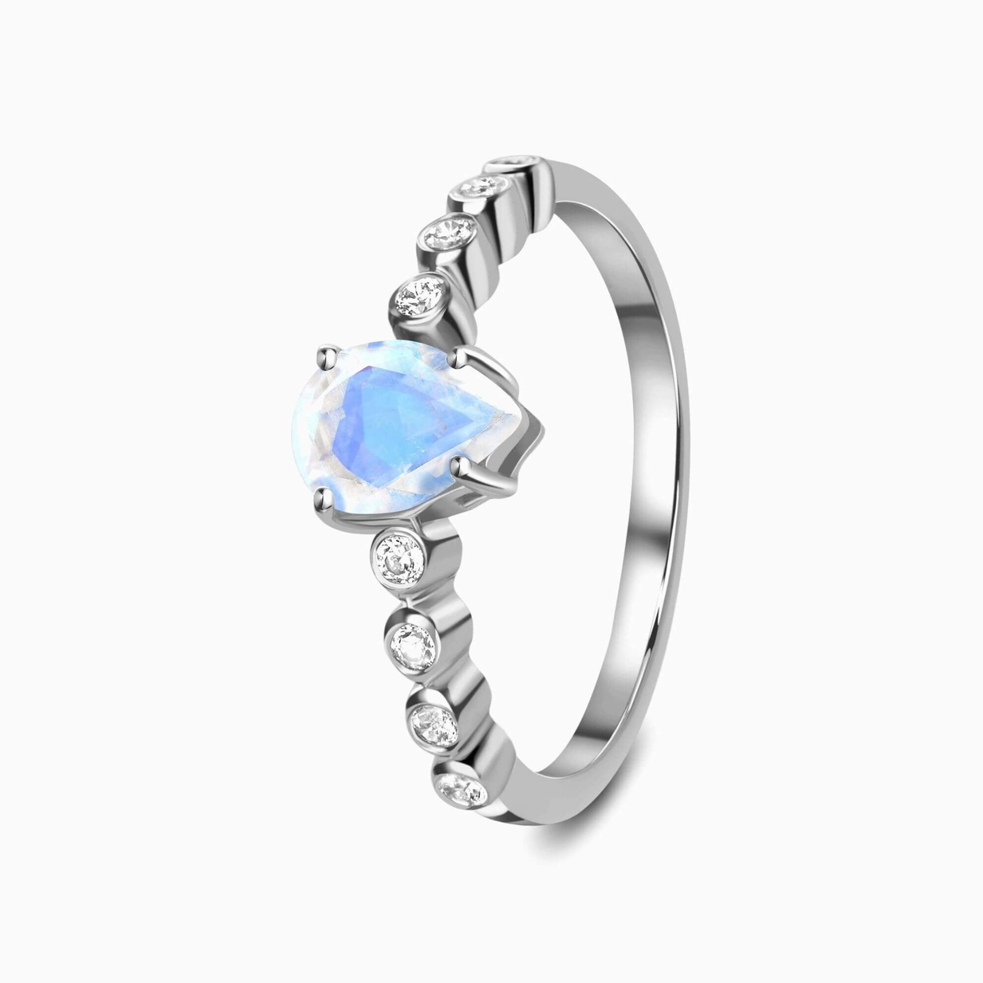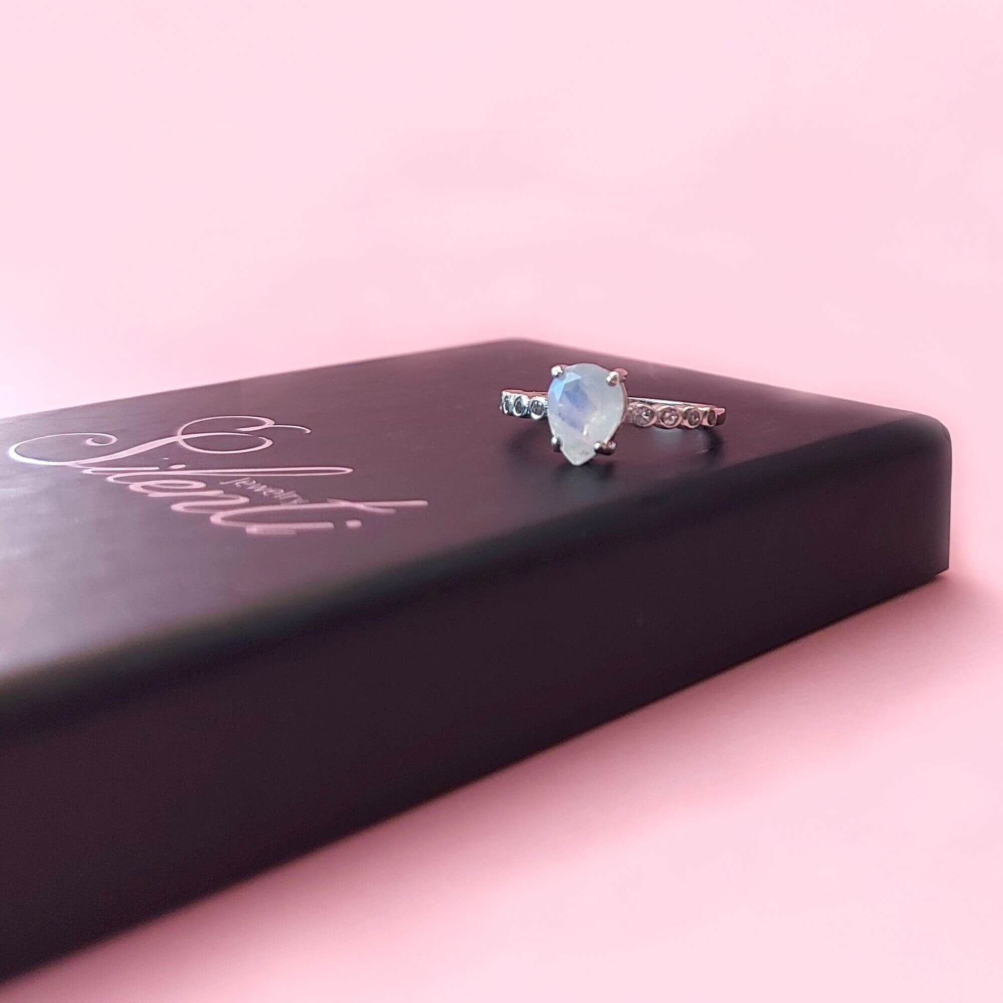 Ontdek de betoverende schoonheid van onze zilveren ring met een natuurlijke maansteen in druppelvorm, geflankeerd door vier ronde topaasstenen aan elke kant. Deze ring is een symfonie van elegantie, waarbij de charme van natuurlijke edelstenen wordt gecombineerd tot een ontwerp dat harmonie en verfijning uitstraalt.