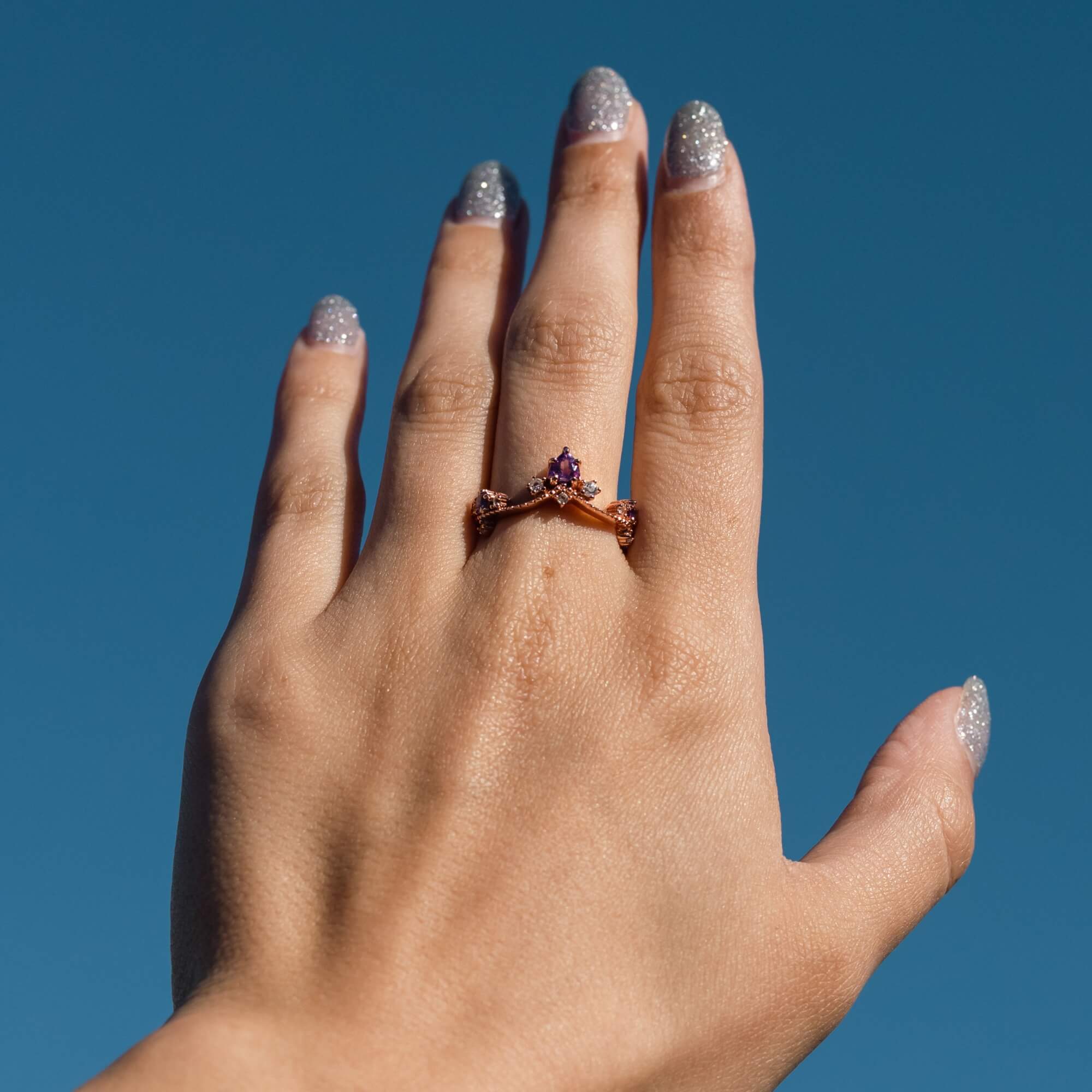 Elk facet van deze ring is speciaal ontworpen om te harmoniëren met je kleurrijke kleding, waardoor een vleugje elegantie wordt toegevoegd dat zeker de aandacht zal trekken en gesprekken zal opwekken. Laat de betoverende amethisten resoneren met je innerlijke spiritualiteit en verhoog je stijl met een stuk dat net zo uniek en boeiend is als jij.