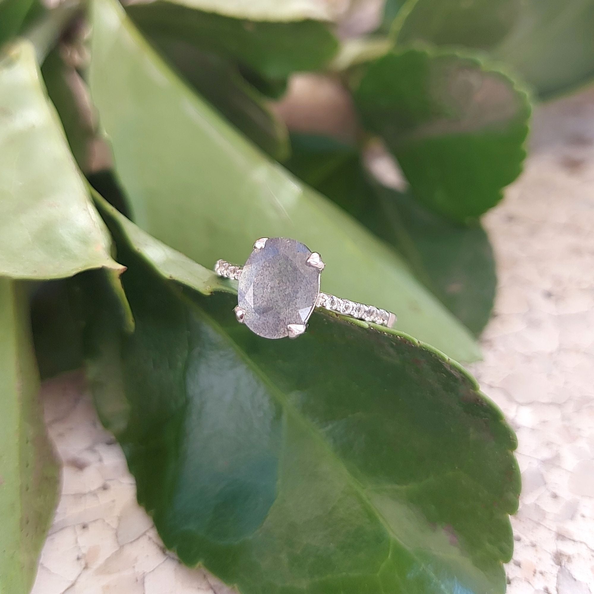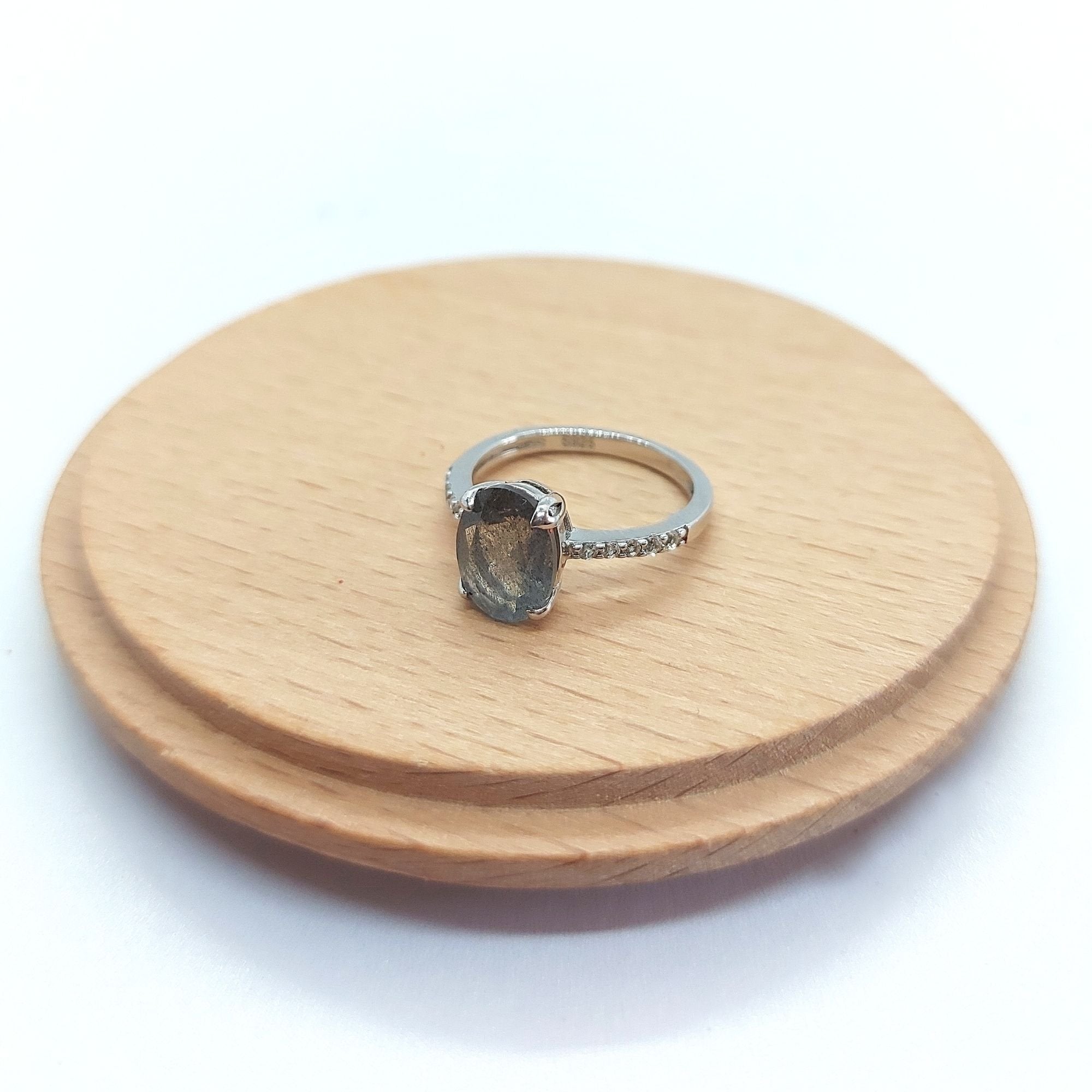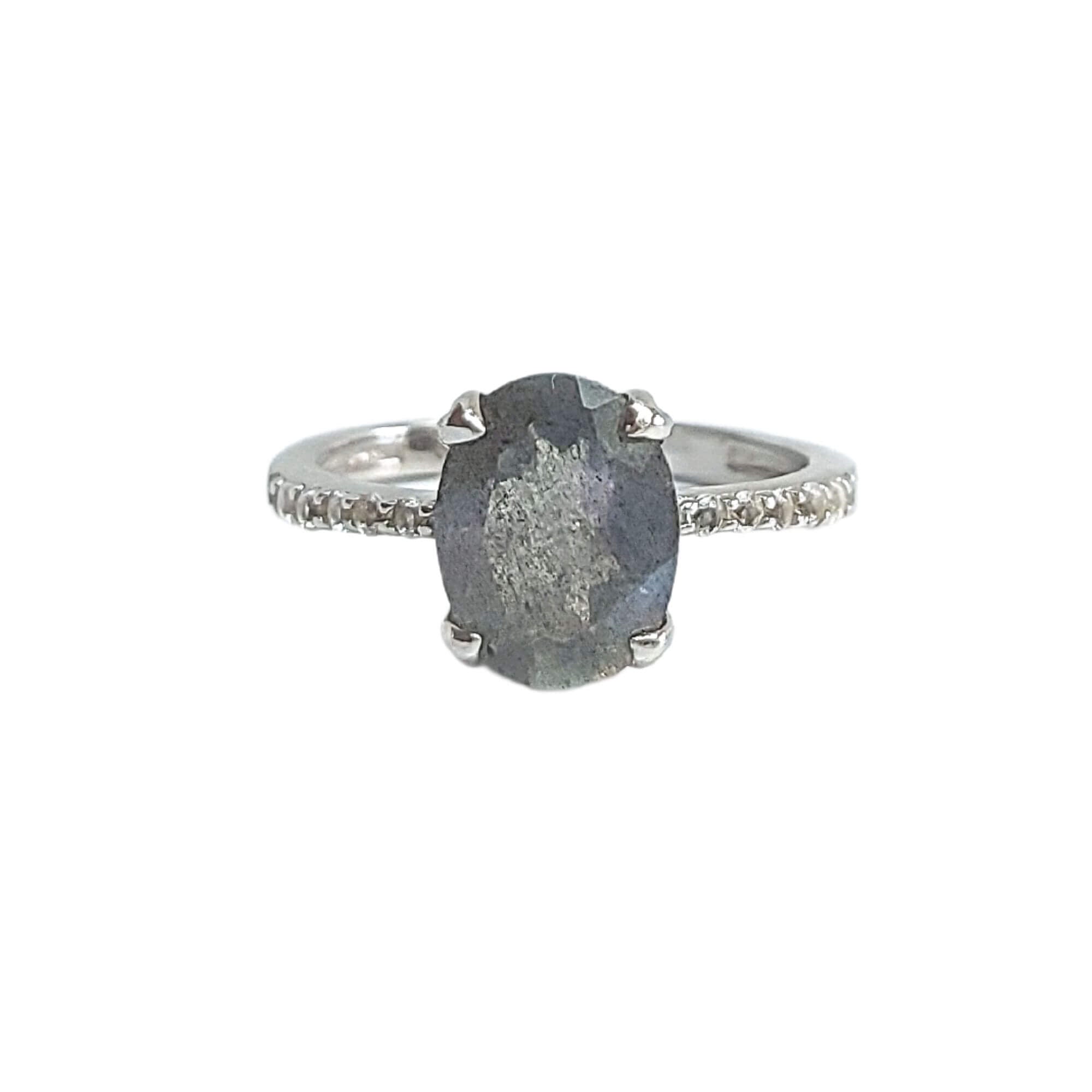 Ervaar de betovering van het uitzonderlijke natuurlijke mineraal Labradoriet, afkomstig uit Canada en bekend als de steen van het magische noorderlicht. Bekend om het absorberen van de stralingsenergie van het gelijknamige fenomeen, wordt aangenomen dat labradoriet innerlijke vrede en rust bij de dragers inboezemt. Als aanvulling op zijn mystieke charme is de ring versierd met elegante topaas edelstenen, waardoor een opvallend evenwicht ontstaat tussen etherische schoonheid en verfijnde elegantie.