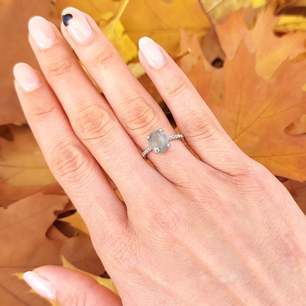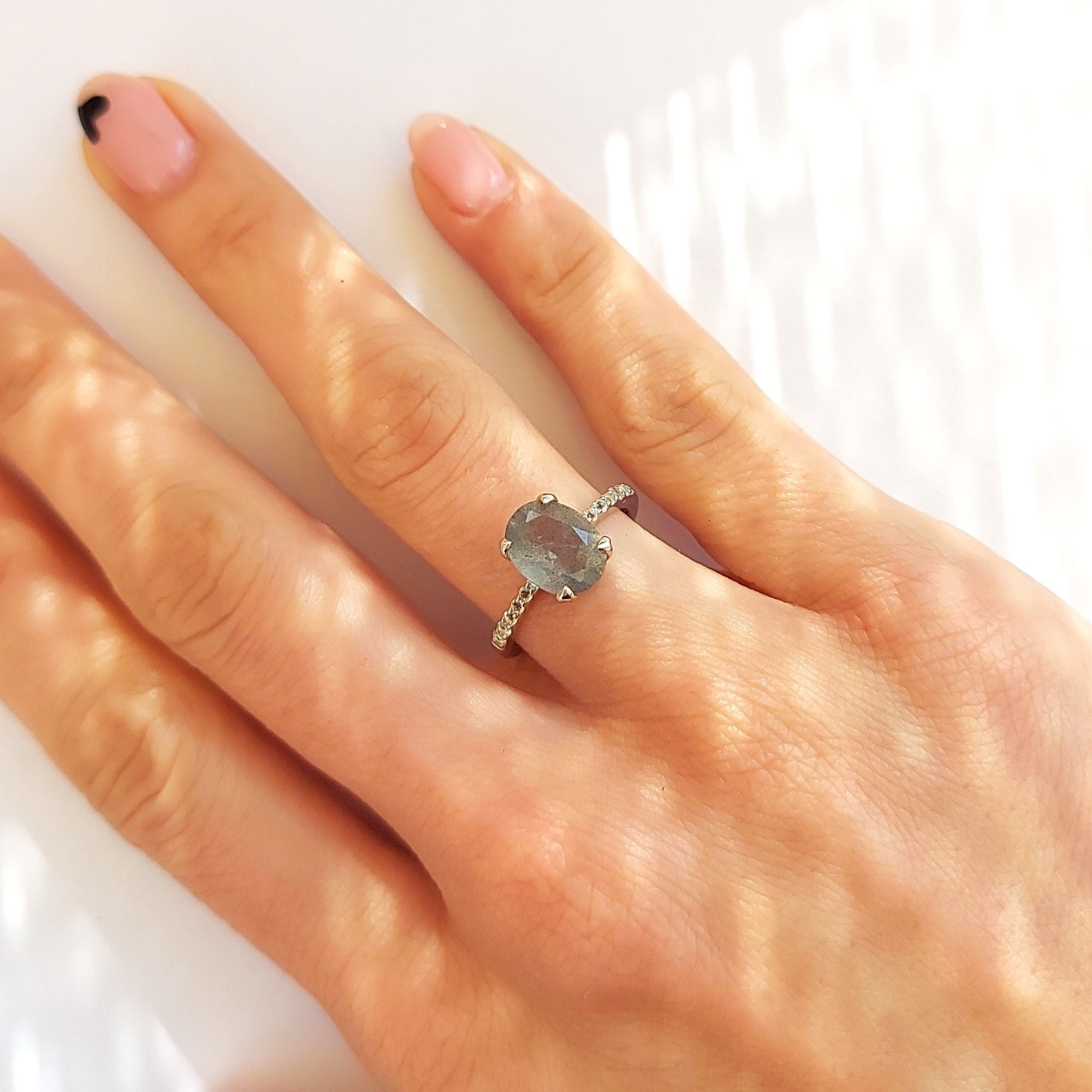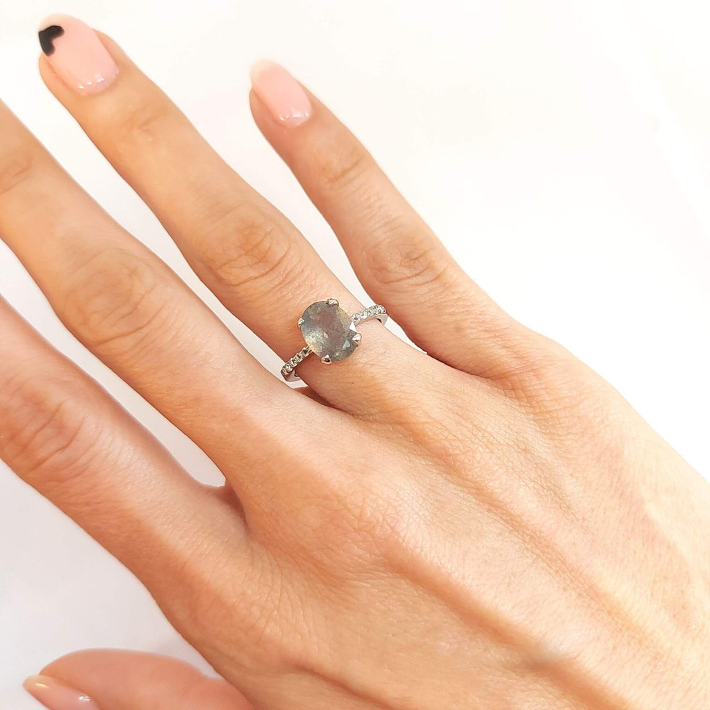 Ervaar de betovering van het uitzonderlijke natuurlijke mineraal Labradoriet, afkomstig uit Canada en bekend als de steen van het magische noorderlicht. Bekend om het absorberen van de stralingsenergie van het gelijknamige fenomeen, wordt aangenomen dat labradoriet innerlijke vrede en rust bij de dragers inboezemt. Als aanvulling op zijn mystieke charme is de ring versierd met elegante topaas edelstenen, waardoor een opvallend evenwicht ontstaat tussen etherische schoonheid en verfijnde elegantie.
