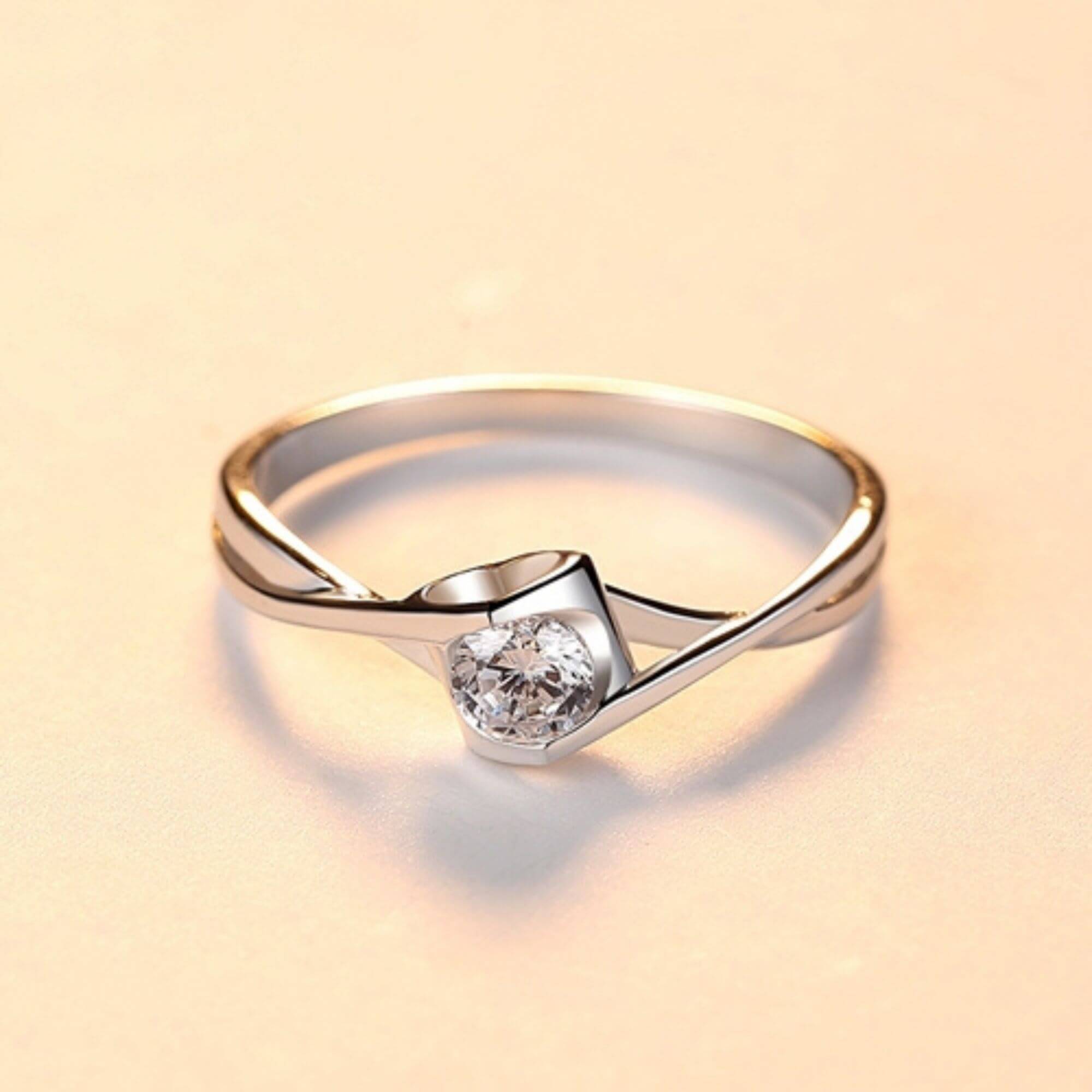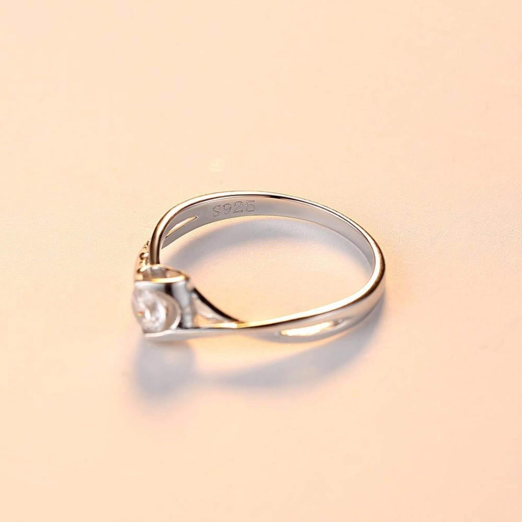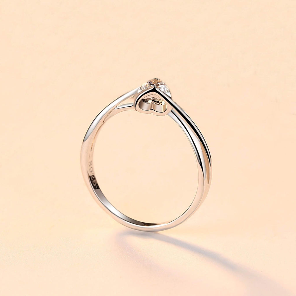 Stap in elegantie met deze sterlingzilveren ring, met een in elkaar grijpende basis die sierlijk een glinsterende zirkonia vasthoudt. Aan weerszijden van de centrale edelsteen voegen ingewikkeld uitgesneden hartvormige details een vleugje romantiek en finesse toe. Deze ring is een perfecte mix van stijl en complexiteit, een bewijs van voortreffelijk vakmanschap.