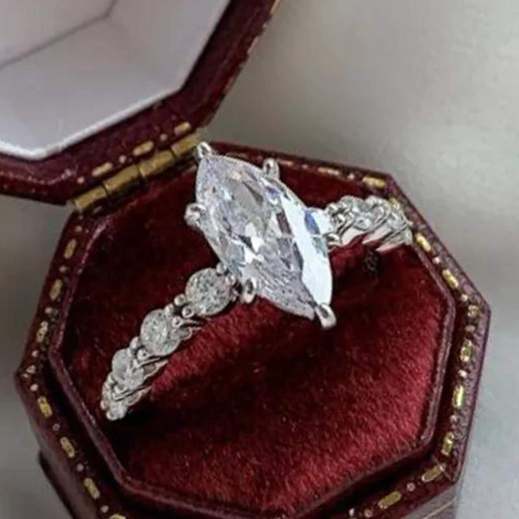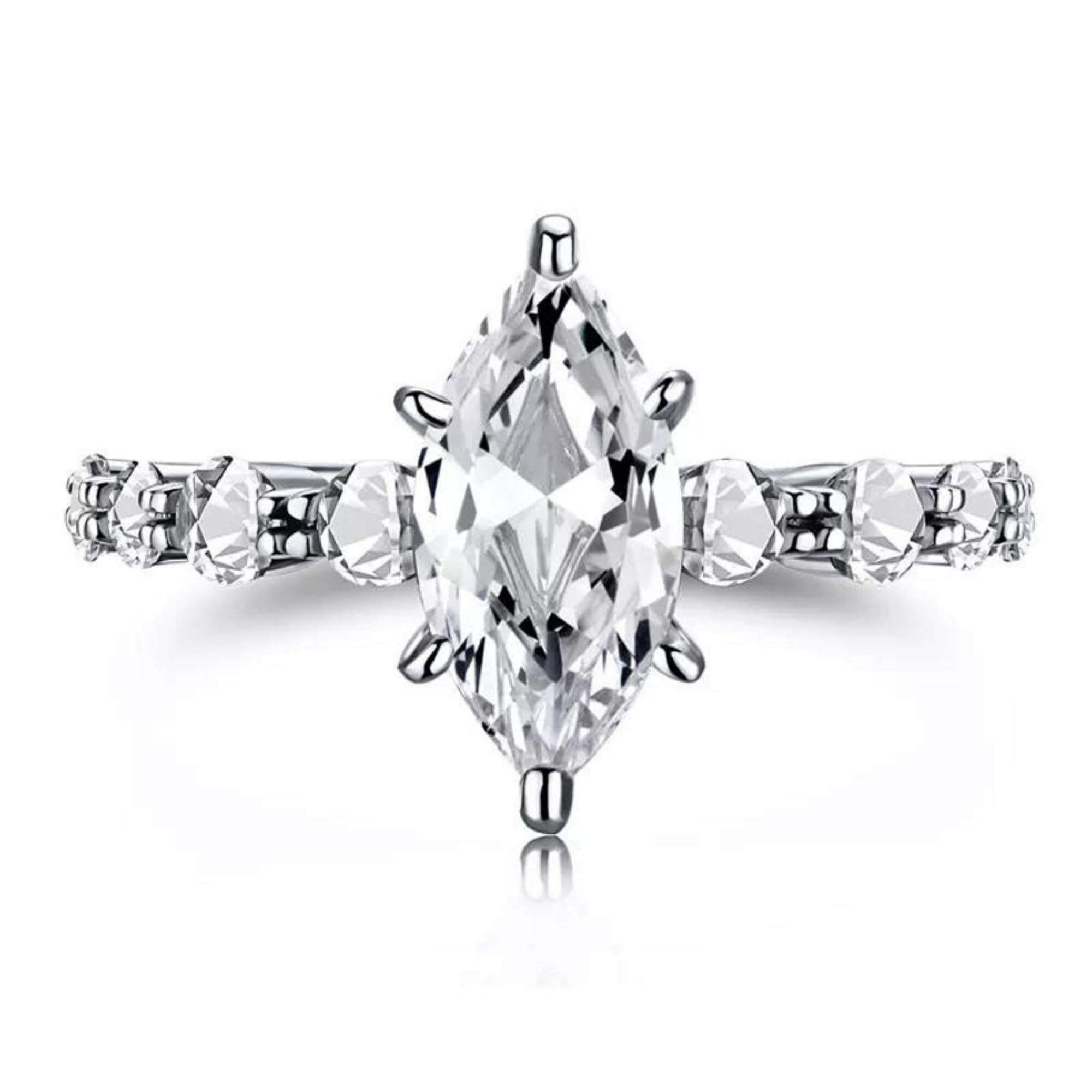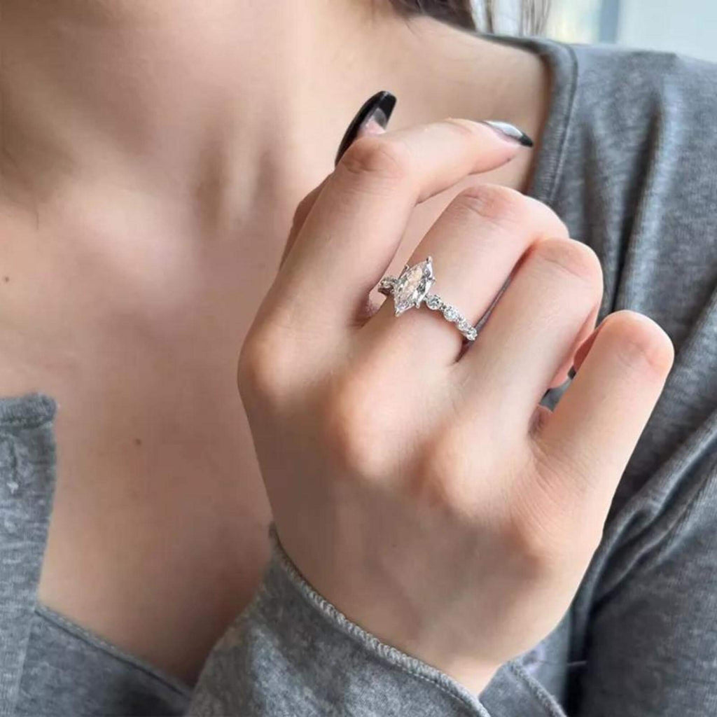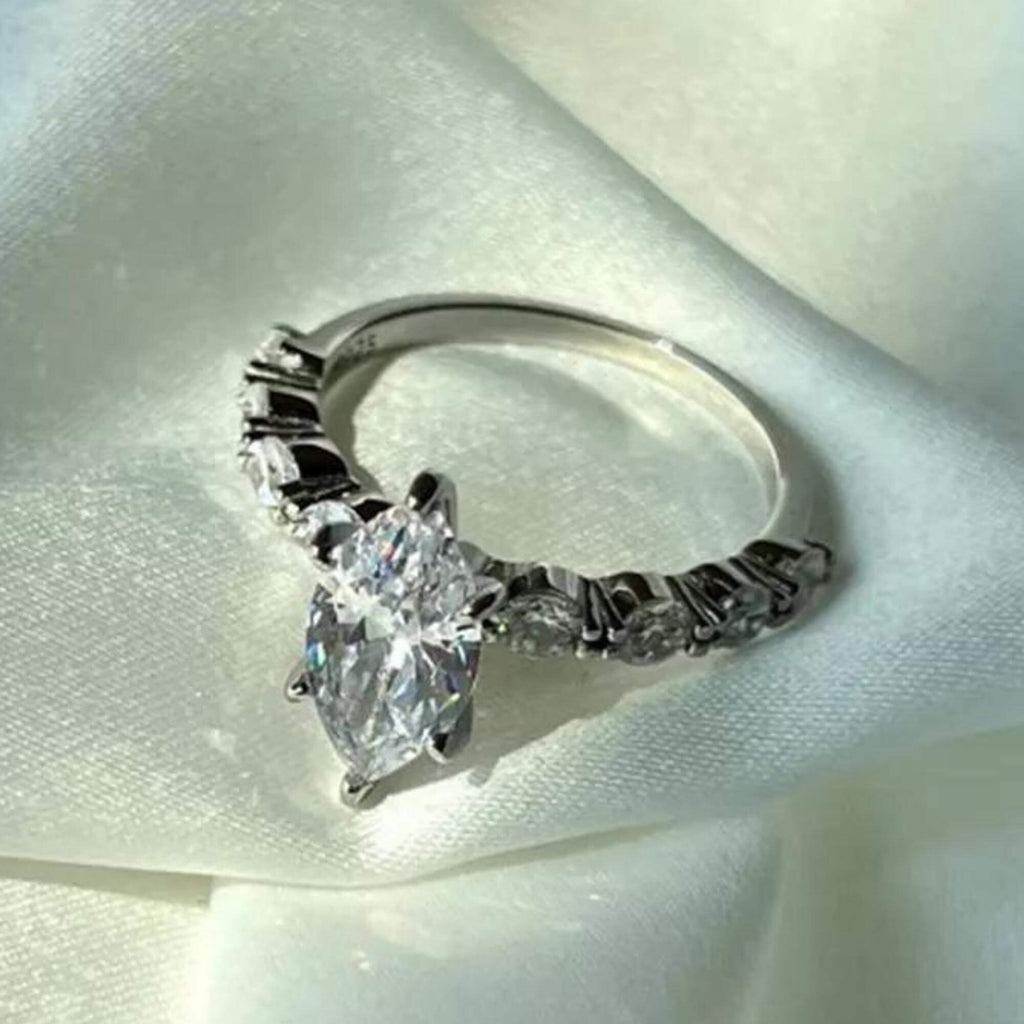 Bereid je voor om betoverd te worden door de pure pracht van deze zilveren ring met een prachtige moissanietsteen, uitgehouwen in de zeldzame en verleidelijke Marquise Cut. Met zijn uitzonderlijke duurzaamheid en adembenemende schittering concurreert moissanite met die van diamanten, waardoor het een echt juweeltje is voor het veeleisende oog. De zijkanten van de hoofdedelsteen zijn versierd met acht fonkelende zirkoniastenen, die een extra vleugje elegantie en glamour toevoegen. Dit voortreffelijke stuk is een schat om te zien, perfect voor degenen die de schoonheid van fijne sieraden waarderen en een blijvende indruk willen maken.