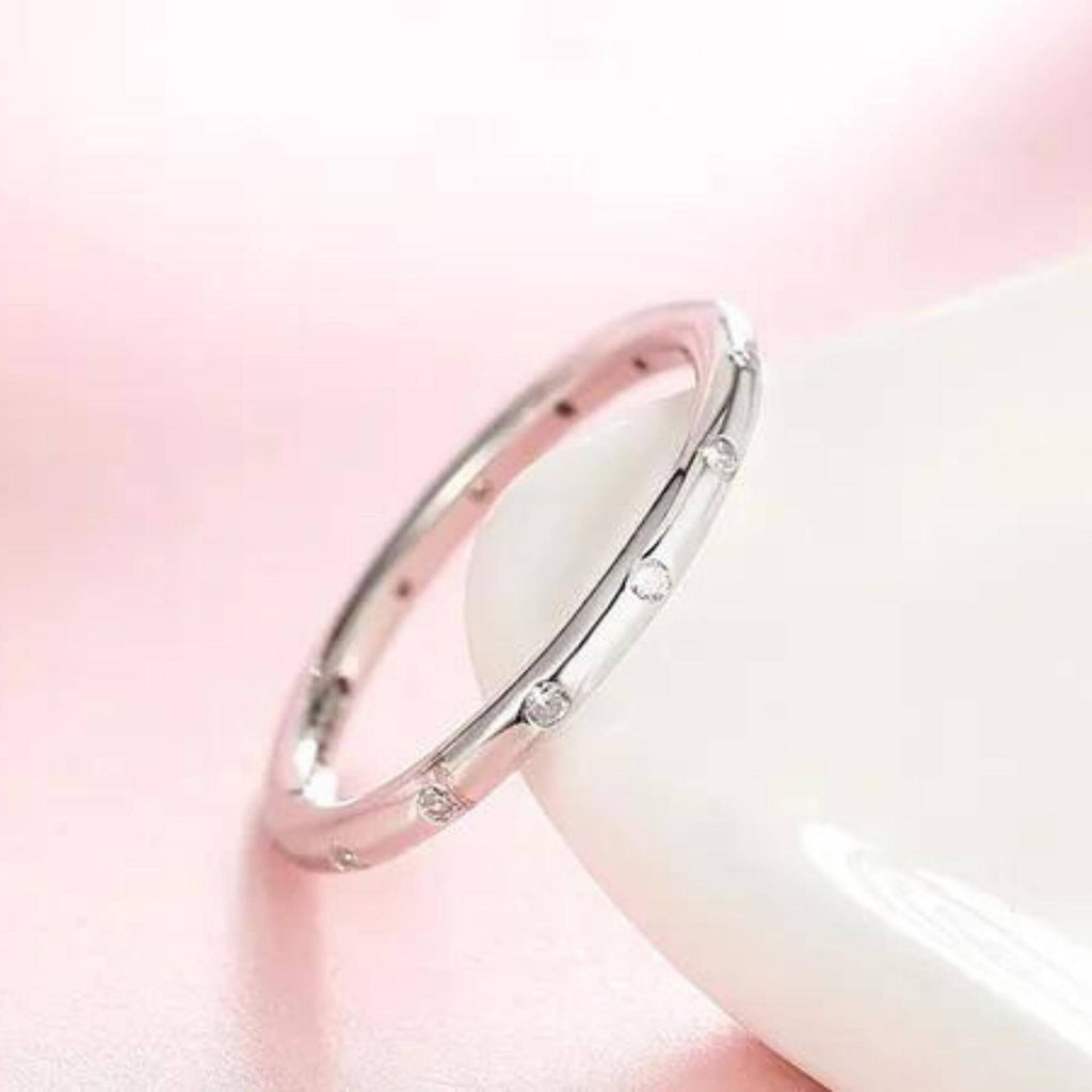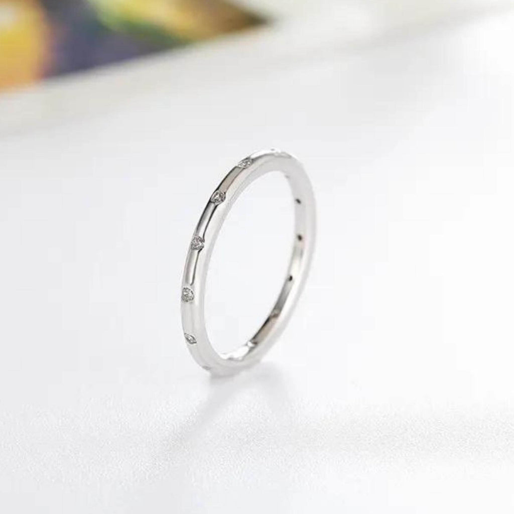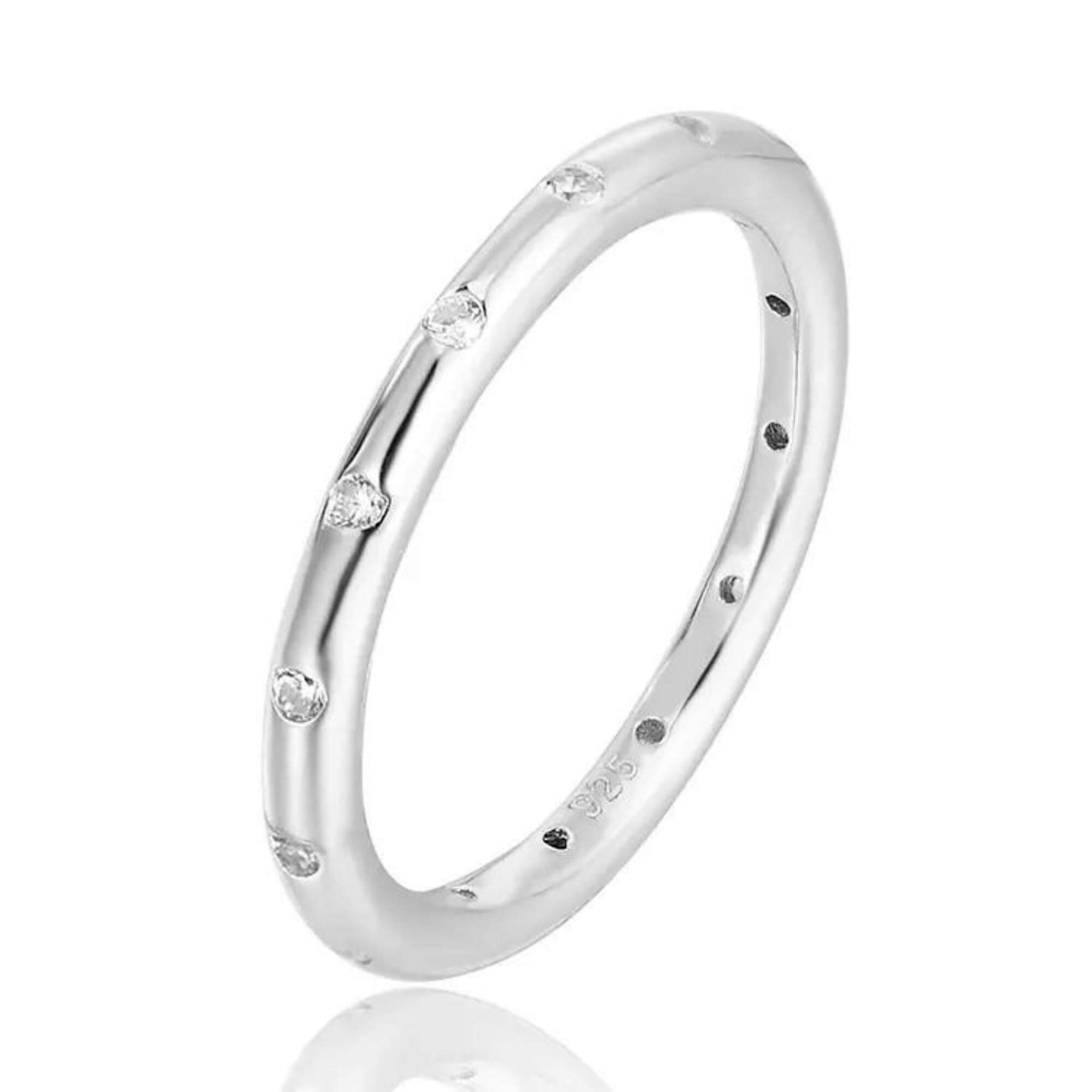 Deze zilveren ring is een meesterwerk van understatement, versierd met 14 zirkonia-edelstenen die de band omringen. Het ontwerp spreekt boekdelen in subtiele tinten en vormt een verfijnd statement van verfijning. Ideaal voor degenen die geloven in de kracht van minimalisme, het is een bewijs van de elegantie die gevonden wordt in eenvoud.