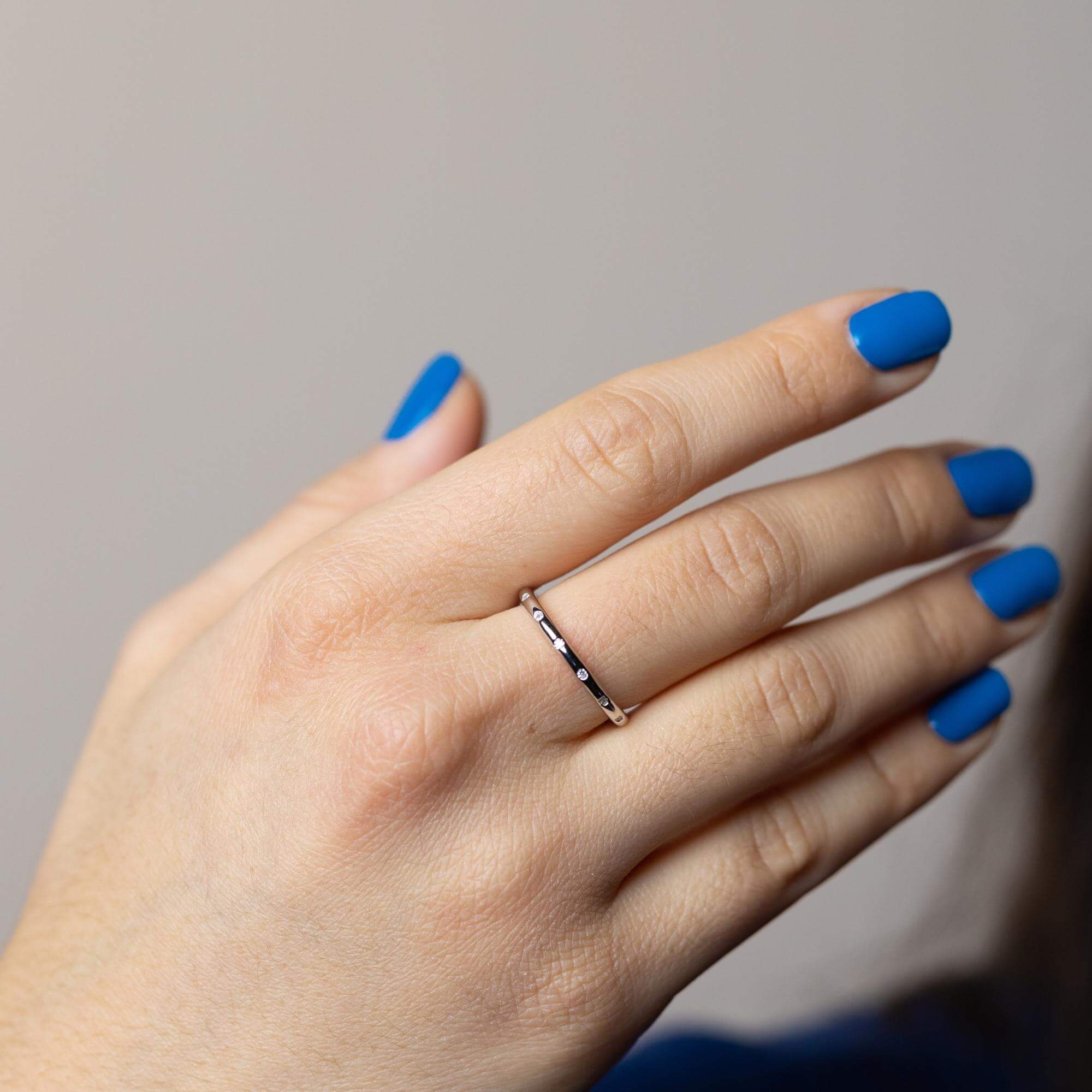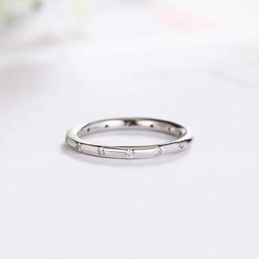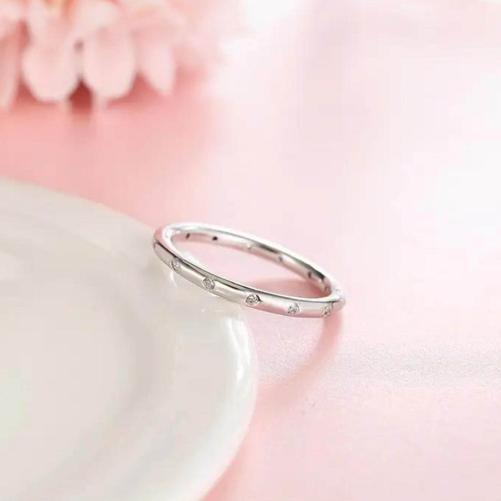 Deze zilveren ring is een meesterwerk van understatement, versierd met 14 zirkonia-edelstenen die de band omringen. Het ontwerp spreekt boekdelen in subtiele tinten en vormt een verfijnd statement van verfijning. Ideaal voor degenen die geloven in de kracht van minimalisme, het is een bewijs van de elegantie die gevonden wordt in eenvoud.
