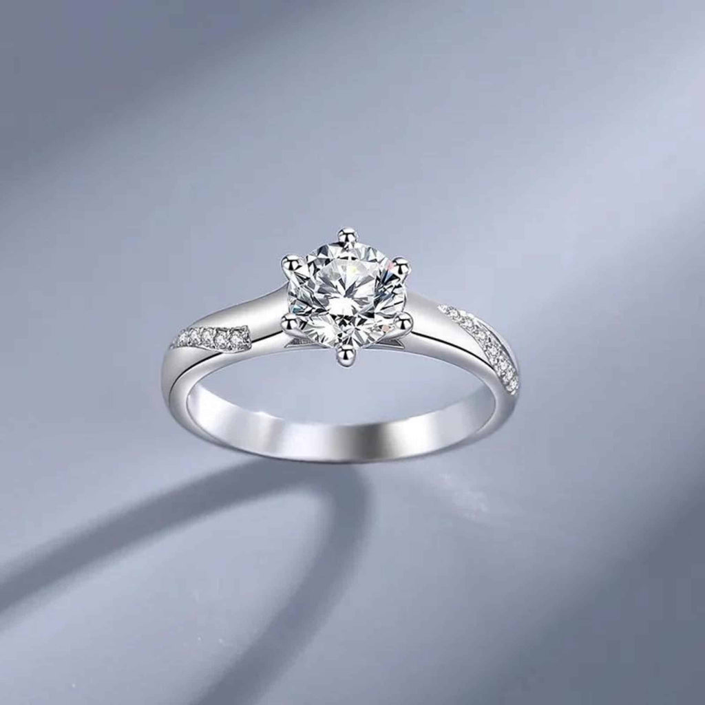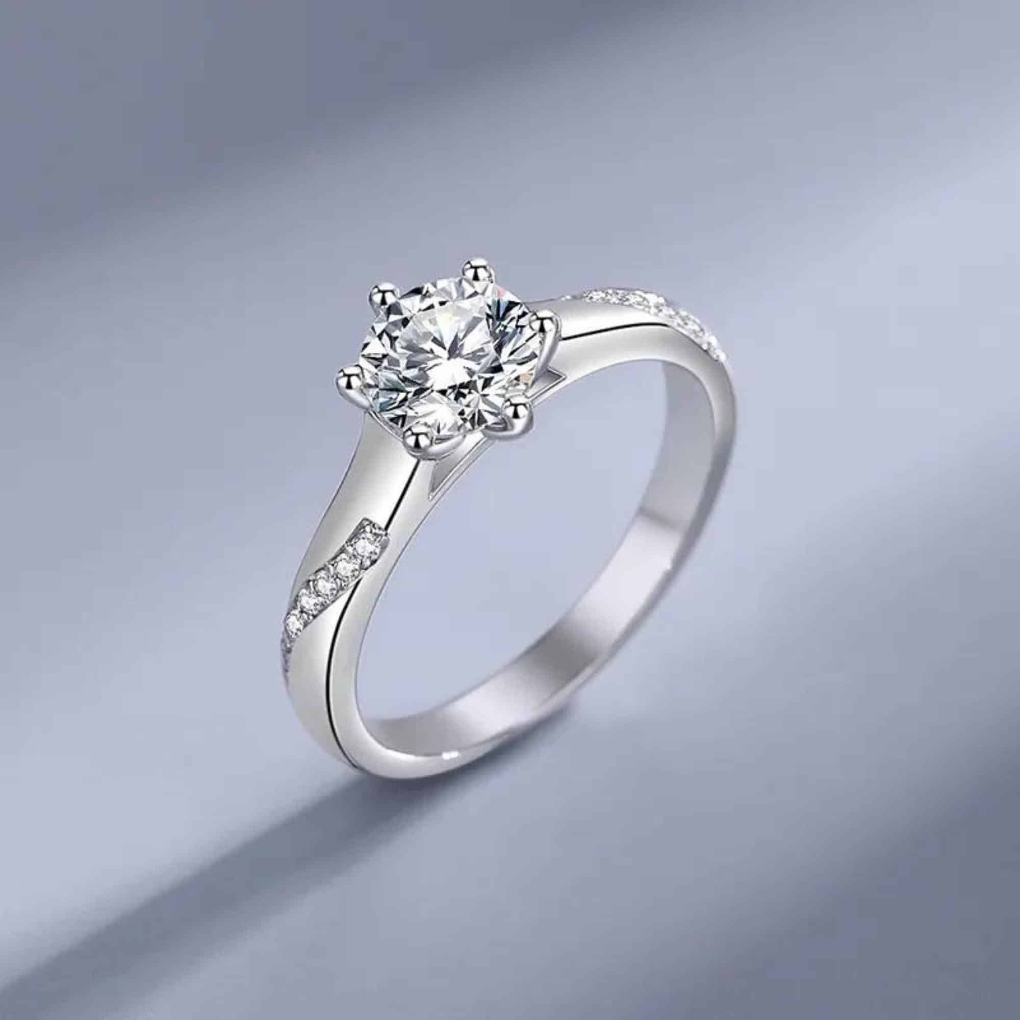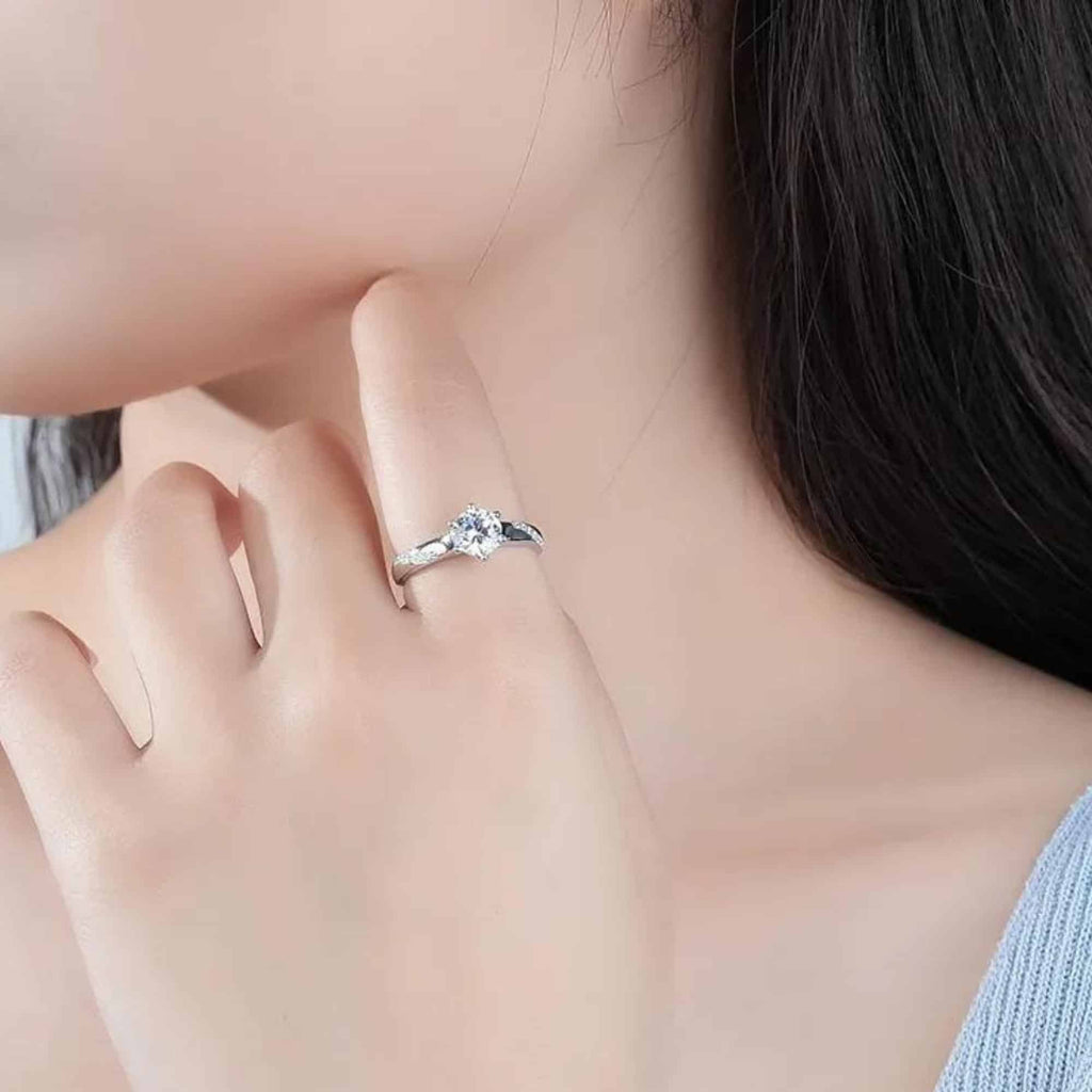 Dompel jezelf onder in de kunst van deze sterlingzilveren ring, voorzien van een boeiende moissanite van één karaat. Het kenmerkende gebroken motief, aangevuld met asymmetrisch geplaatste zirkoniastenen, creëert een aura van verfijnde elegantie. Deze ring overbrugt de kloof tussen chic overdag en glamour in de avond en voegt een unieke twist toe aan elke outfit.