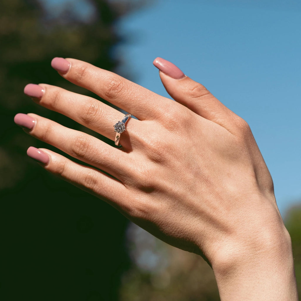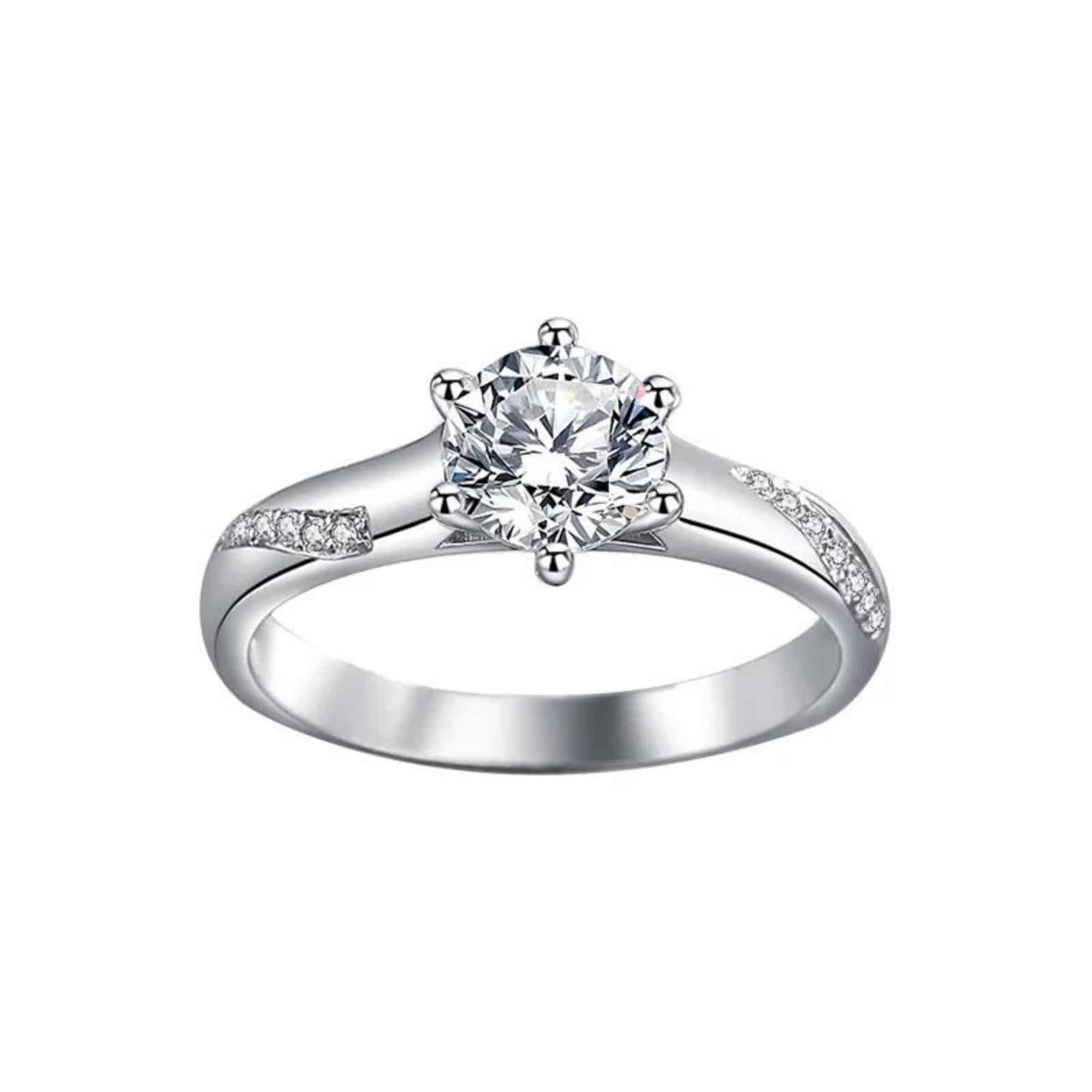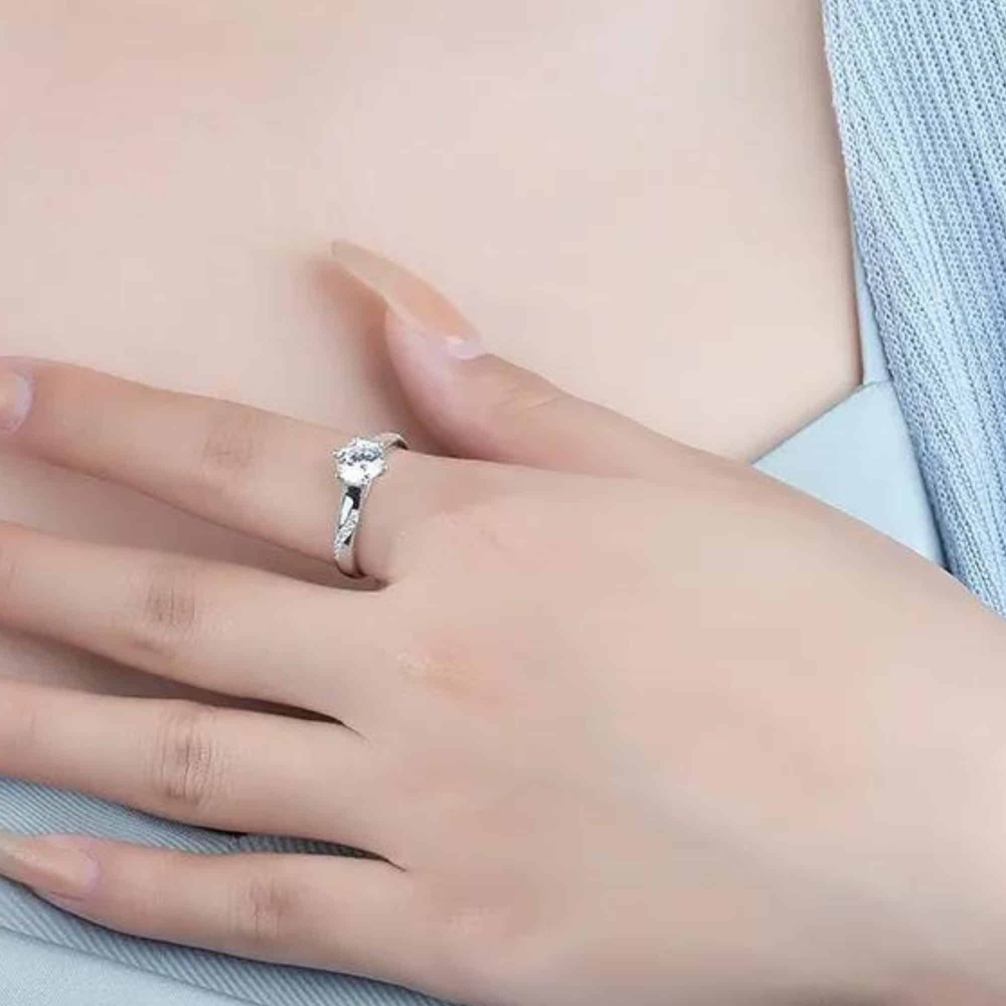 Dompel jezelf onder in de kunst van deze sterlingzilveren ring, voorzien van een boeiende moissanite van één karaat. Het kenmerkende gebroken motief, aangevuld met asymmetrisch geplaatste zirkoniastenen, creëert een aura van verfijnde elegantie. Deze ring overbrugt de kloof tussen chic overdag en glamour in de avond en voegt een unieke twist toe aan elke outfit.