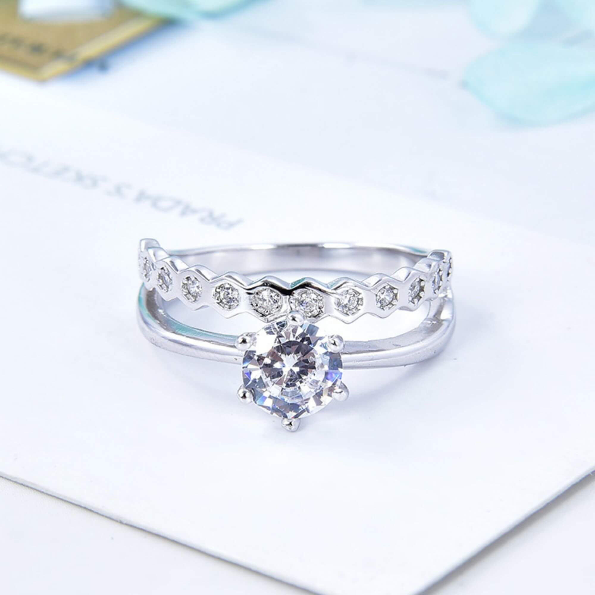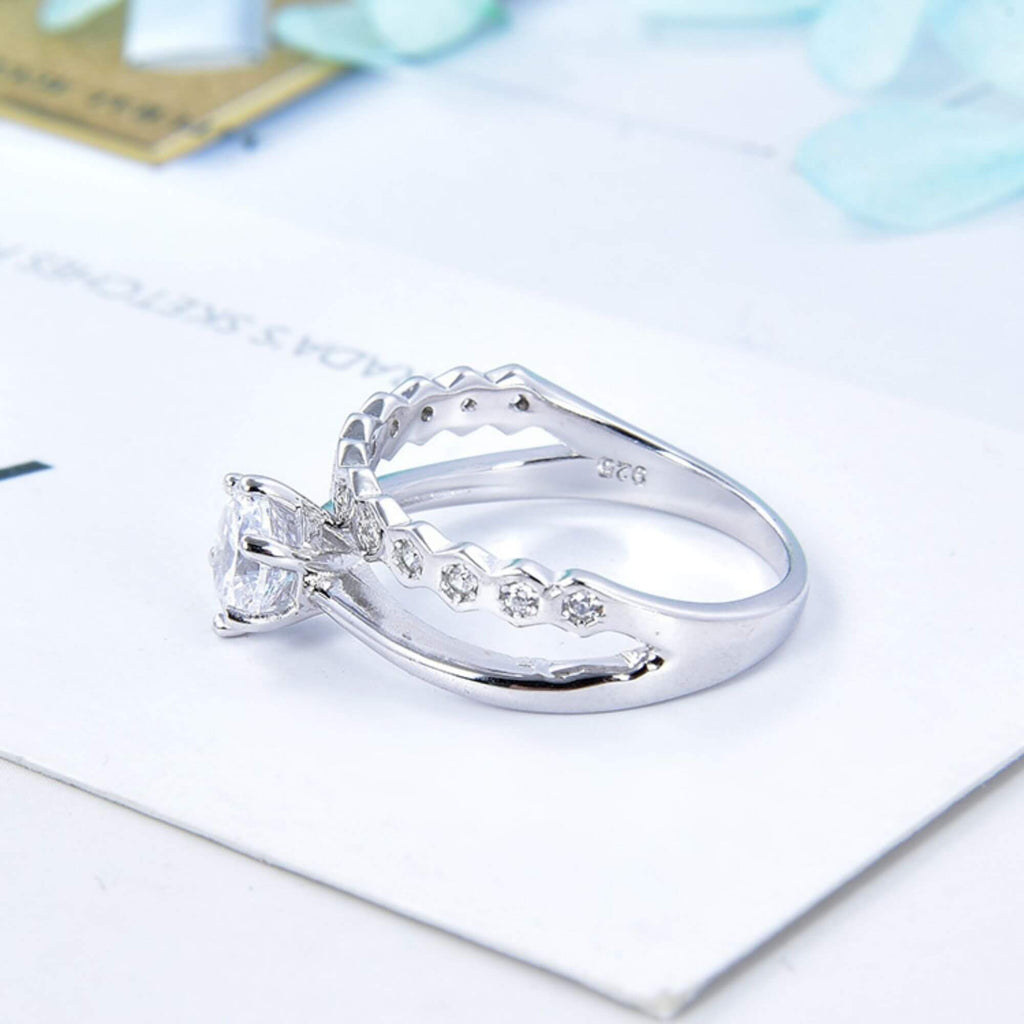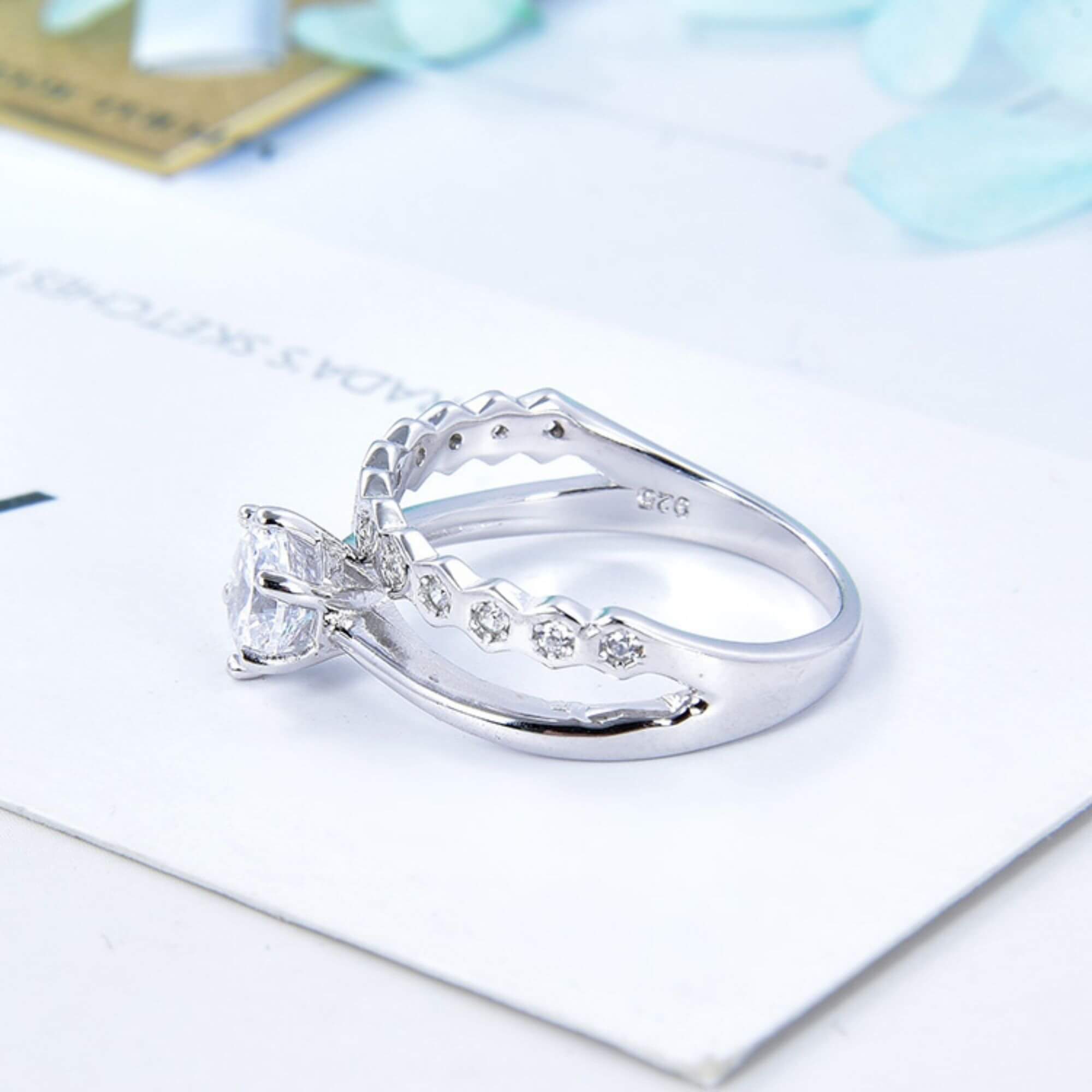 Verdiep je in het intrigerende ontwerp van deze zilveren ring, waarbij een grote zirkoniasteen aan de ene kant een dans van licht en schaduw creëert en kleinere stenen aan de andere kant. Dit fantasierijke stuk wekt de illusie van twee perfect bij elkaar passende ringen, waardoor een element van mysterie en fascinatie aan het algehele uiterlijk wordt toegevoegd.