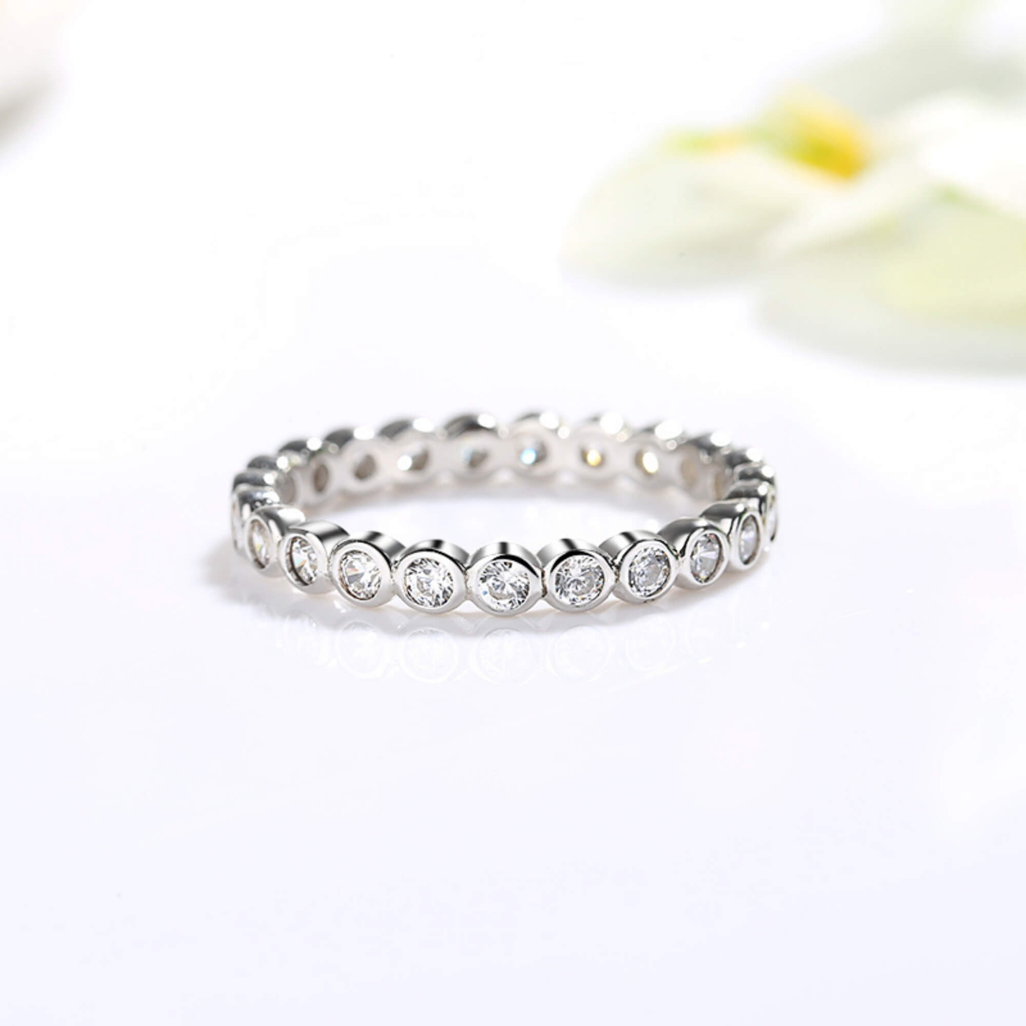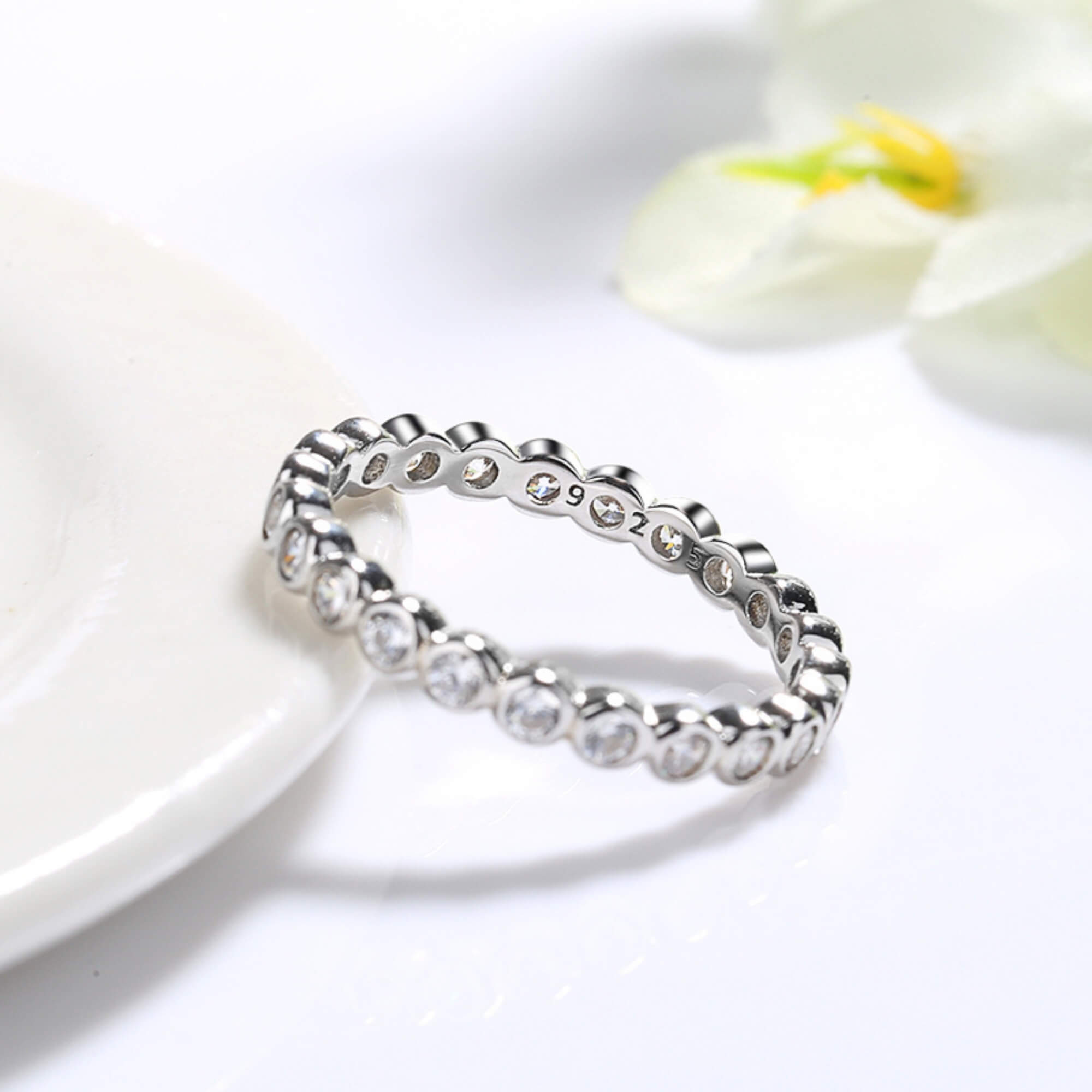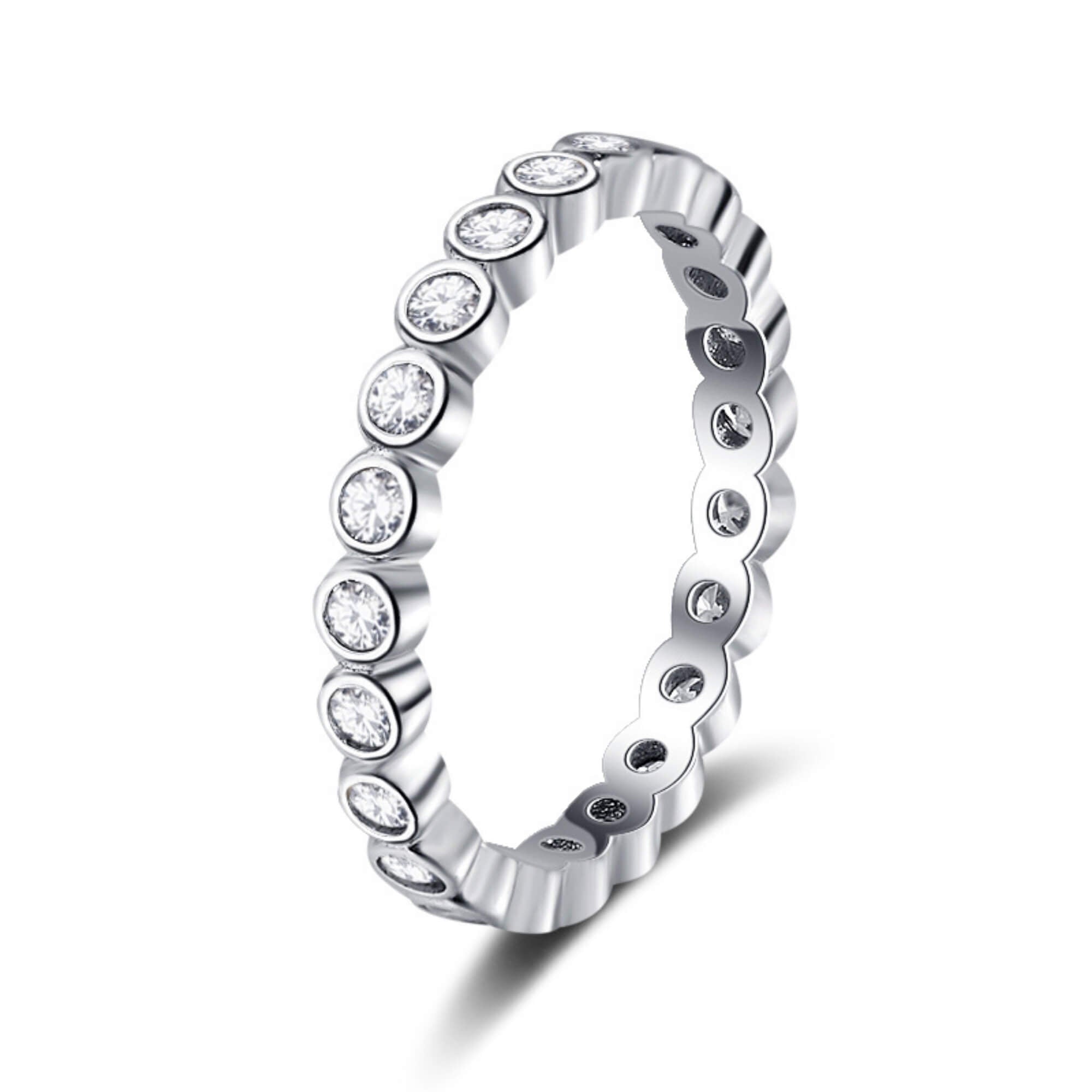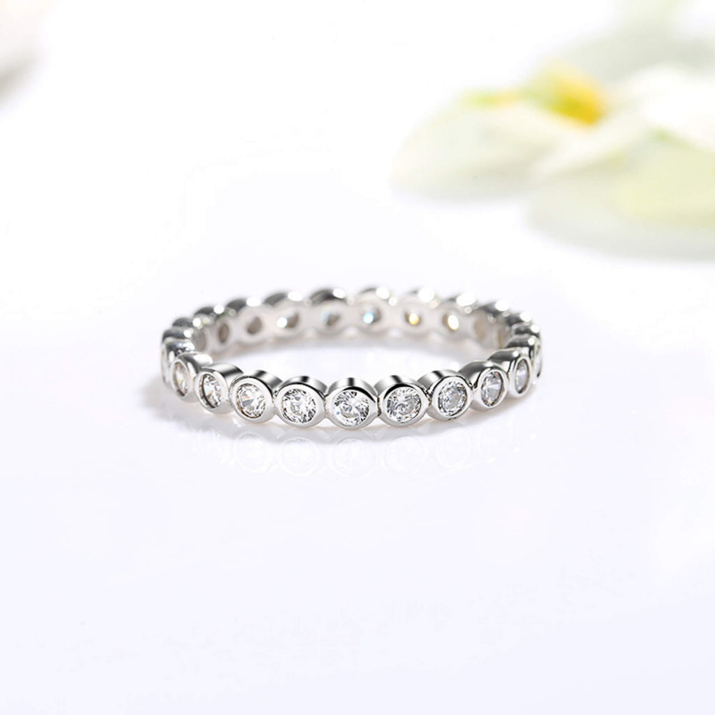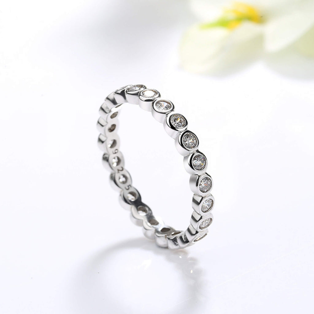 Omhul je vinger in een cirkel van elegantie met deze sterlingzilveren ring, op ingewikkelde wijze versierd met een doorlopende band van fonkelende zirkoniastenen. Dit stuk straalt verfijning uit en voegt een verfijnde toets toe aan uw kleding. Of je je nu verkleedt voor een gala of je dagelijkse look accentueert, deze ring is een symbool van schoonheid en gratie.